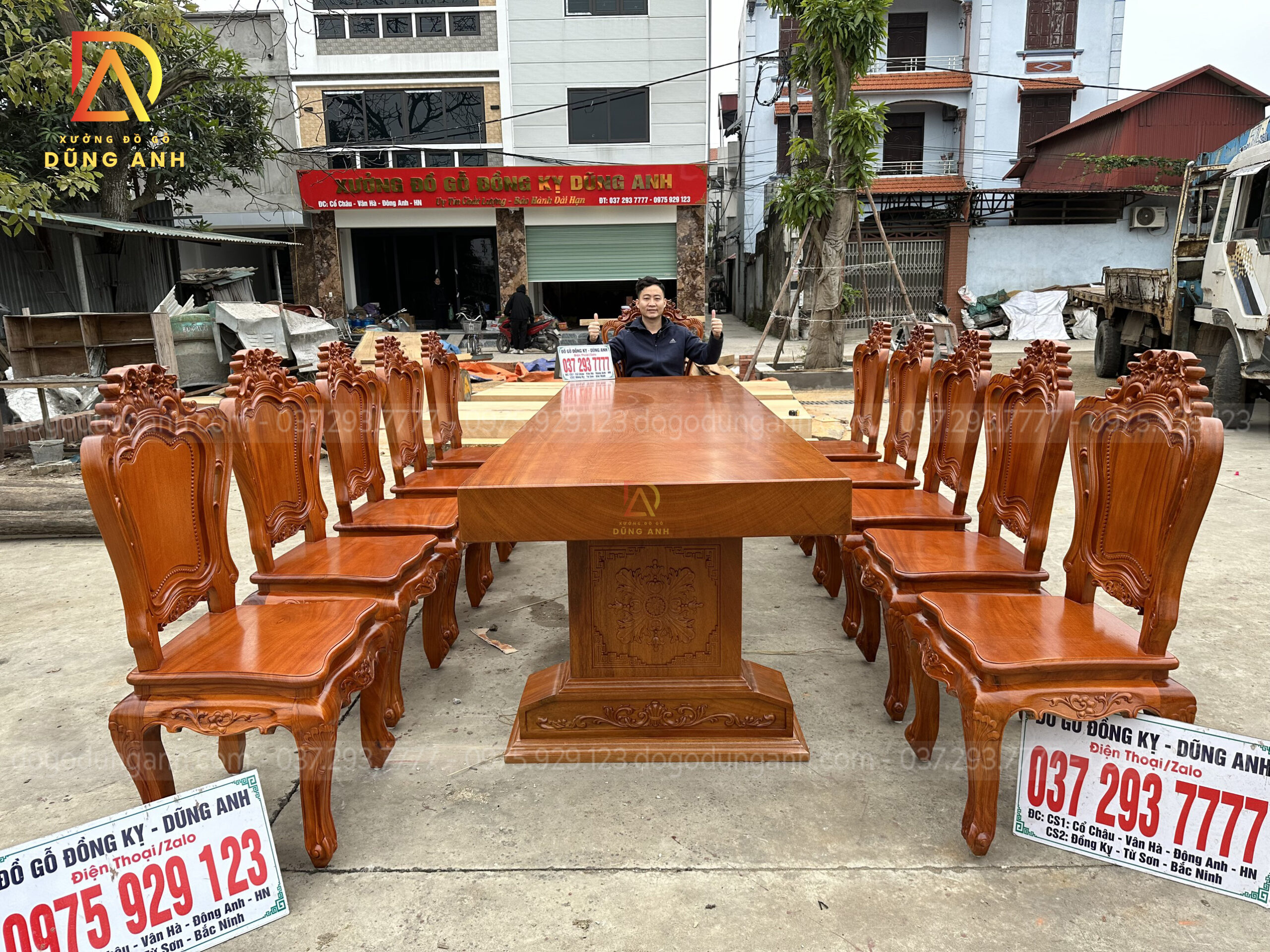 Bộ sản phẩm bàn nguyên khối kết hợp cùng 10 ghế Louis Hàng Gia cổ điển được chế tác 100% từ gỗ gõ đỏ