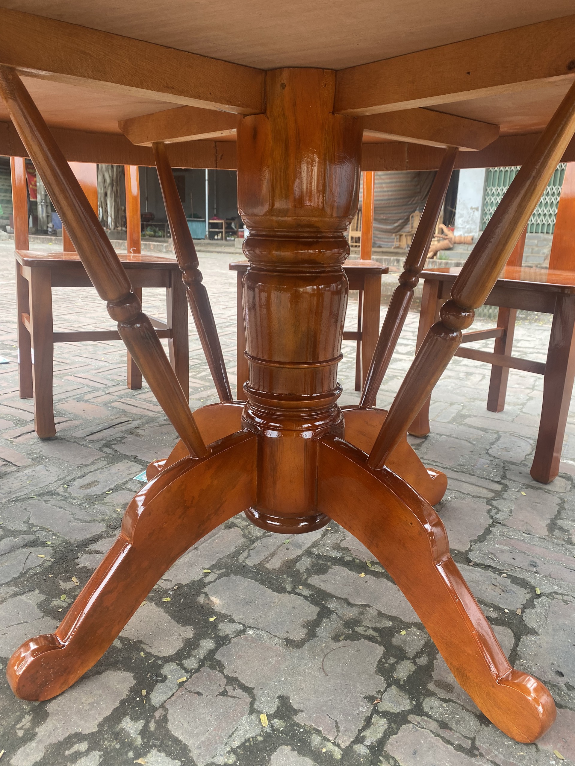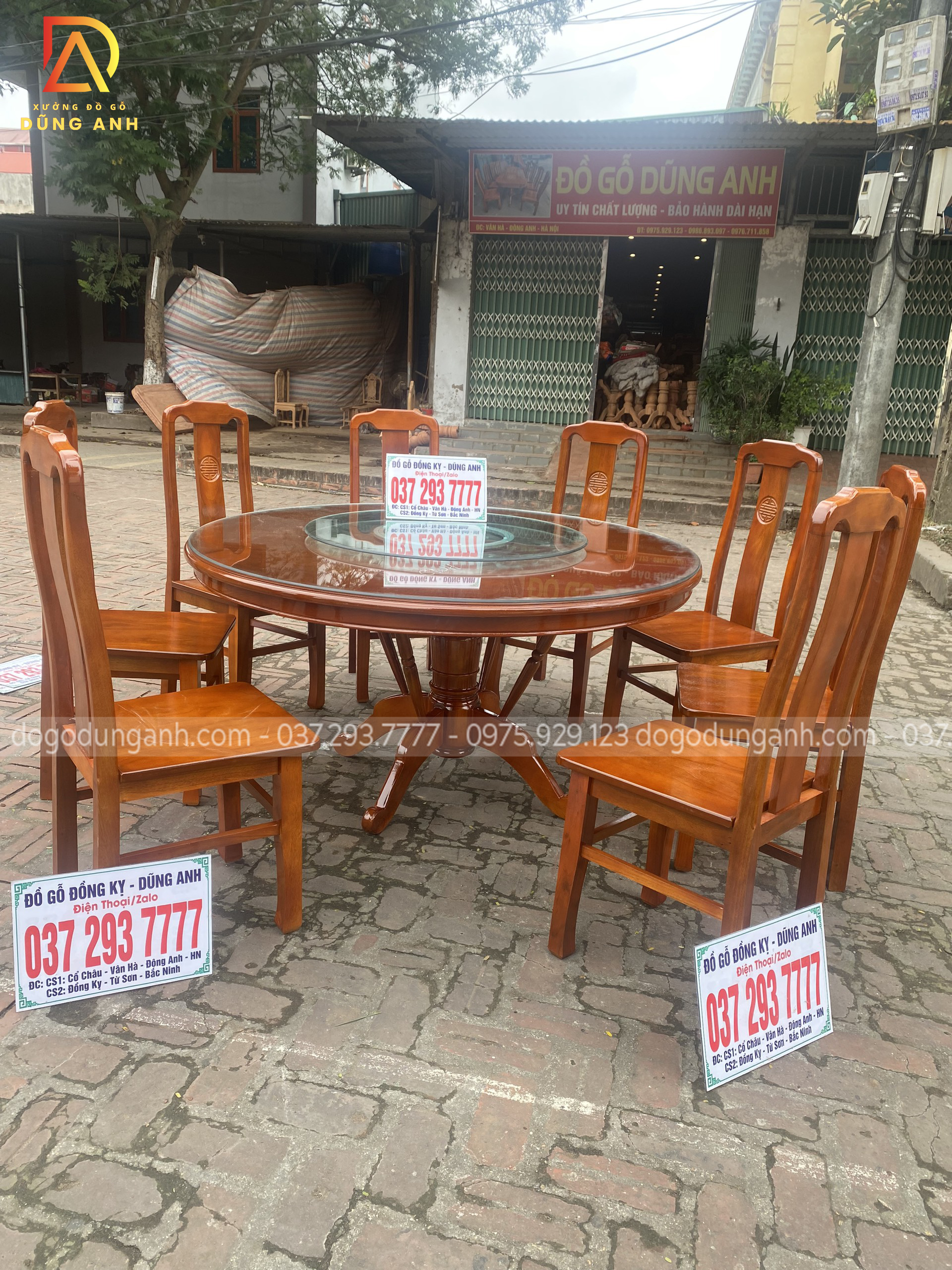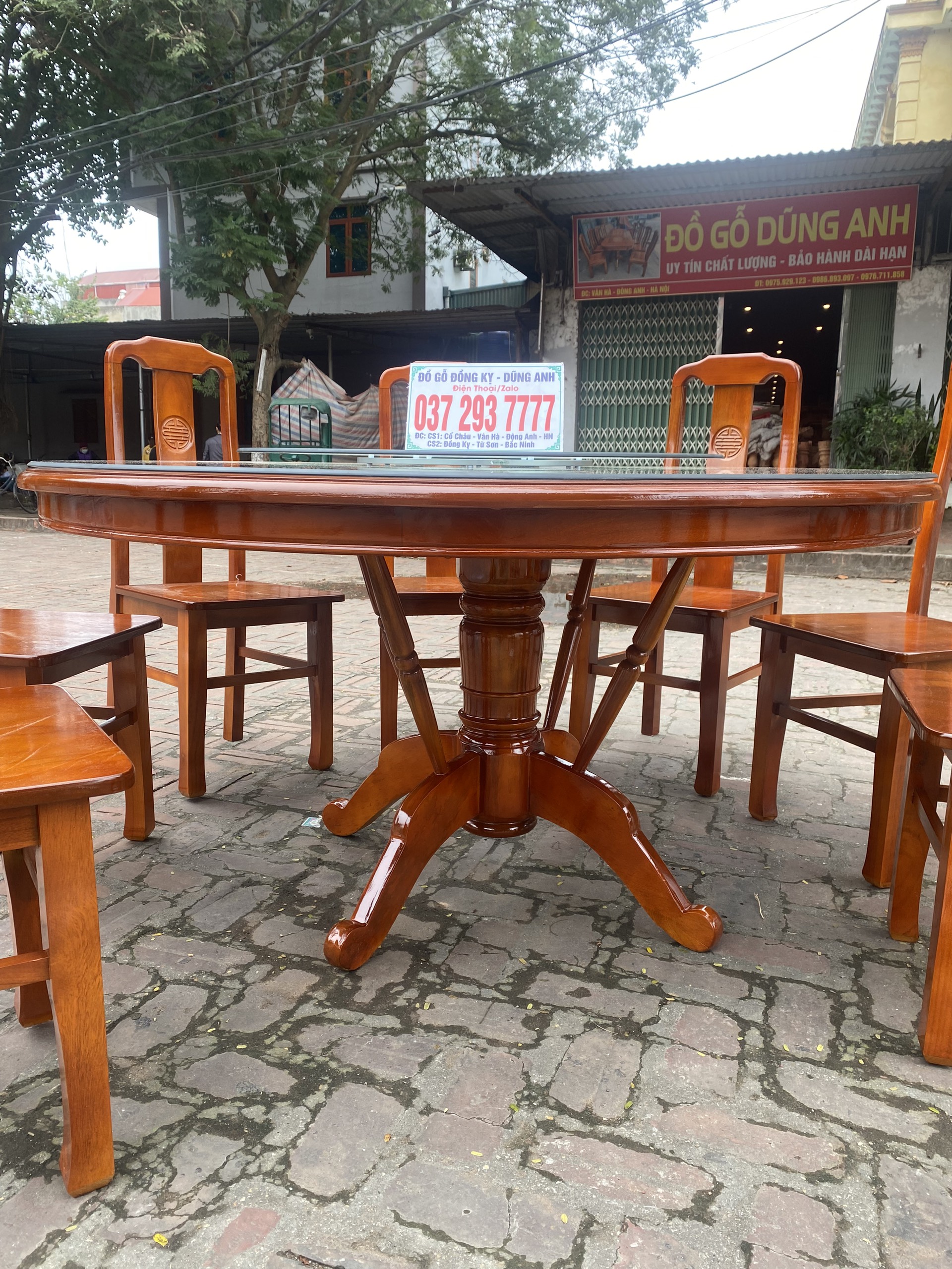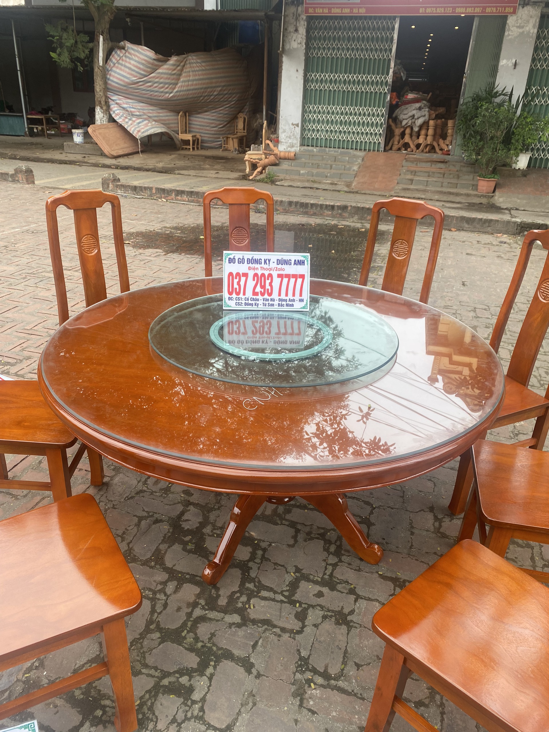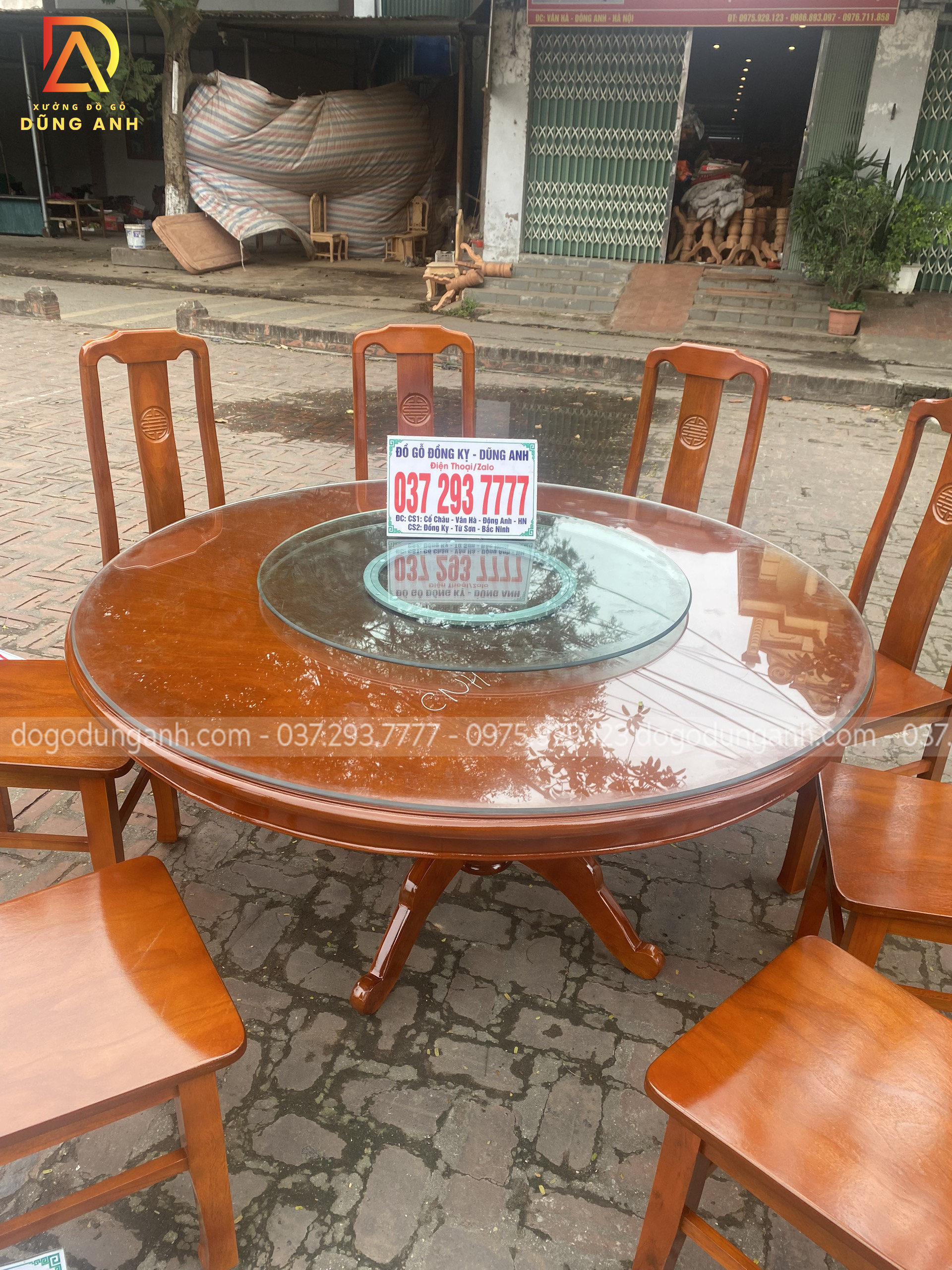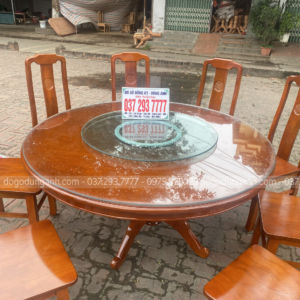 - Bên em còn đặc biệt làm thêm một chiếc mâm xoay, ưu điểm dễ thấy nhất của bàn ăn có mâm xoay đó là sự tiện ích trong ăn uống. Về giá trị thẩm mỹ và đẳng cấp cũng không thua kém gì so với các mẫu bàn ăn tự nhiên khác.
