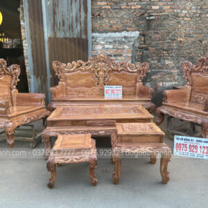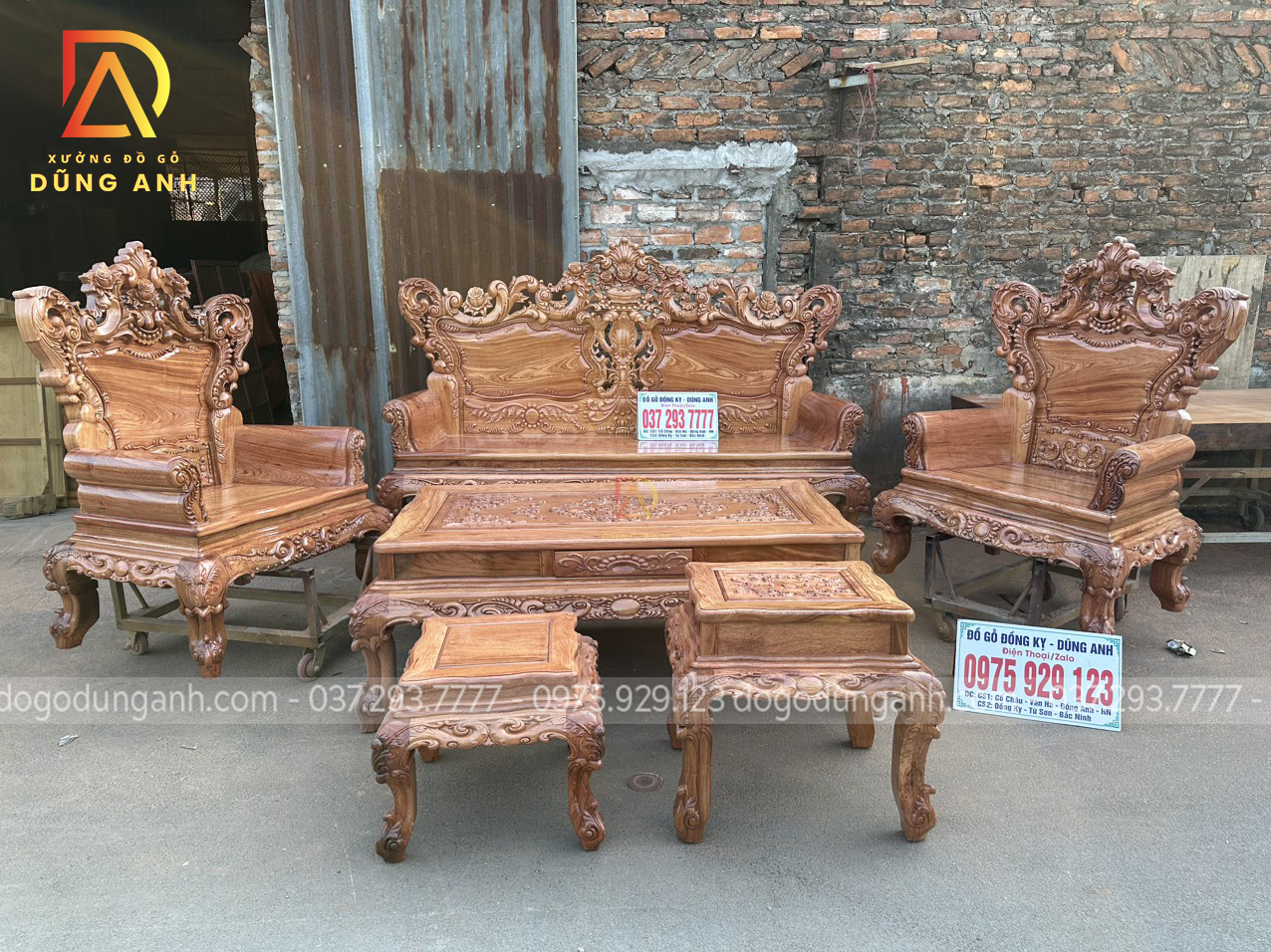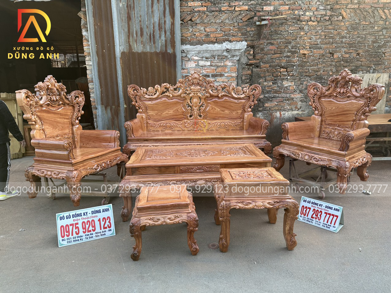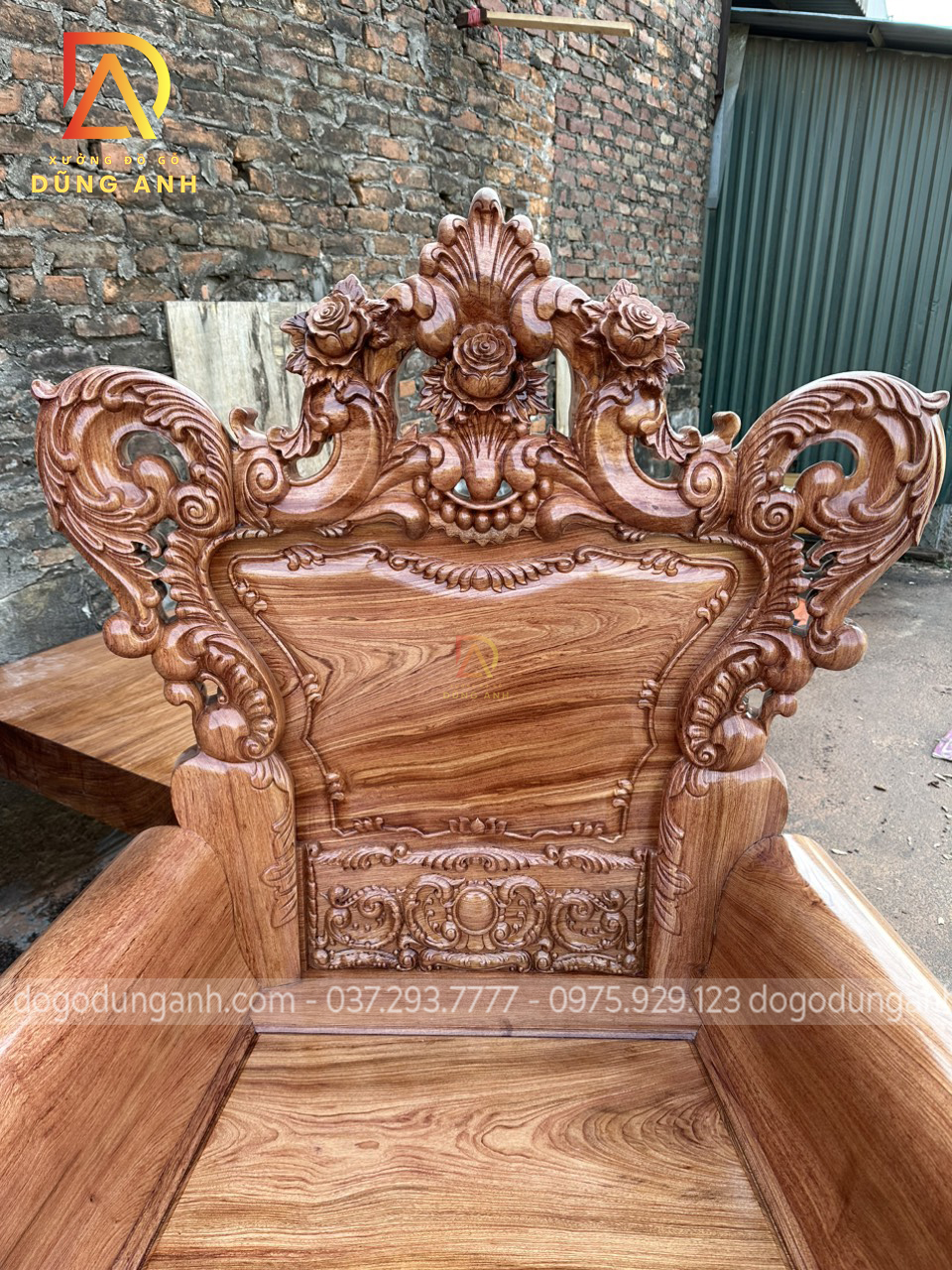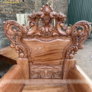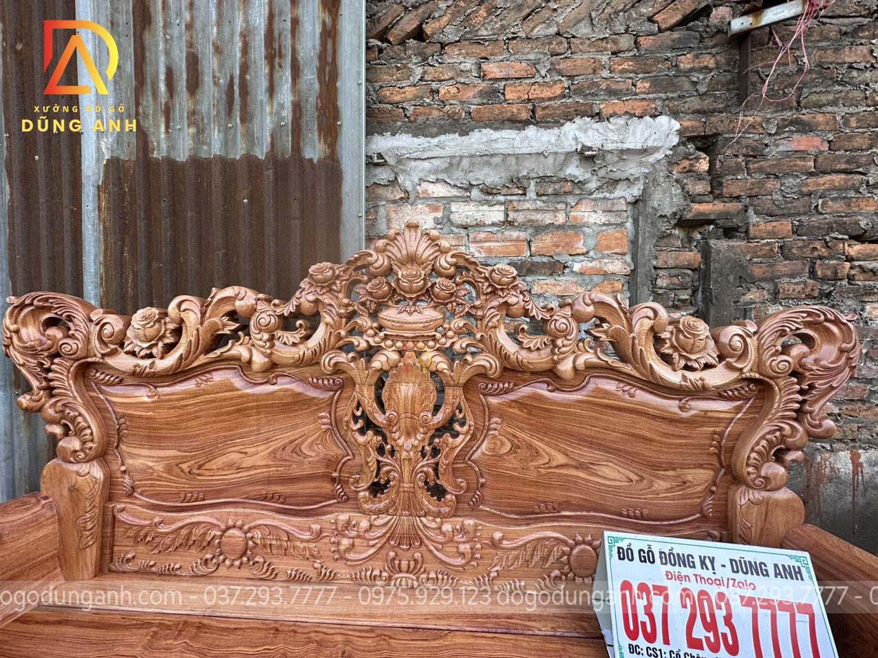 Bộ sản phẩm Xưởng đồ gỗ Dũng Anh bên em chế tác hoàn toàn từ 100% chất liệu gỗ gõ đỏ dòng gỗ cao cấp chất lượng với giá thành khá đắt đỏ. Được xưởng chọn lọc kỹ càng nên đảm bảo độ đanh chắc hoàn hảo để tạo nên các họa tiết đục tinh xảo, nổi bật theo phong cách louis hoàng gia tân cổ điển vô cùng sang trọng và bắt mắt.
