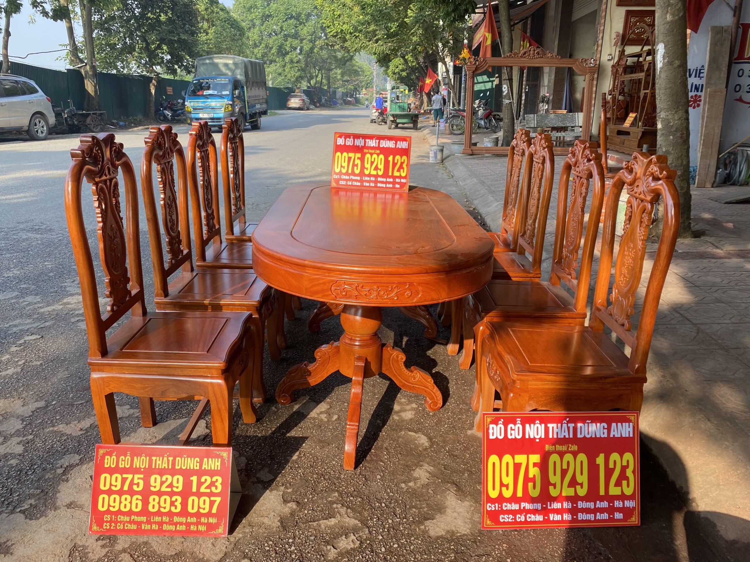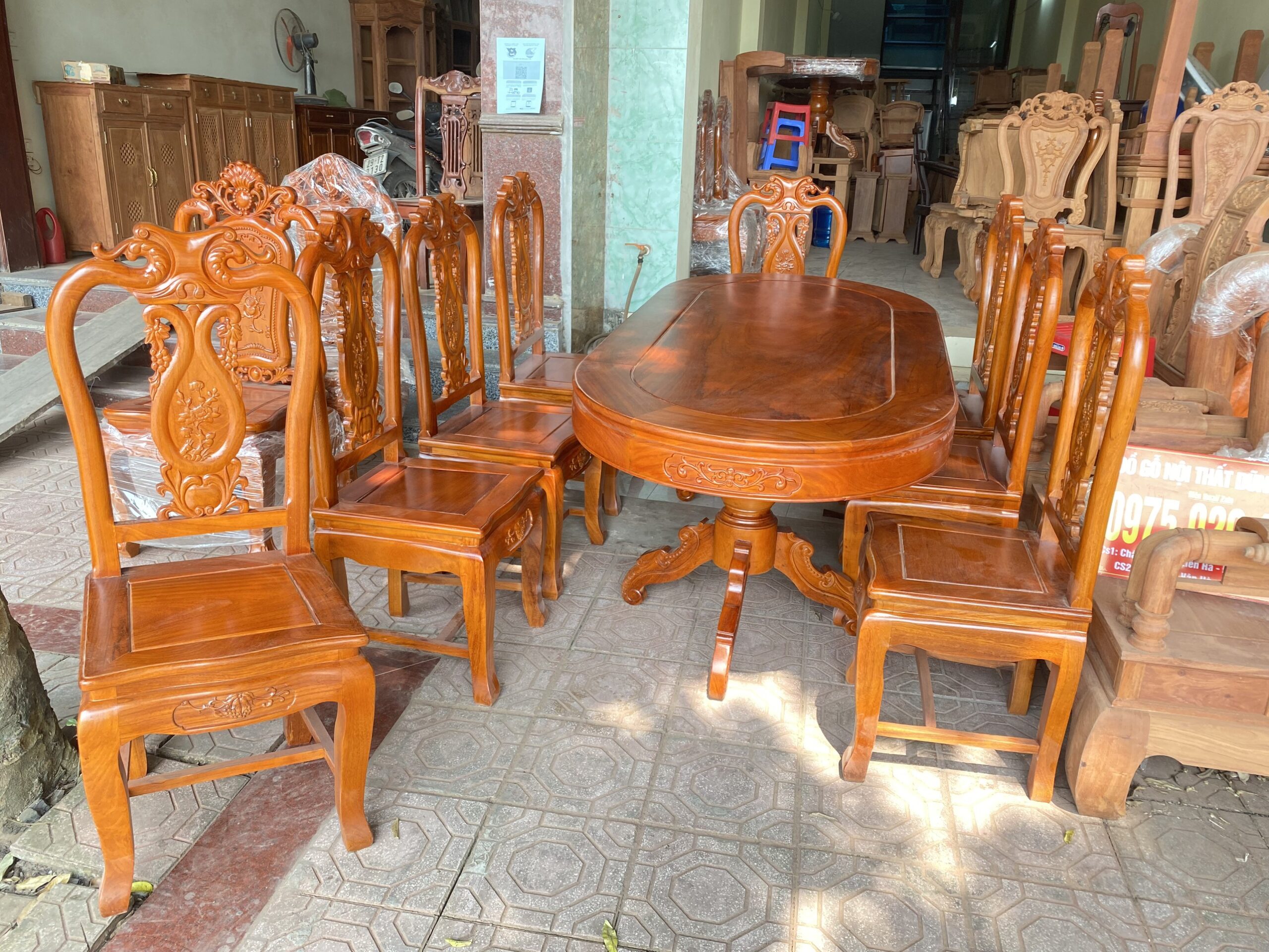 Bàn ghế phòng ăn Chương Voi 8 ghế + bàn bầu dục tượng trưng thịnh vượng tài lộc