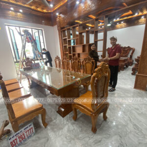 Chất liệu gỗ Gõ Đỏ thì chắc hẳn các vị khách hàng yêu nội thất đều hiểu rõ về nó. Gỗ Gõ Đỏ là loại gỗ quý hiếm, có độ cứng và bền bỉ cao, có khả năng chịu đựng va đập mạnh, chống chịu ẩm, nước rất tốt. Do đó đồ nội thất được làm từ loại gỗ này sẽ có tuổi thọ rất cao. Ngoài ra Gỗ Gõ Đỏ có đường vân rất đẹp với màu nâu đỏ đẹp với hình cuộn xoắn, rõ nét làm tăng thêm độ cuốn hút cho các sản phẩm nội thất . Vậy nên , Xưởng đồ gỗ Dũng Anh xin giới thiệu với quý vị bộ sản phẩm 10 ghế Louis Hoa Hồng kết hợp với bàn nguyên khối với chất liệu gỗ Gõ Đỏ cực kì SANG TRỌNG và ĐẲNG CẤP .