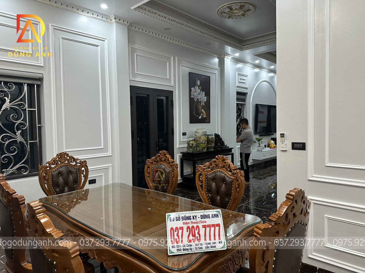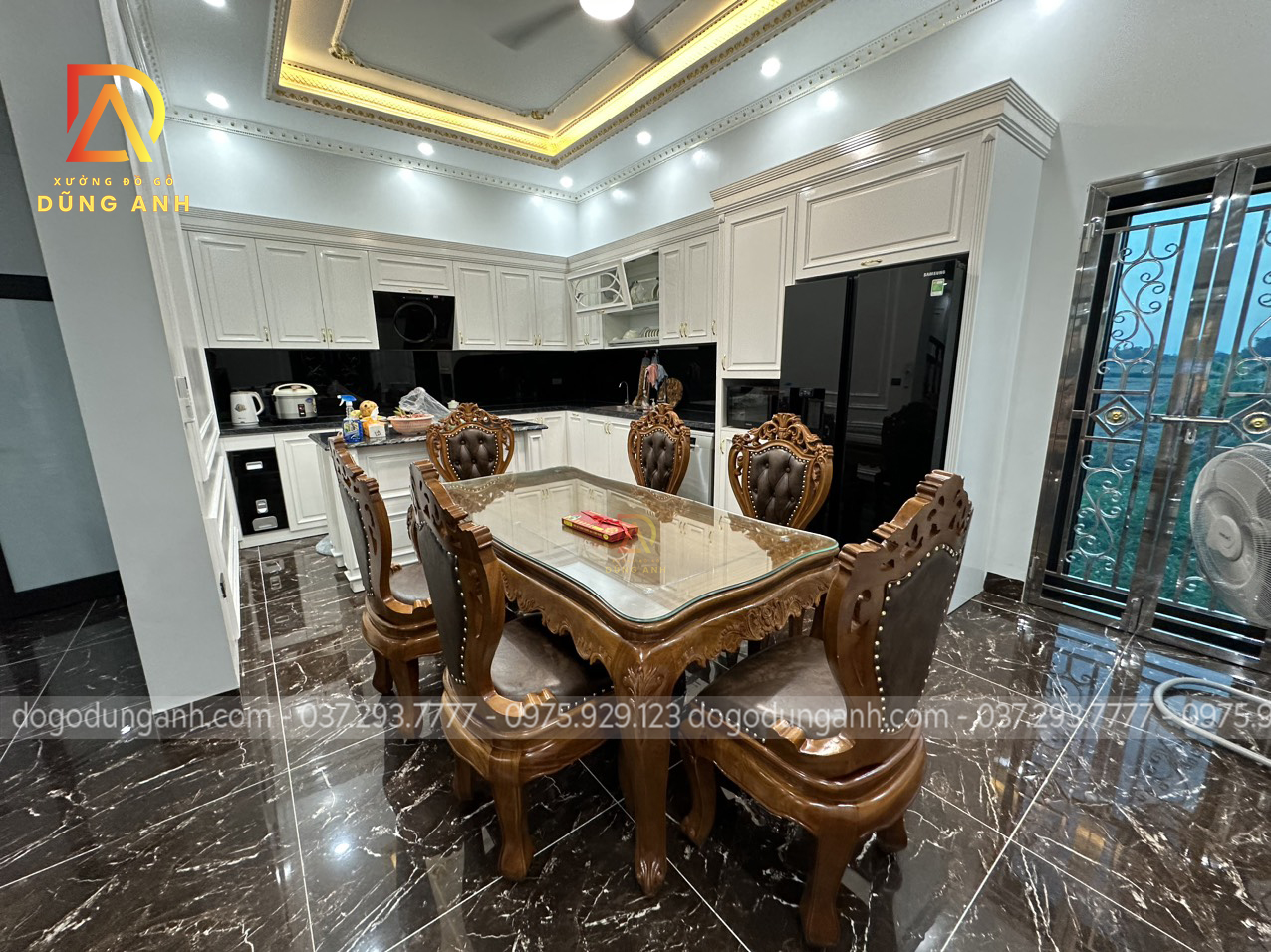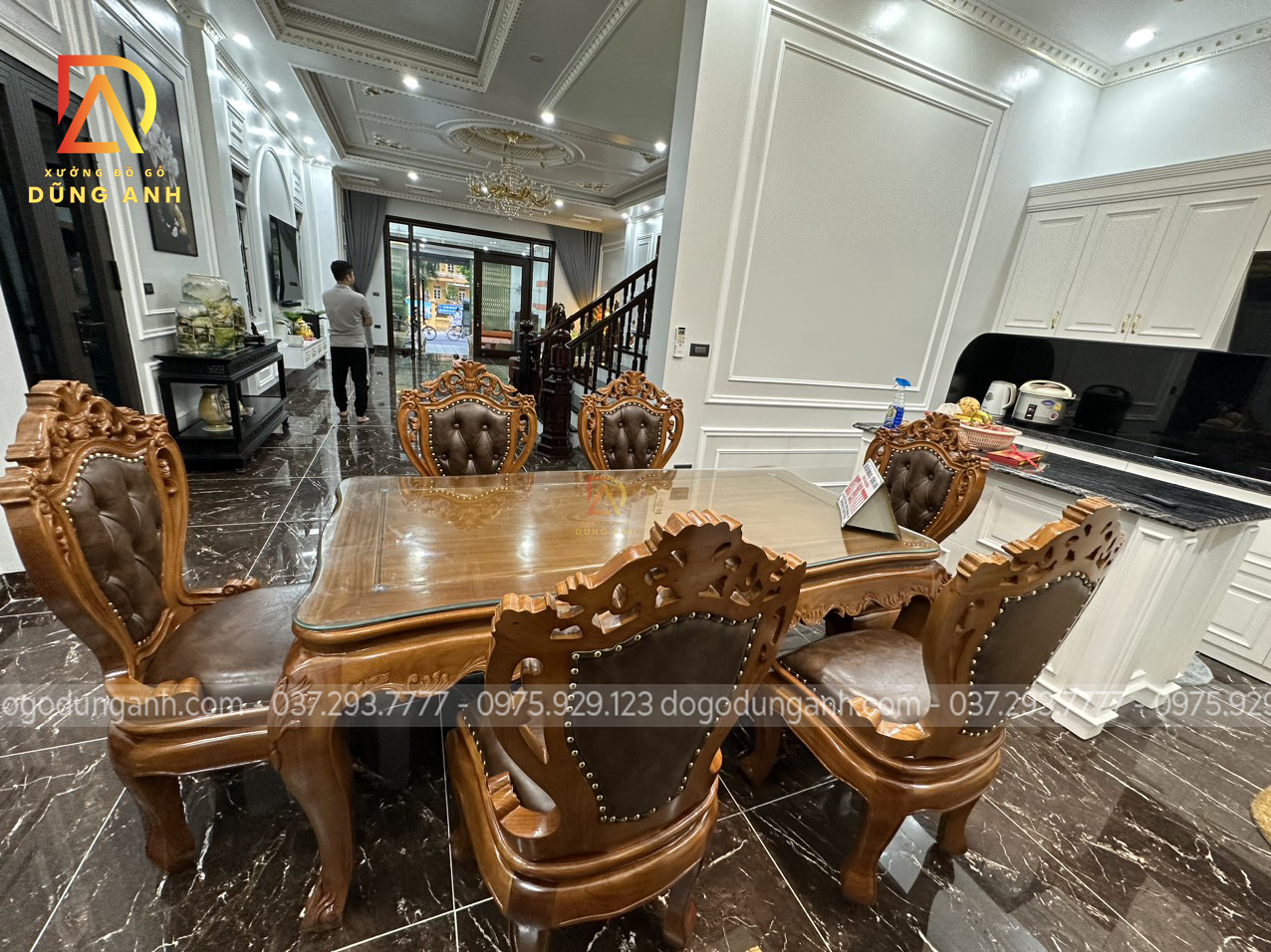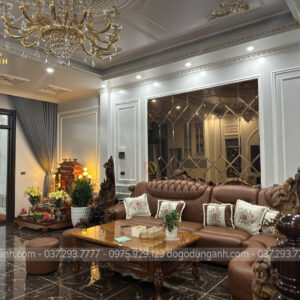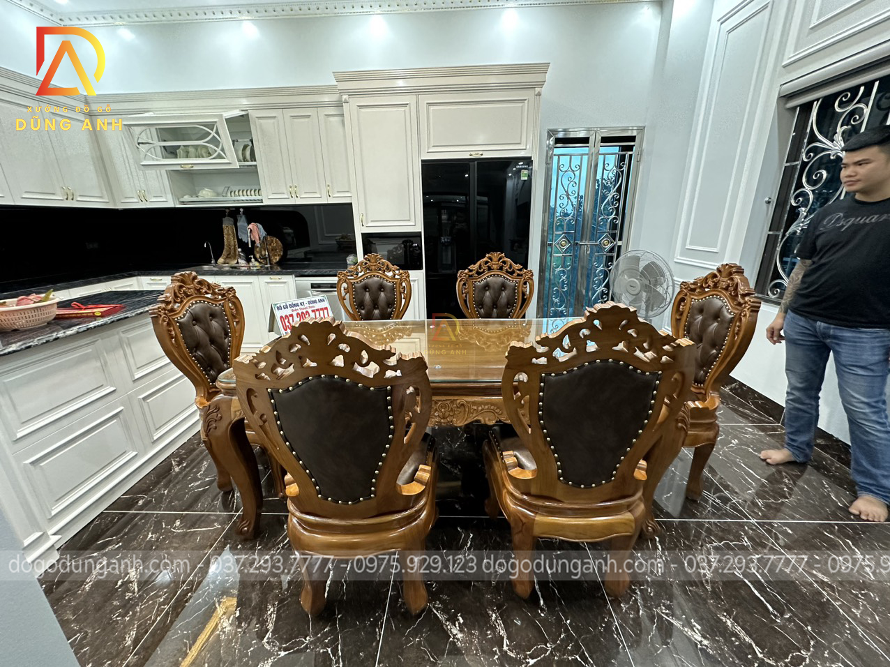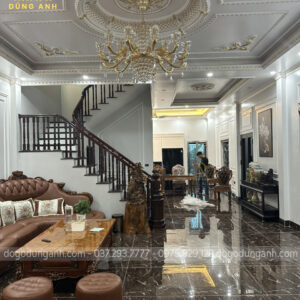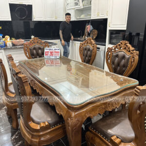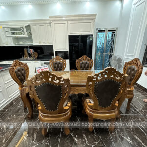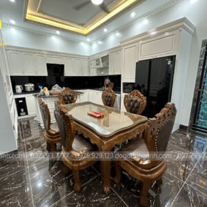 Bộ bàn ghế ăn nhà anh Dũng được thiết kế theo phong cách hoàng gia tân cổ điển Châu Âu với diện mạo vô cùng nổi bật mang lại vẻ đẹp sang trọng, thời thượng cho không gian. Đặc biệt thích hợp với những không gian kiến trúc biệt tự tân cổ điển như nhà anh Dũng.