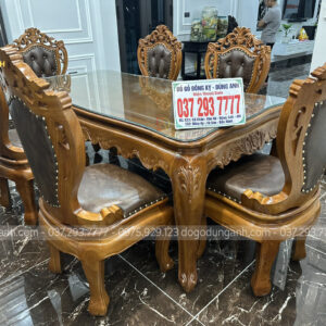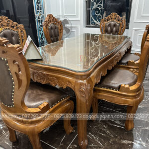 Mẫu bàn ăn 6 ghế louis hoa lá tây được tạo hình độc đáo với phần lưng tựa cao có tay kết hợp giữa đỉnh chương gỗ gõ đục hoa lá tây tinh xảo và vách ghế bọc đệm da cao cấp tạo hình trám đẹp mắt mang lại vẻ đẹp sang trọng, đẳng cấp đúng chất hoàng gia Châu Âu.