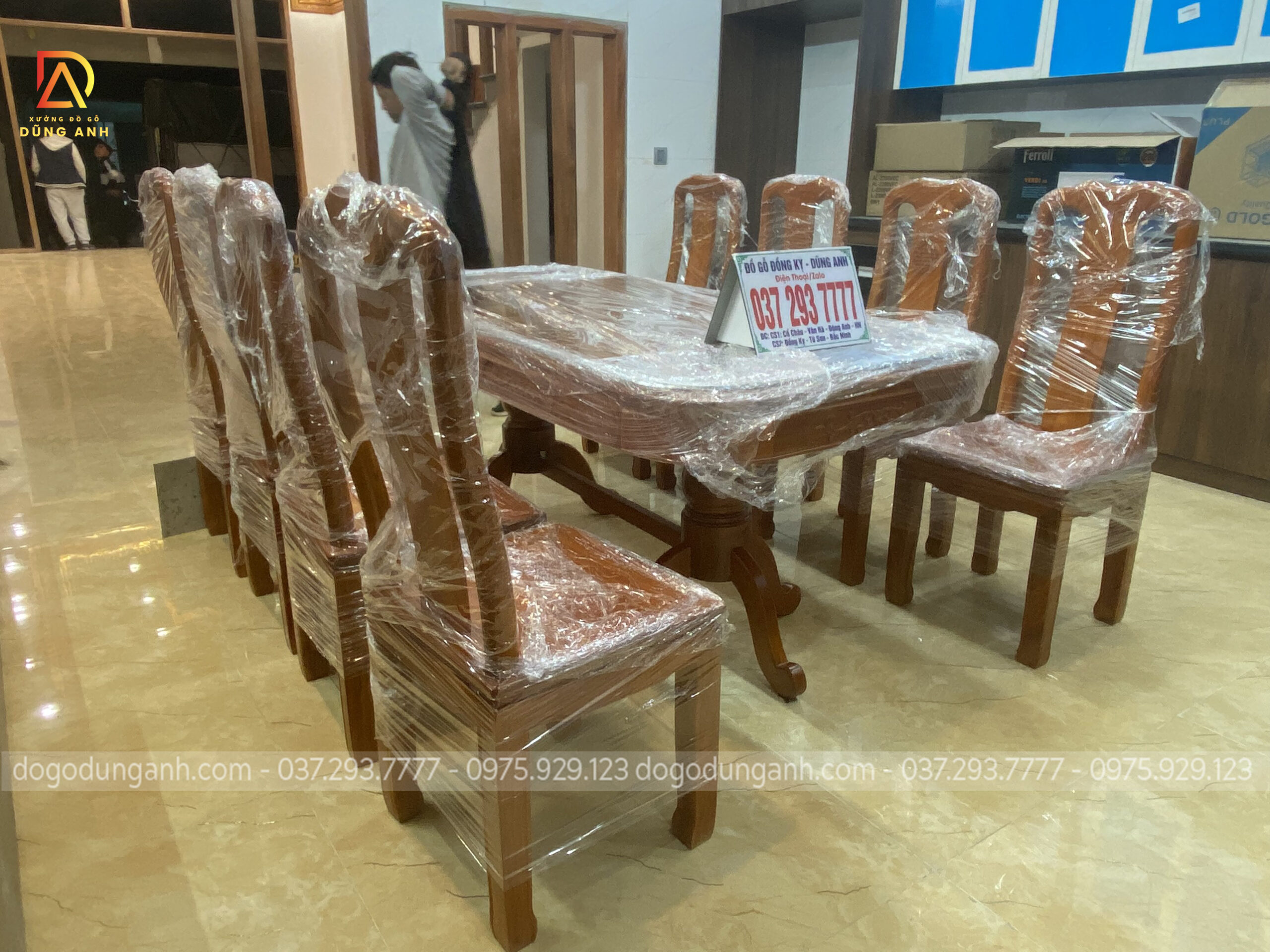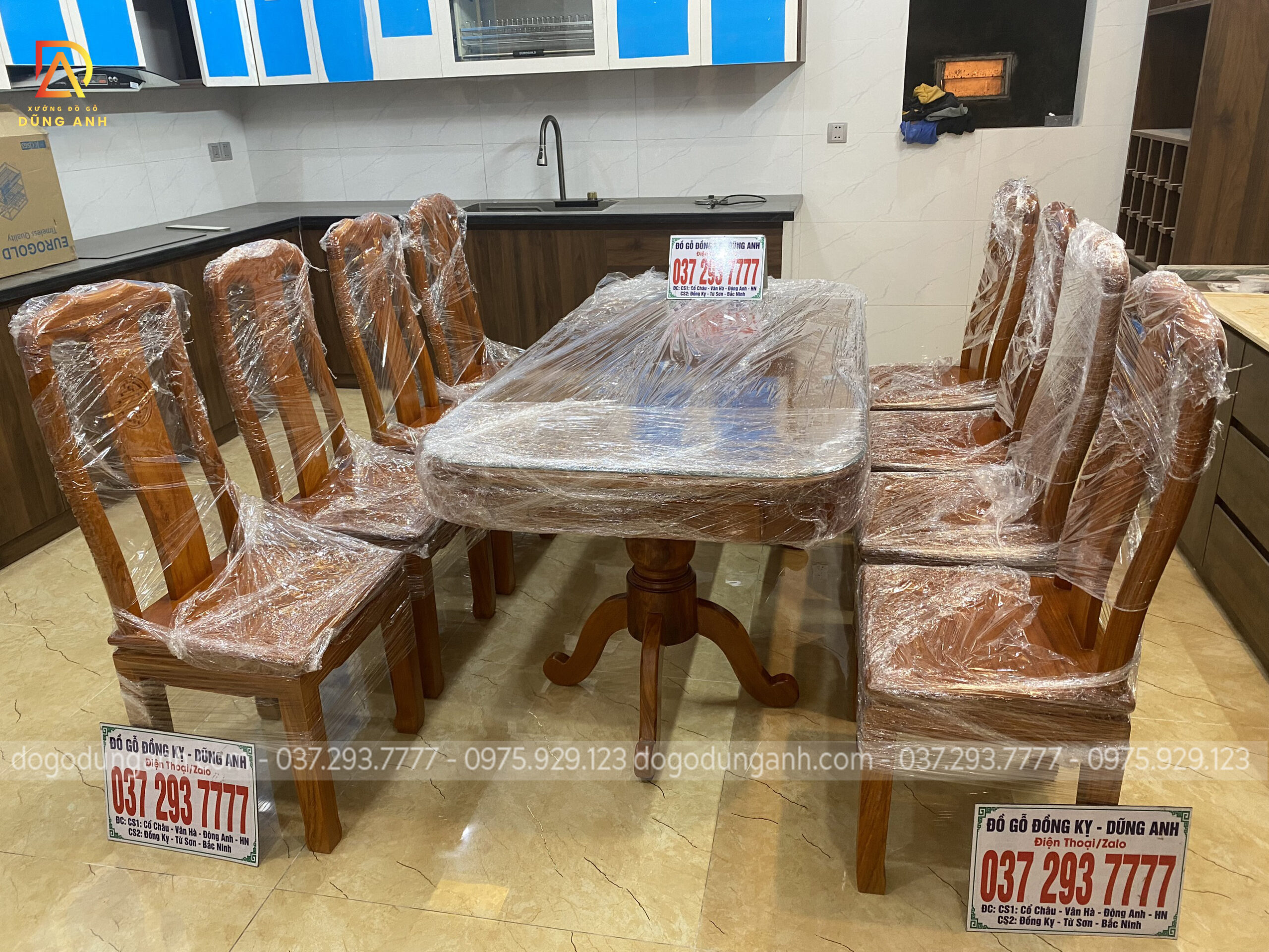 - Bàn ăn kích thước 90x180cmcm, khuôn tranh dày 3cm, ván dày 2cm, yếm bàn 3cm và 8 ghế đơn 42x45cm. với chiều cao 78cm