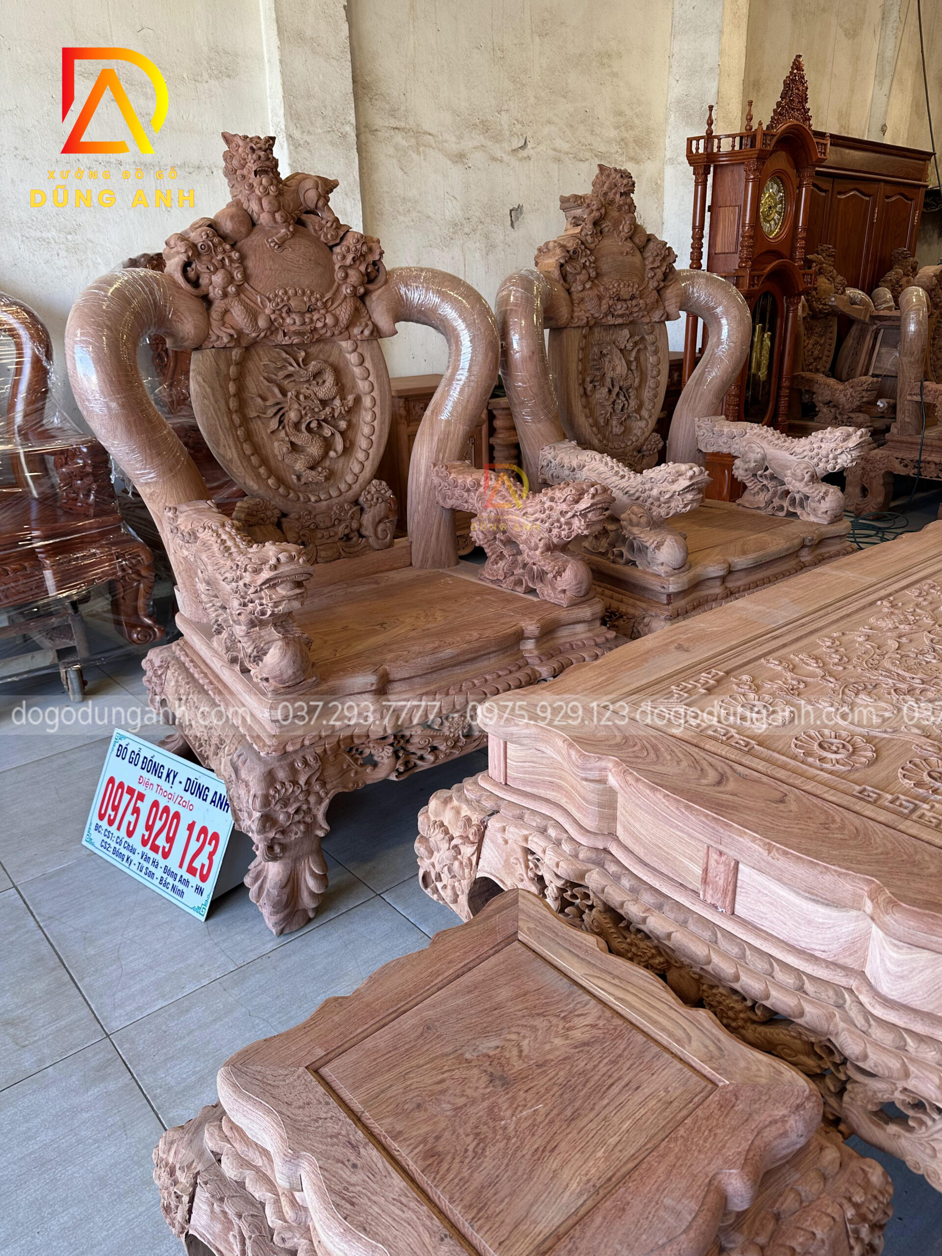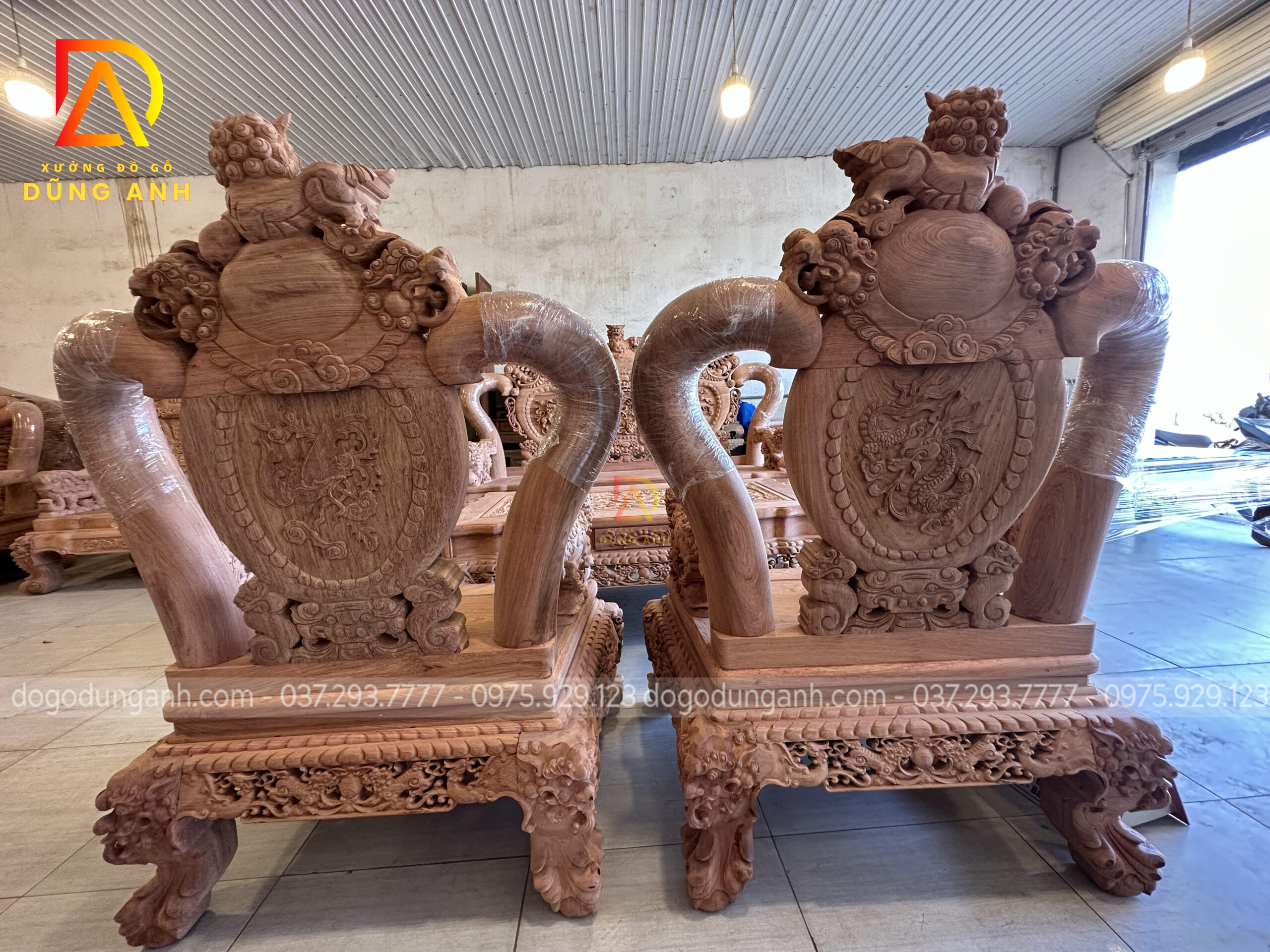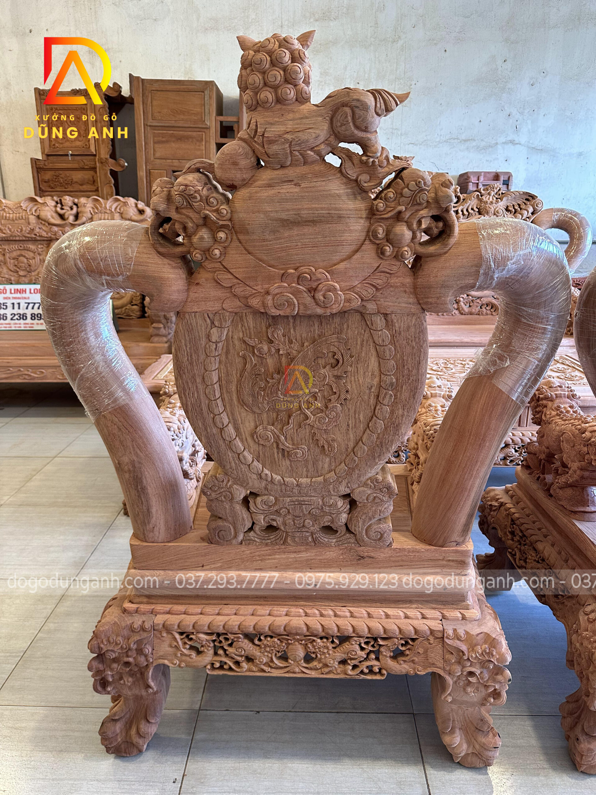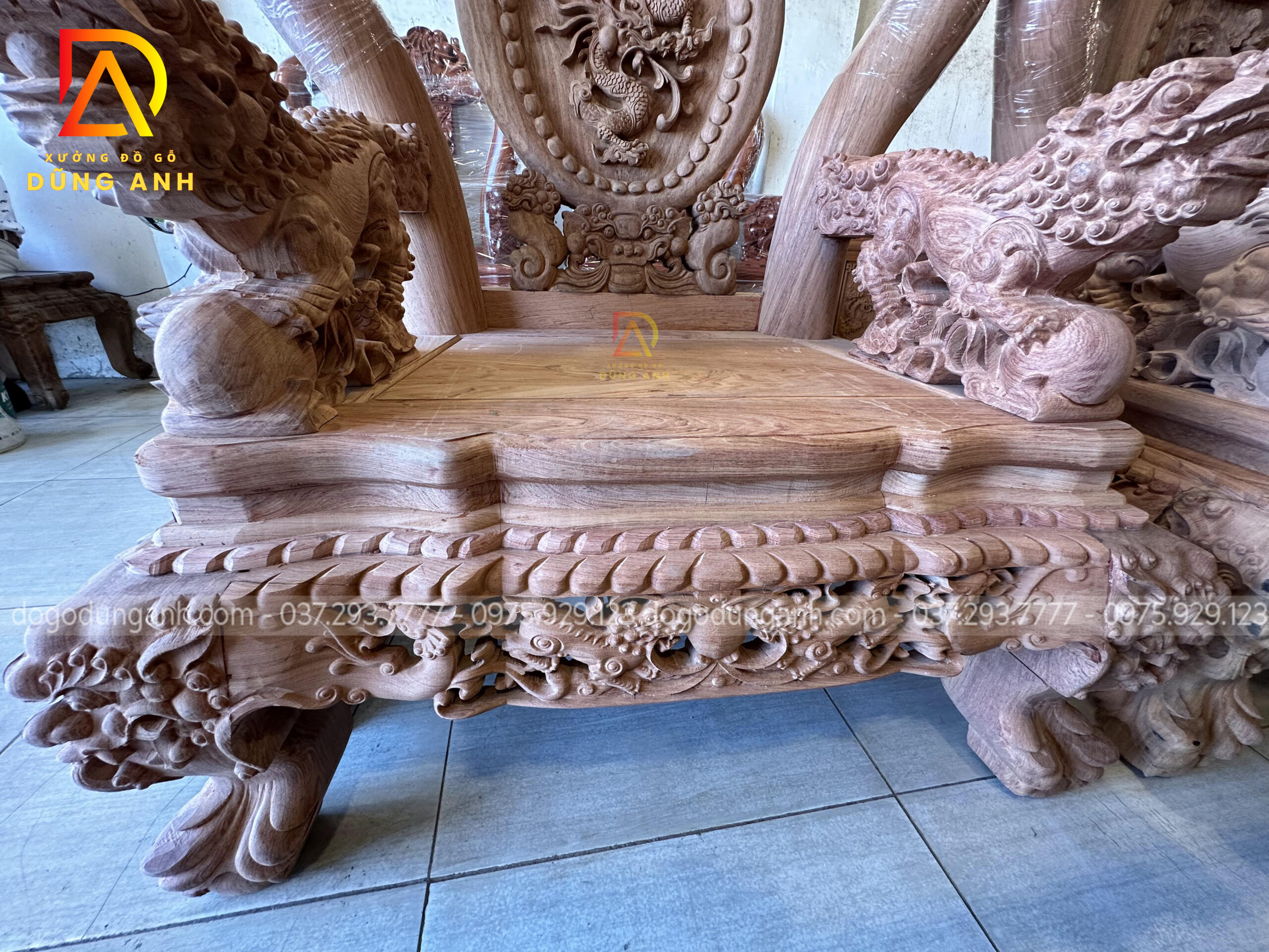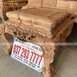 Bộ bàn ghế Minh quốc Nghê Thái Tử có thiết kế vô cùng cầu kỳ và tinh xảo quy tụ đầy đủ các yếu tố tiện nghi, thẩm mỹ và phong thủy. Chắc chắn sẽ làm hài lòng chủ nhân là anh Cường ở miền Nam. Do không đến được trực tiếp đến Xưởng đồ gỗ Dũng Anh để ký nhận mộc nên xưởng đã đưa ra giải pháp kiểm hàng online, dưới đây là ảnh chụp xưởng đã gửi anh Cường xem trước khi lên màu cho bộ sản phẩm chất lượng này.