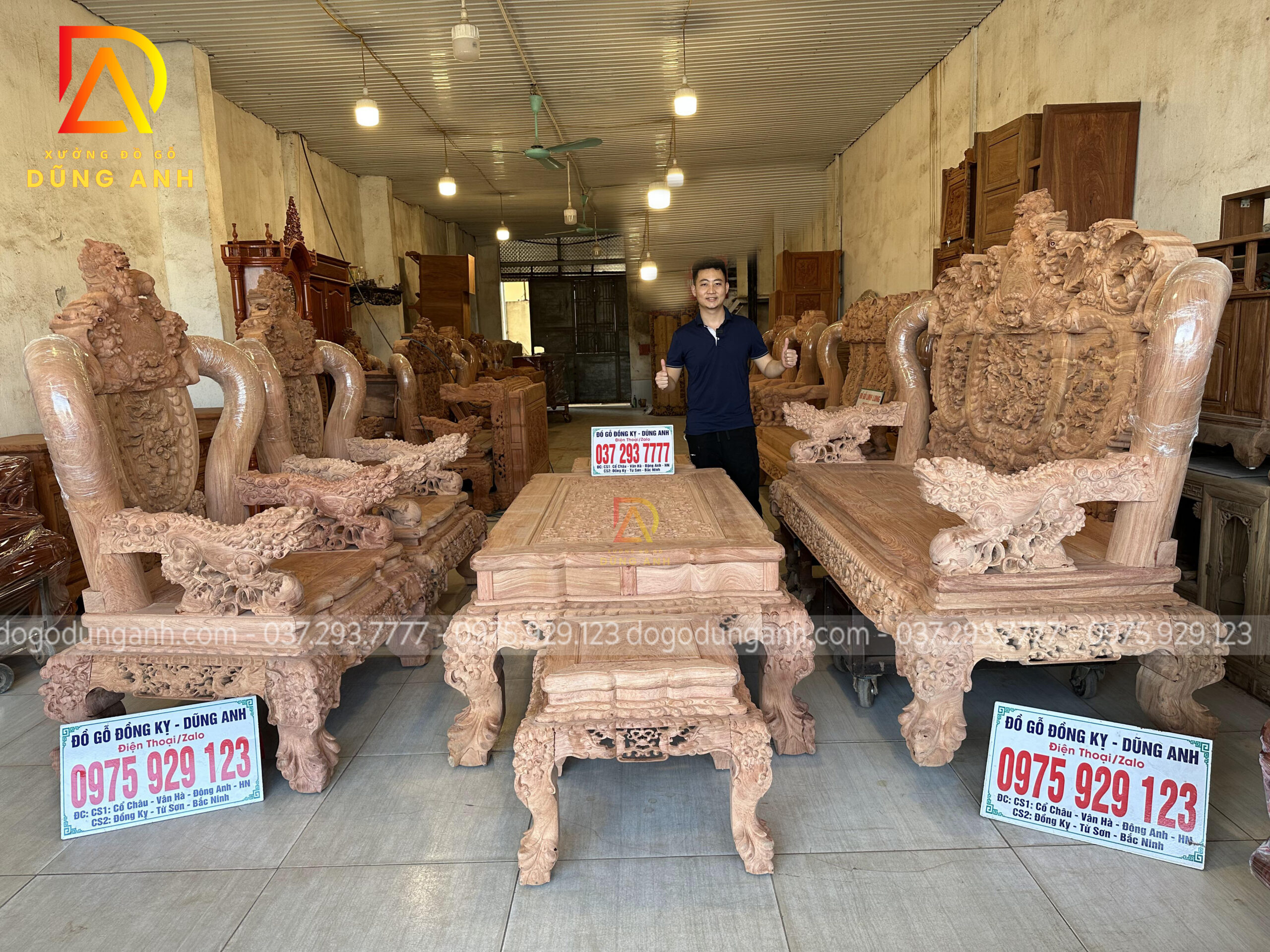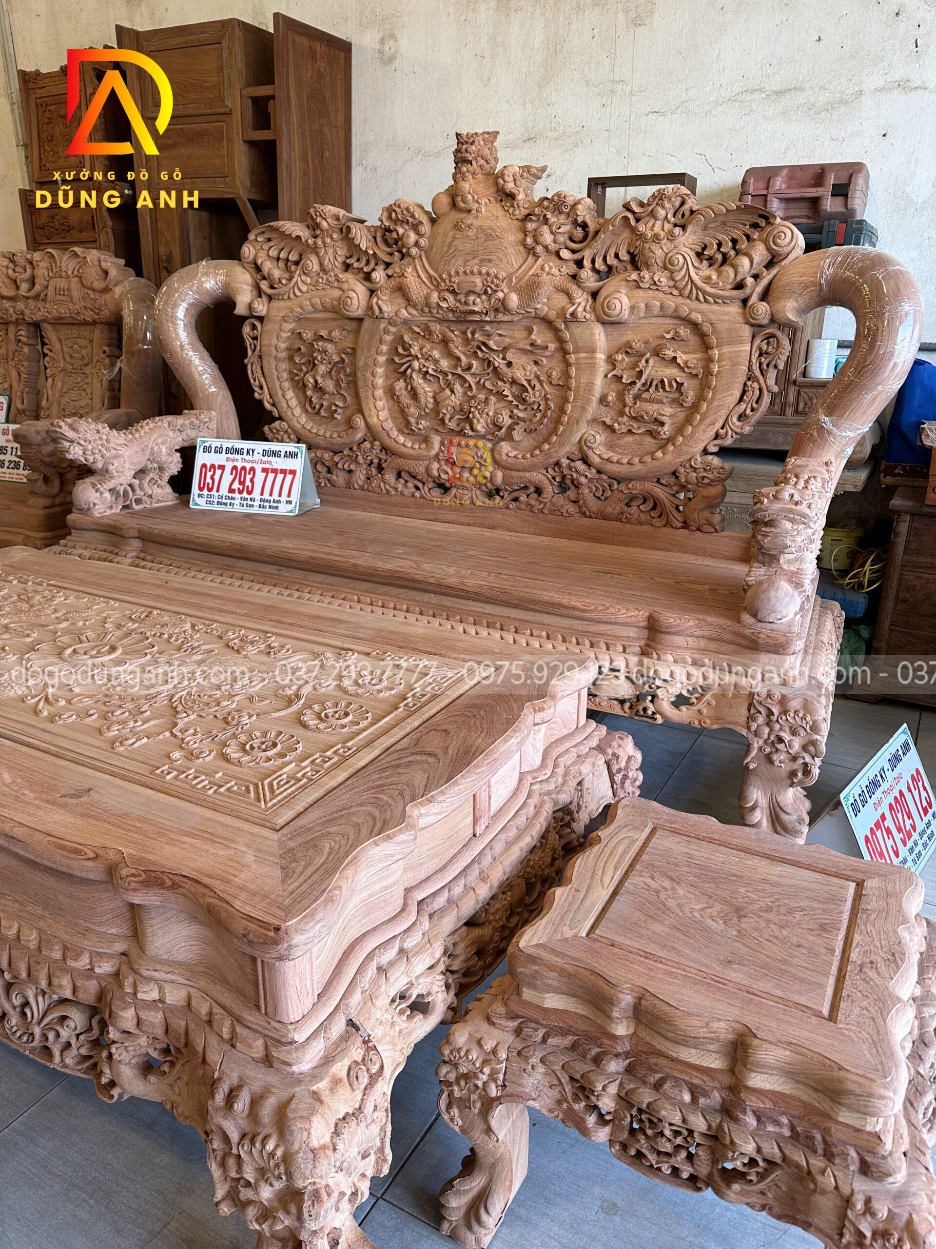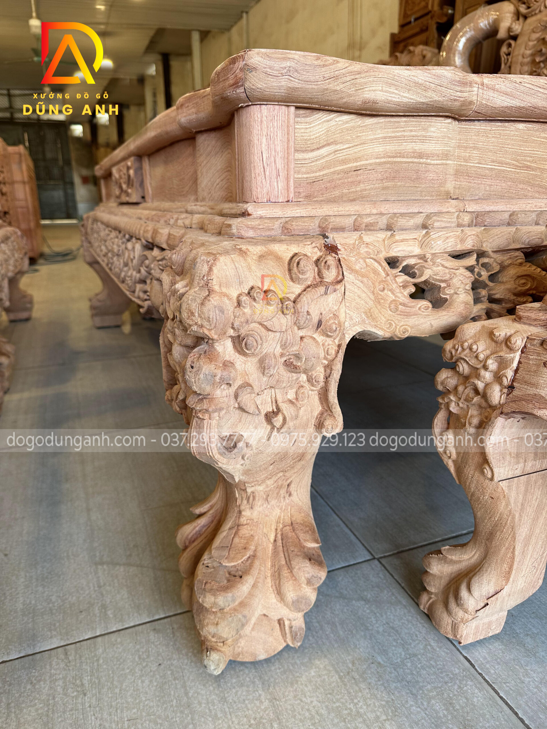 Bộ bàn ghế Minh quốc Nghê Thái Tử có thiết kế vô cùng cầu kỳ và tinh xảo quy tụ đầy đủ các yếu tố tiện nghi, thẩm mỹ và phong thủy. Chắc chắn sẽ làm hài lòng chủ nhân là anh Cường ở miền Nam. Do không đến được trực tiếp đến Xưởng đồ gỗ Dũng Anh để ký nhận mộc nên xưởng đã đưa ra giải pháp kiểm hàng online, dưới đây là ảnh chụp xưởng đã gửi anh Cường xem trước khi lên màu cho bộ sản phẩm chất lượng này.