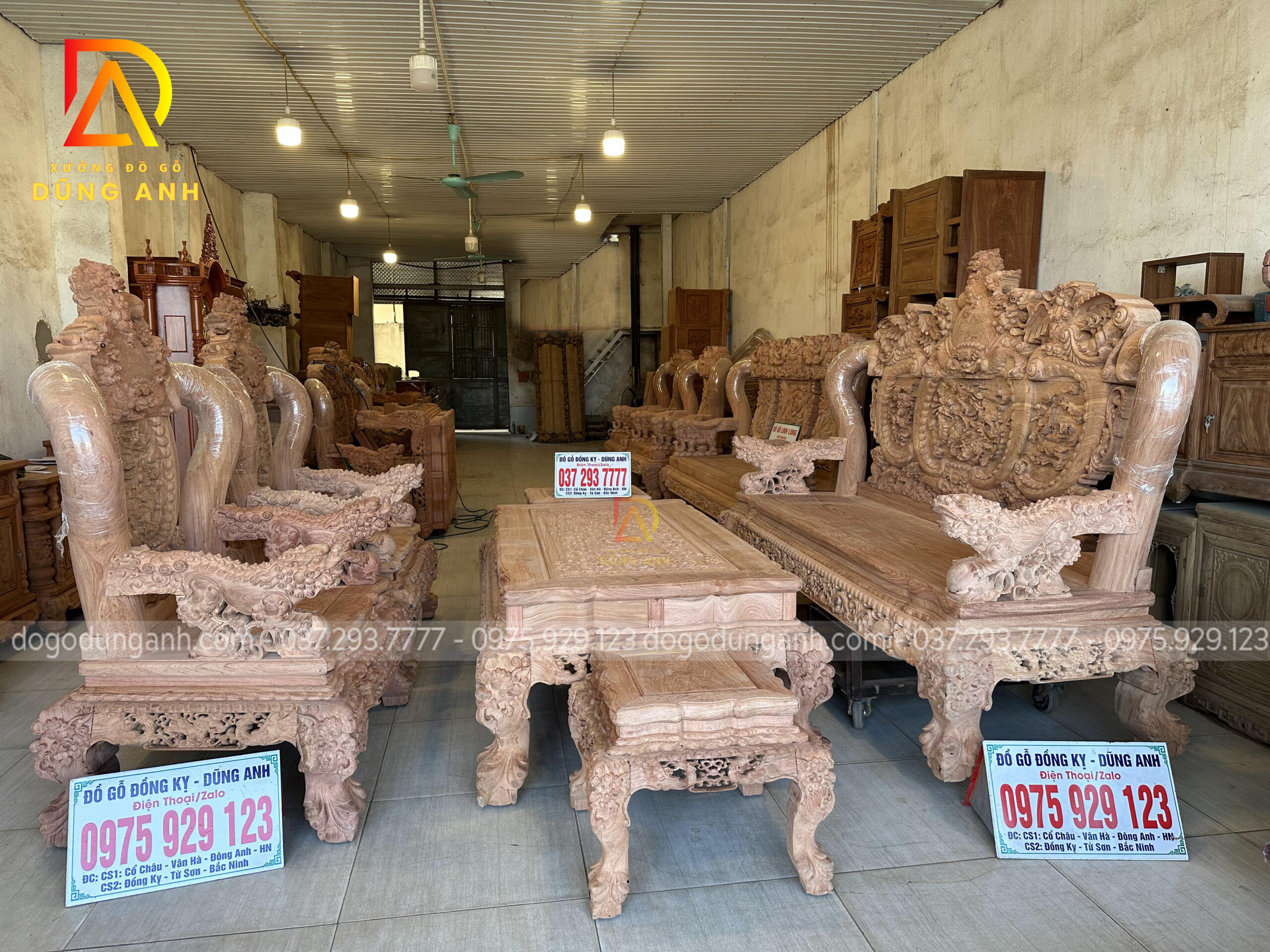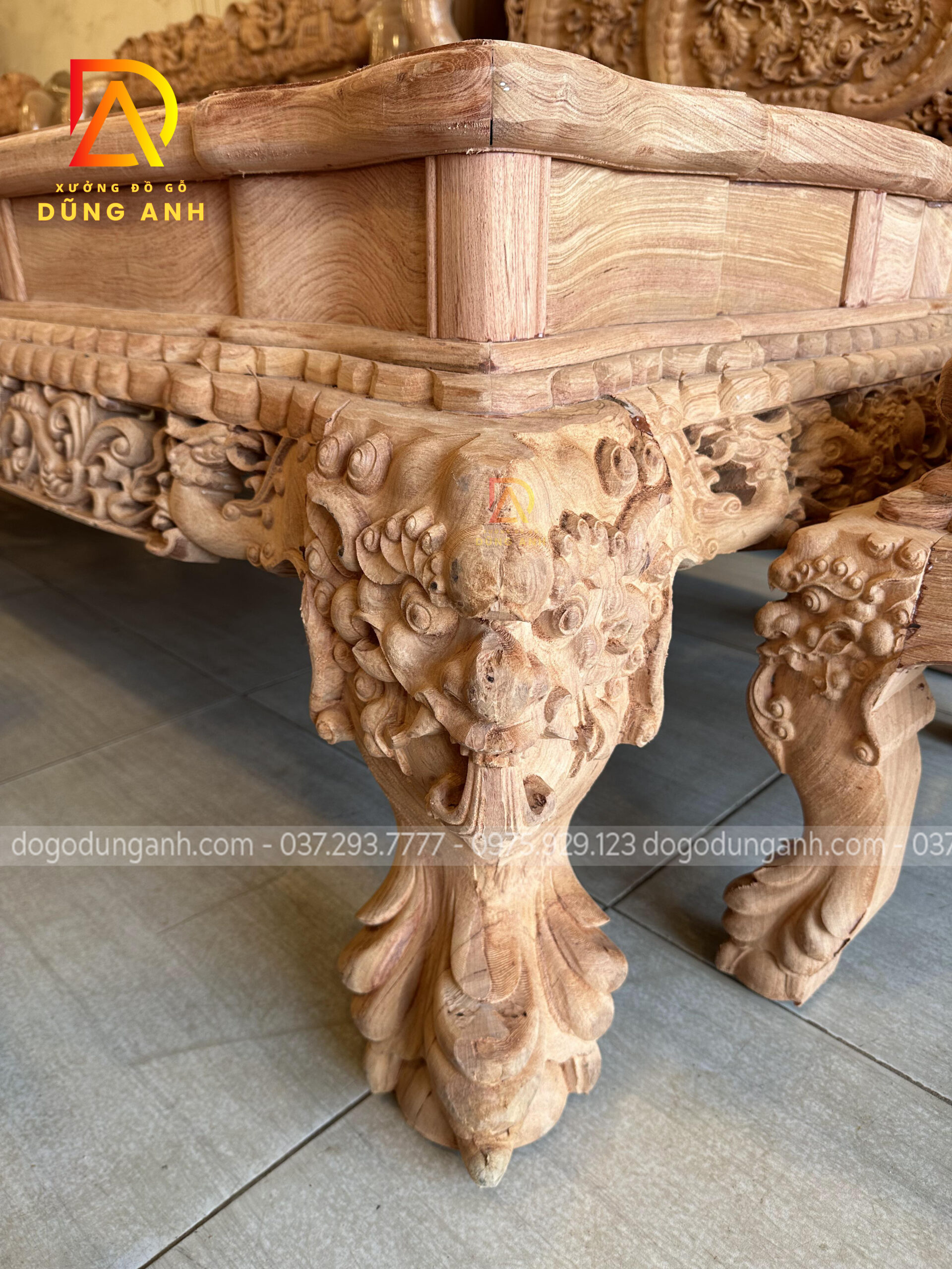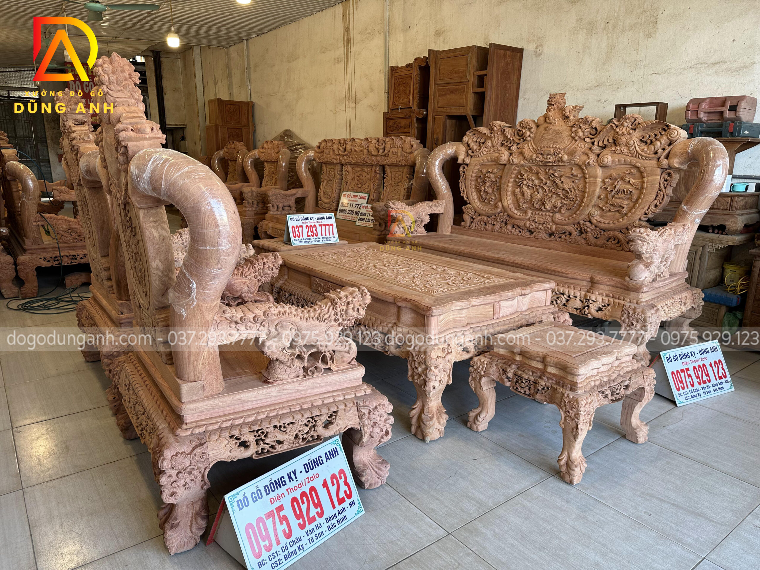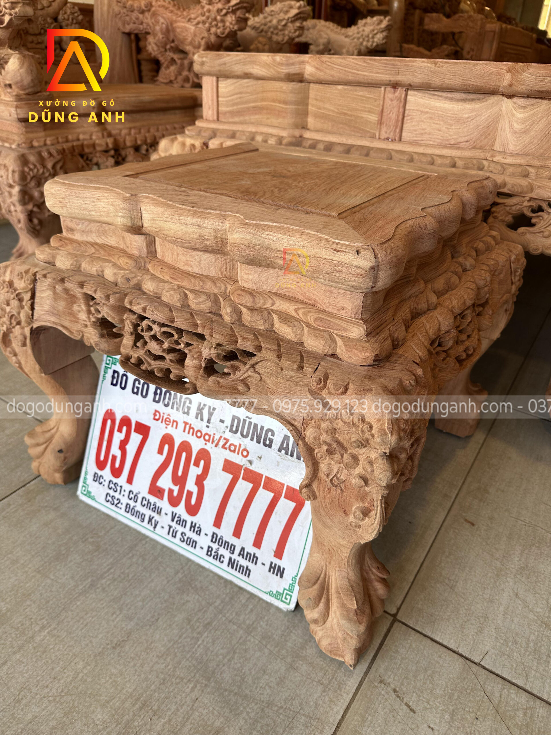 Bộ bàn ghế Minh quốc Nghê Thái Tử có thiết kế vô cùng cầu kỳ và tinh xảo quy tụ đầy đủ các yếu tố tiện nghi, thẩm mỹ và phong thủy. Chắc chắn sẽ làm hài lòng chủ nhân là anh Cường ở miền Nam. Do không đến được trực tiếp đến Xưởng đồ gỗ Dũng Anh để ký nhận mộc nên xưởng đã đưa ra giải pháp kiểm hàng online, dưới đây là ảnh chụp xưởng đã gửi anh Cường xem trước khi lên màu cho bộ sản phẩm chất lượng này.