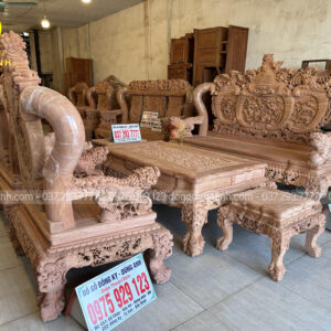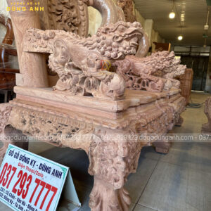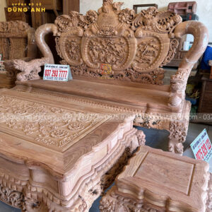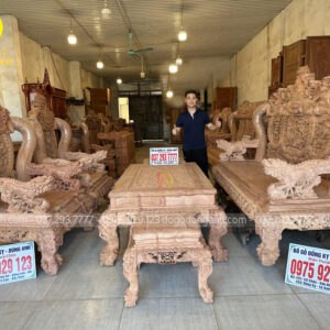 Bộ bàn ghế anh Cường đặt là mẫu bàn ghế Minh quốc nghê thái tử phượng hóa gồm 6 món làm từ chất liệu gỗ hương đá – là dòng gỗ cao cấp có độ đanh chắc, vân mịn rõ nét và cuộn xoáy độc đáo.