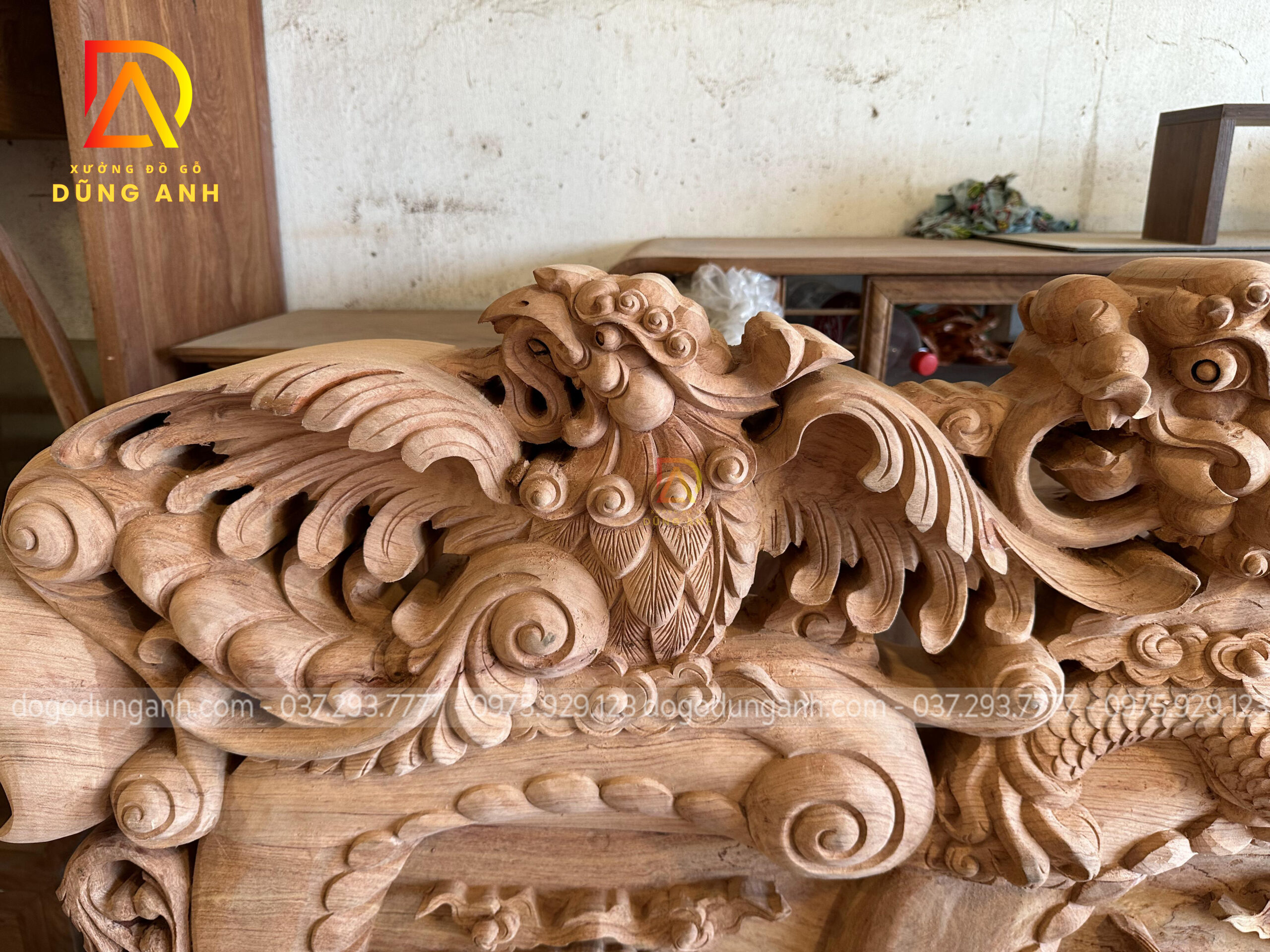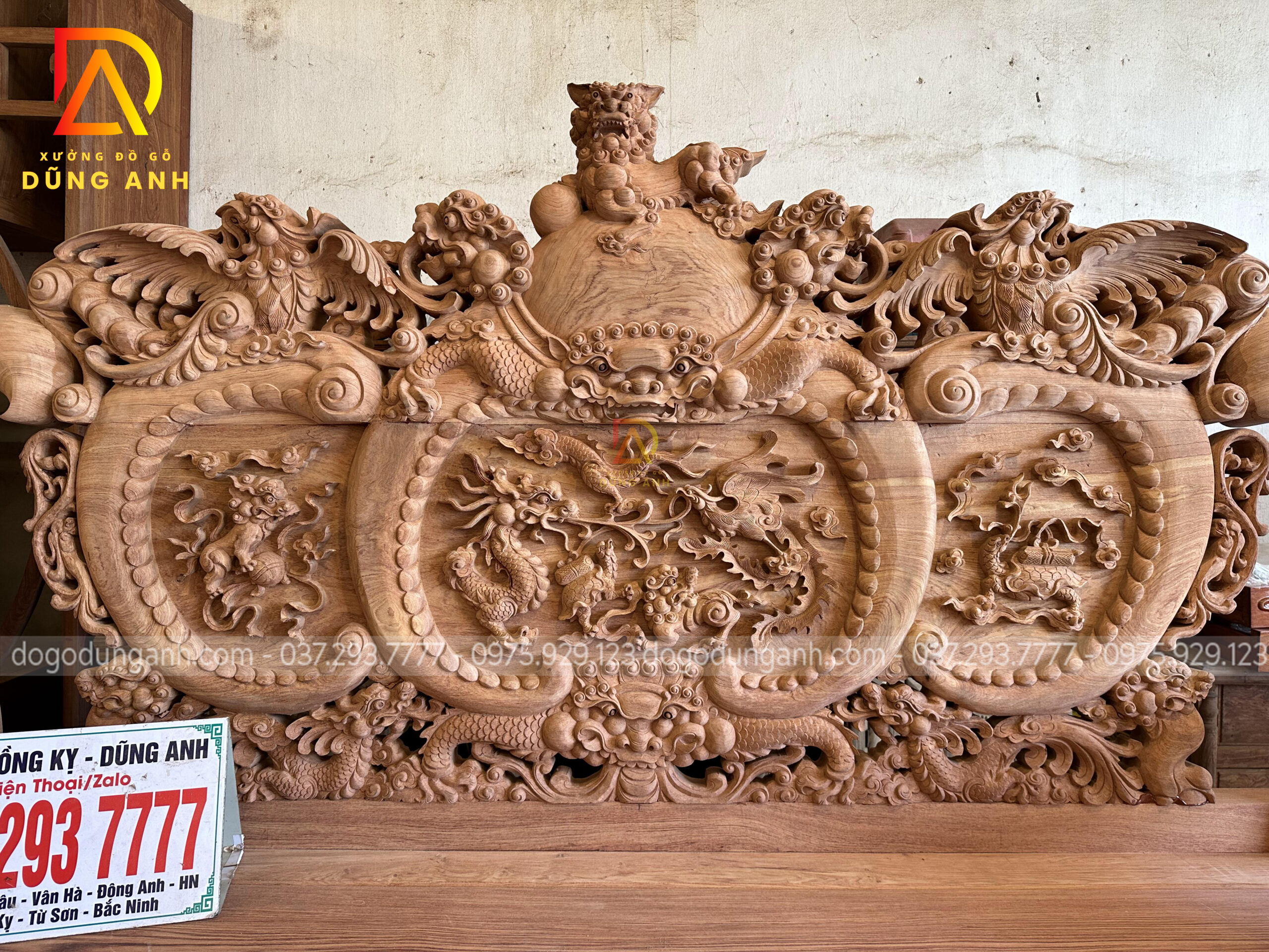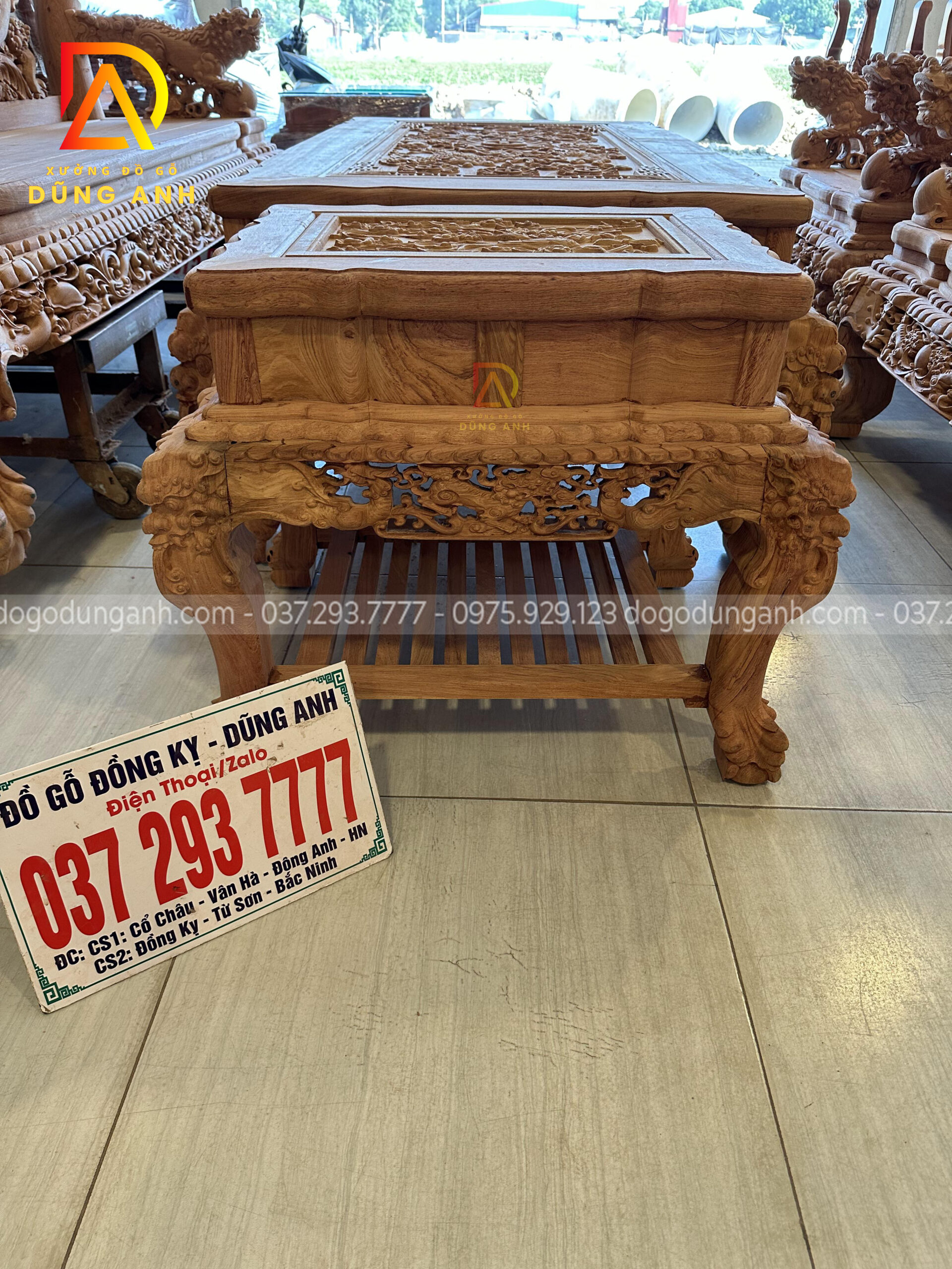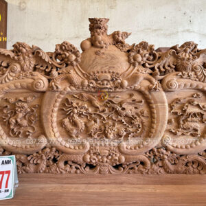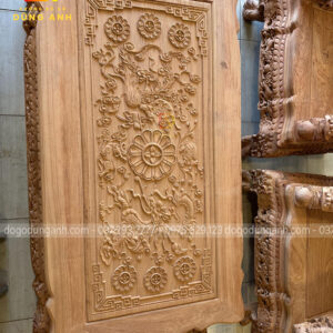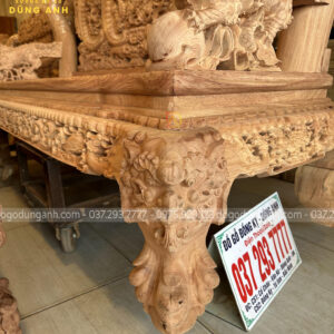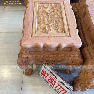 Thiết kế bàn trà cầu kỳ với phần mặt khung tranh đục tứ linh siêu sâu và sắc nét. Thể hiện mong ước cầu mong một cuộc sống sung túc, thịnh vượng của gia chủ.