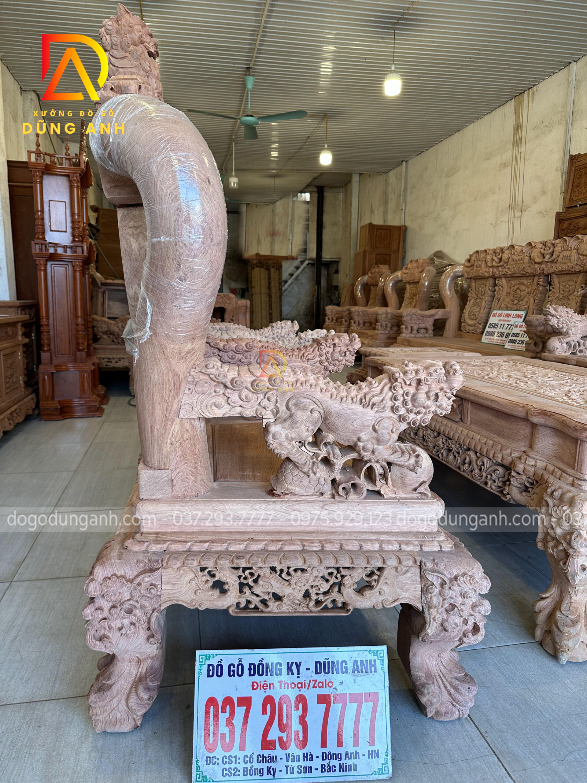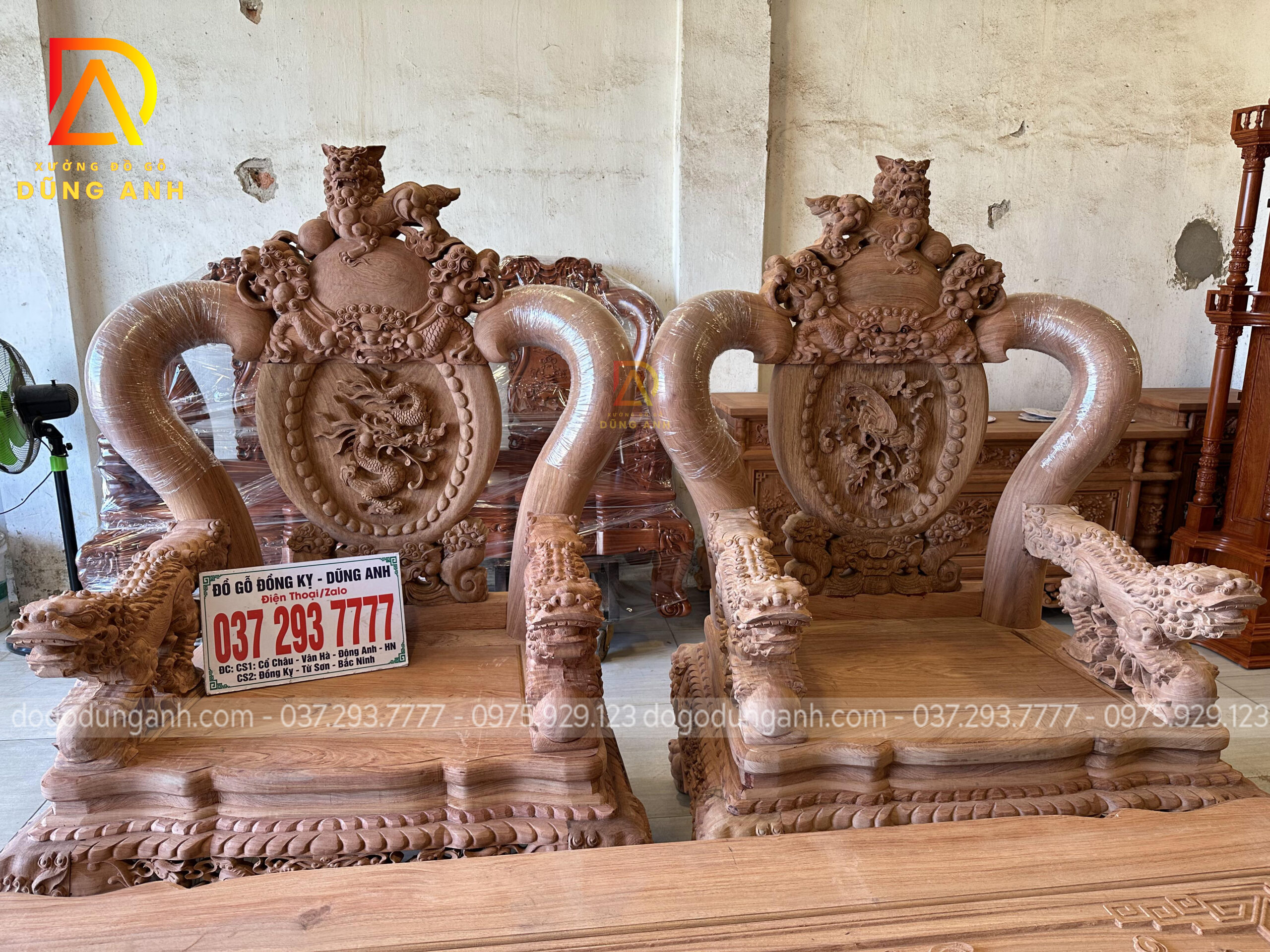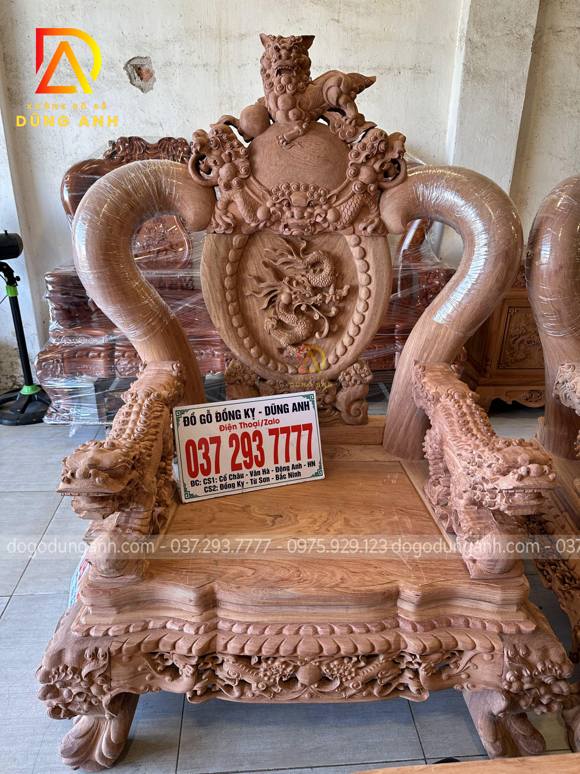 - Ghế đơn rộng 117cm, sâu 85cm, cao 1m62 trạm khắc tinh tế họa tiết Rồng Phượng