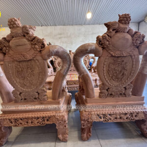 Ghế đơn cũng được thiết kế cao rộng, bề thế như những ngai vàng của vua chúa với hình tượng nghê bảo đỉnh hùng dũng trên đỉnh chương và phần vách đục tam sư vờn cầu sống động. Không chỉ tạo điểm nhấn gia tăng vẻ đẹp sang trọng, quyền uy mà còn là yếu tố phong thủy mang ý nghĩa trấn trạch cầu may mắn, vui vẻ cho cuộc sống.