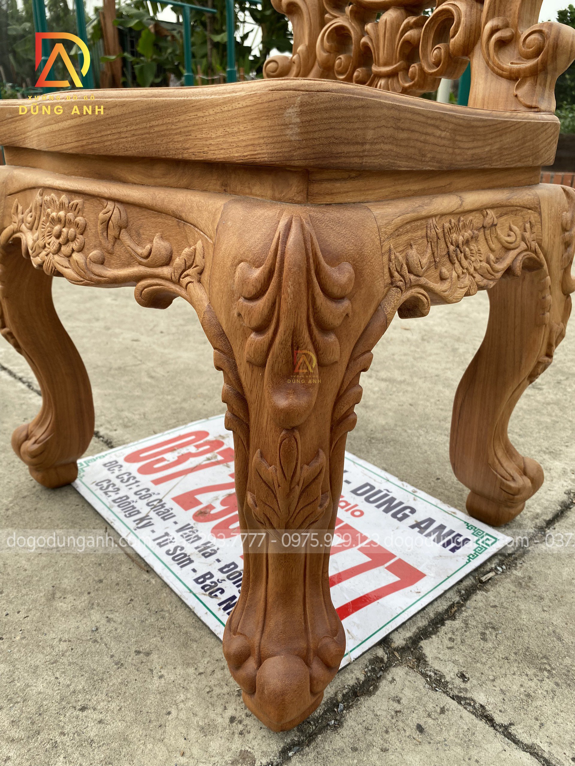 - Để giảm bớt sự trơn tru của chiếc bàn thì phần chân trụ được Xưởng đồ gỗ Dũng Anh đục trạm những đường nét hoa văn kiểu Pháp , tuy là đục CNC nhưng đã được đục tỉa lại bằng tay của những người thợ lâu năm cho nên nhìn những đường hoa văn vô cùng sắc nét .