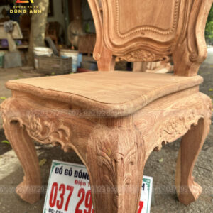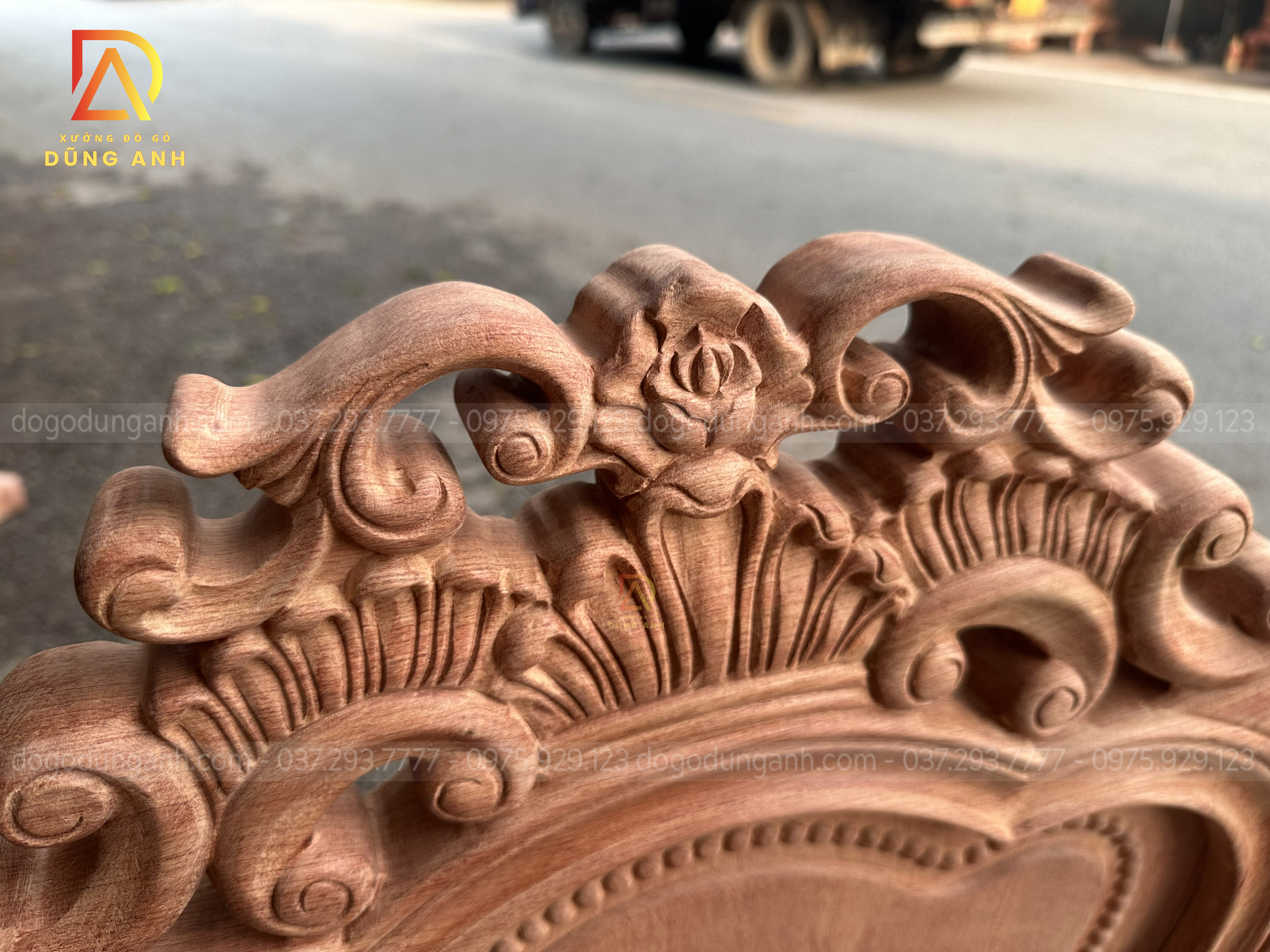 - Khuôn tranh có độ dày 3 cm cực kì chắc chắn , yếm được làm vén cong đục chạm hoa lá tây , đục chạm hoa lá tây và vén cong giúp tạo thẩm mỹ cũng như đồng đều với những chiếc ghế có nhiều chi tiết