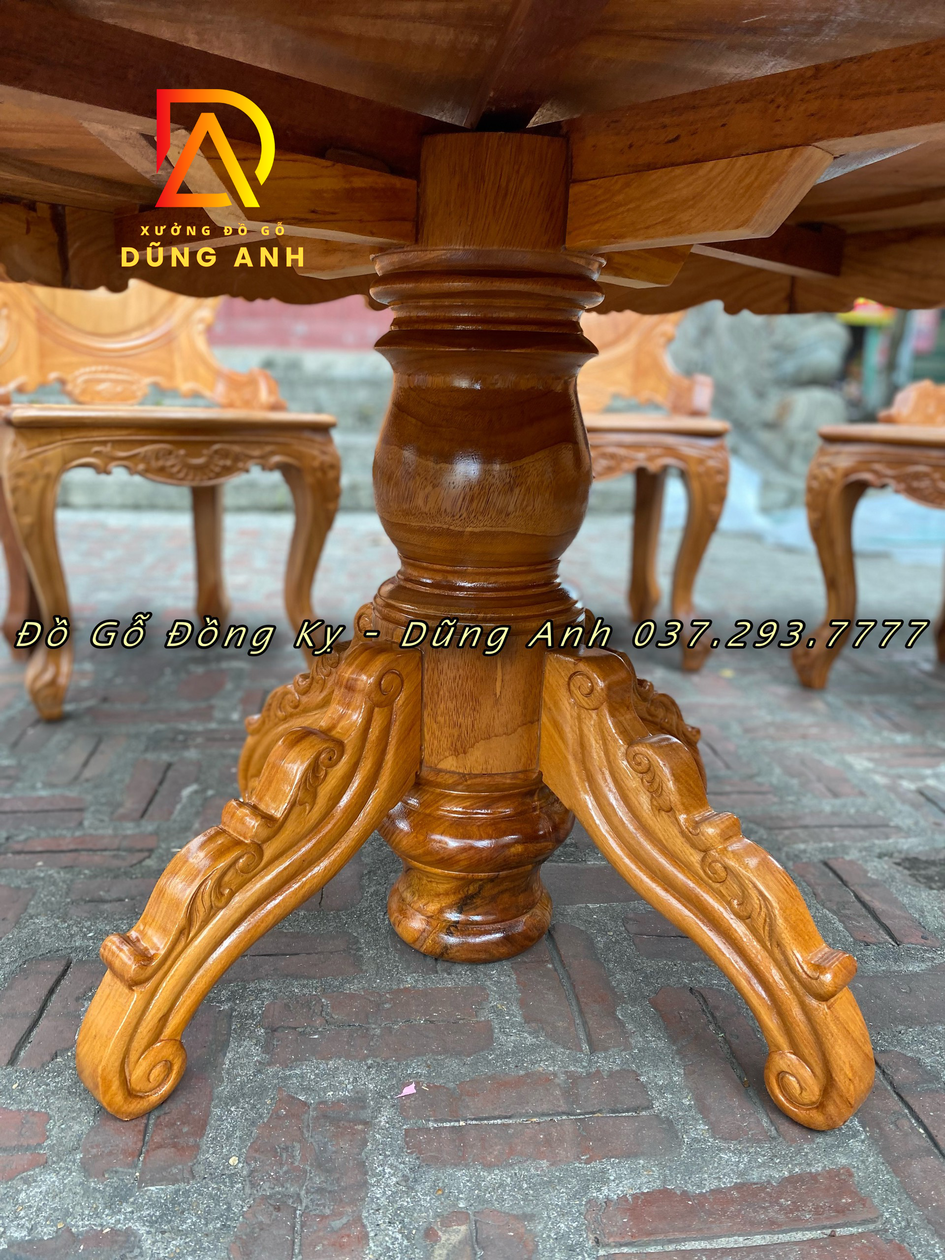- Trụ bàn liền nguyên khối tiện tròn thủ công bằng tay với những đường nét được đục vô cùng sắc nét.
