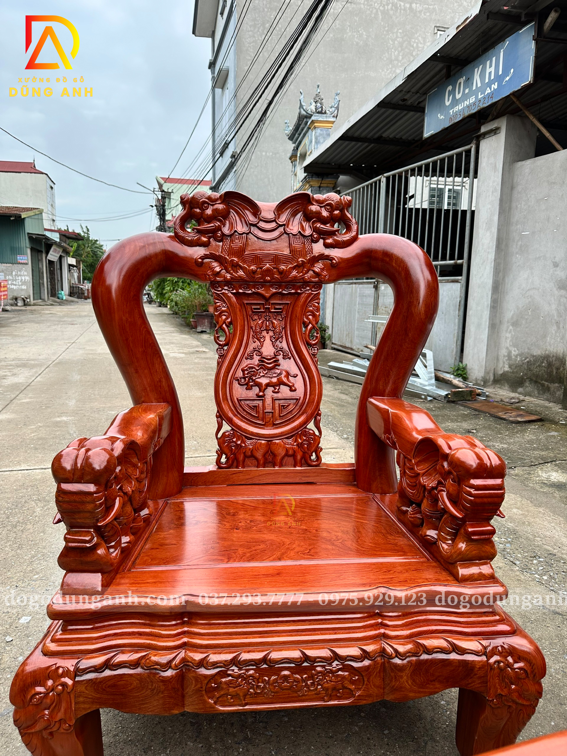 - Chiếc ghế có kích thước đẹp là rộng 100cm và chiều sâu 75cm phần chương ghế được đục chạm vô cùng tinh tế họa tiết hoa lá tây kết hợp với những chú voi tôn lên vẻ bệ vệ uy quyền