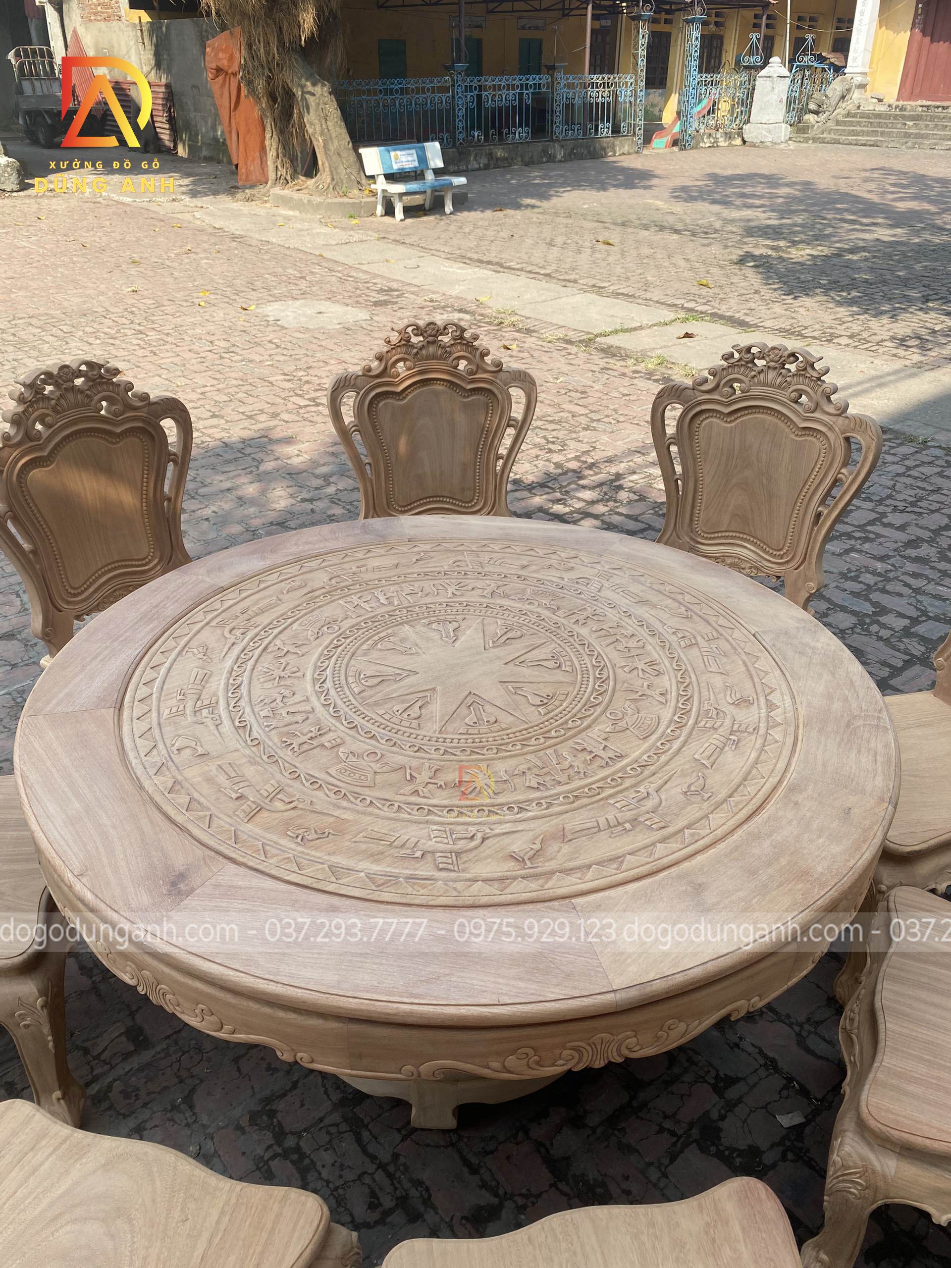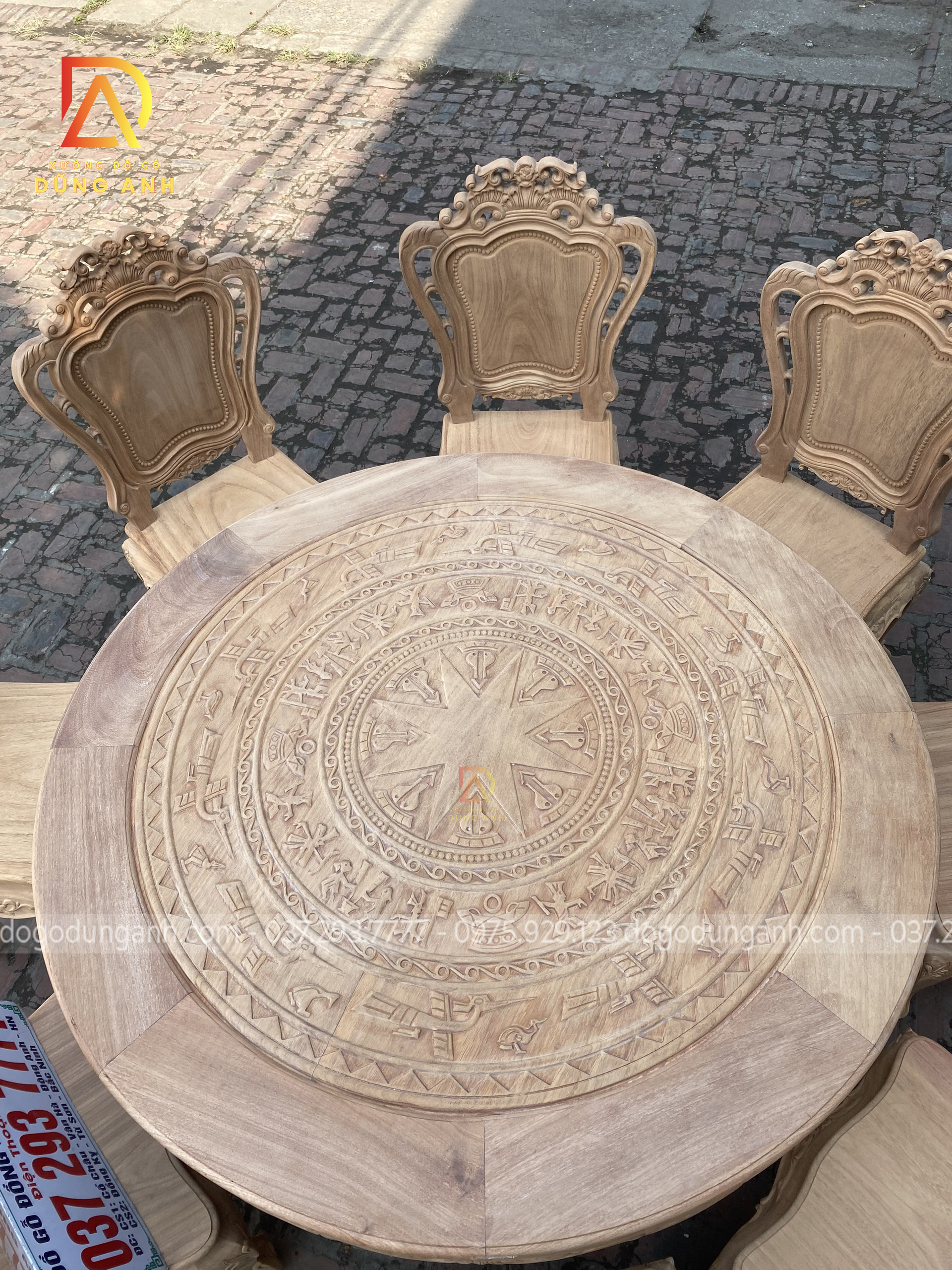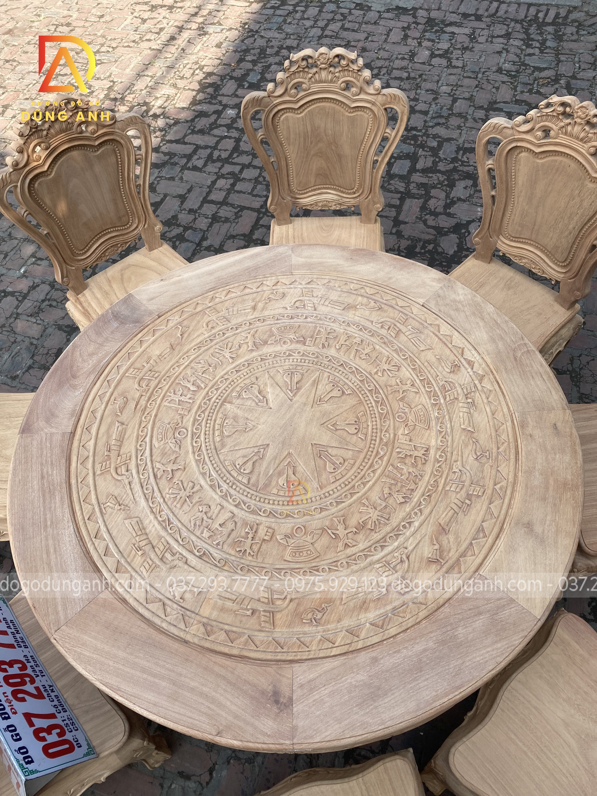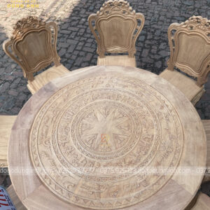 - Mặt bàn được đục trạm trổ họa tiết Trống Đồng Đông Sơn cực dân dã mang lại phong cách truyền thống cổ truyền làm tăng sự cổ kính của không gian ngôi nhà