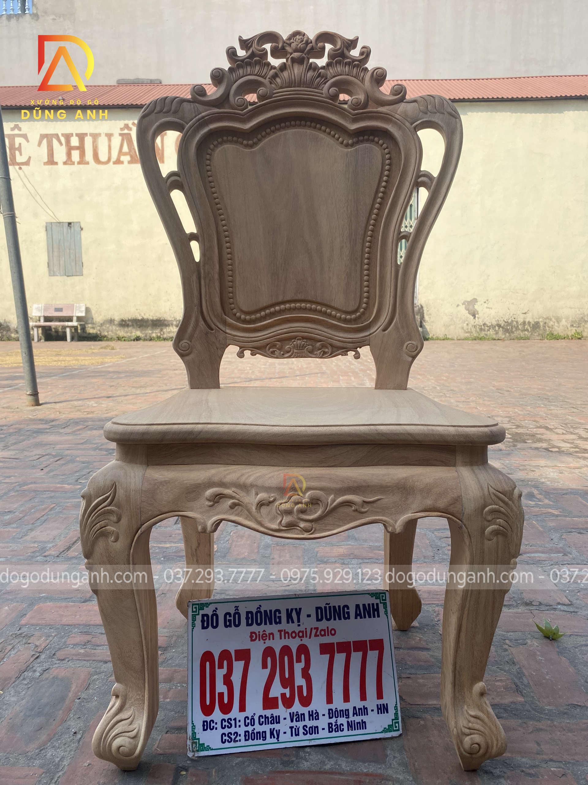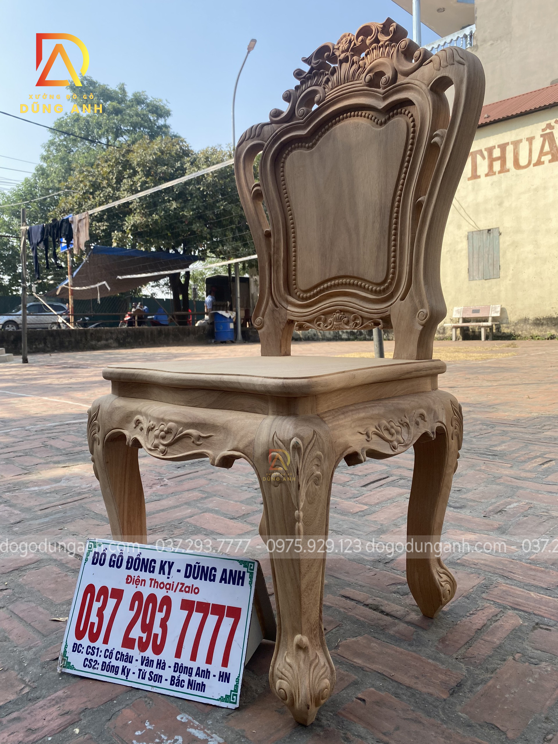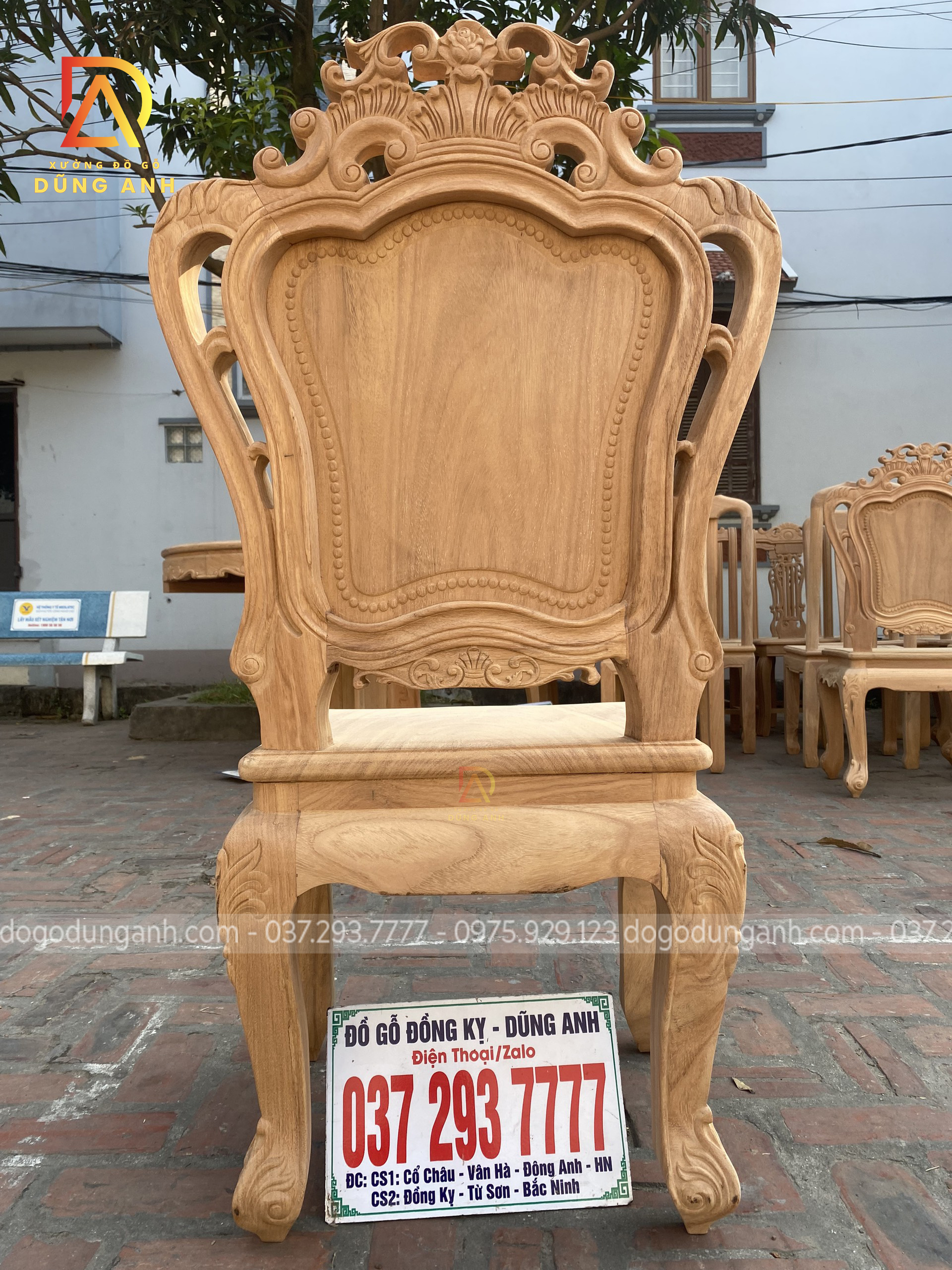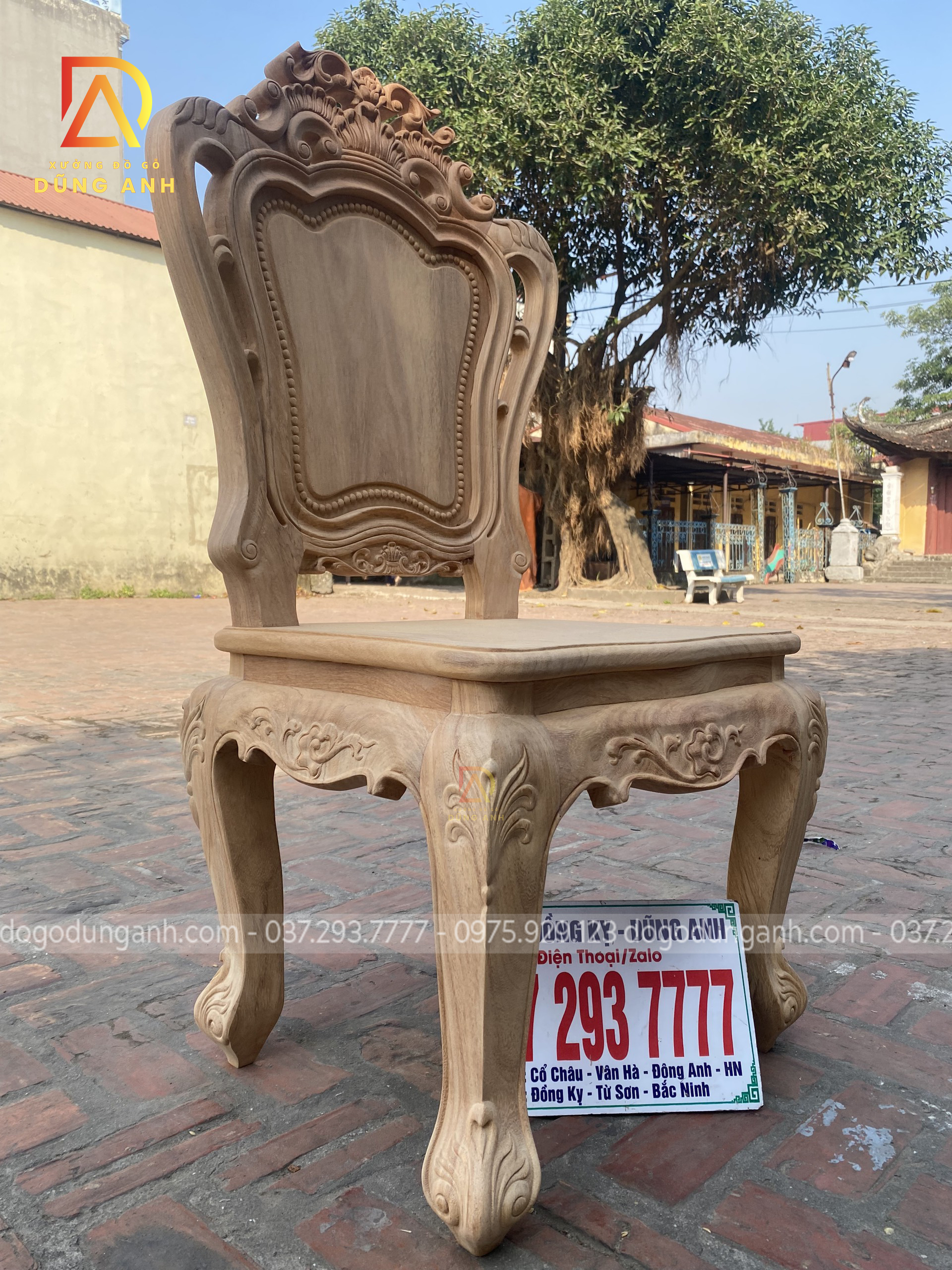 - Để có thể có được 1 chiếc chân ghế uốn cong được như vậy thì Xưởng đồ gỗ Dũng Anh đã làm từ 1 khúc gỗ có kích thước vuông 8 cm và đã được đục trạm 1 chút hoa văn hoa lá tây