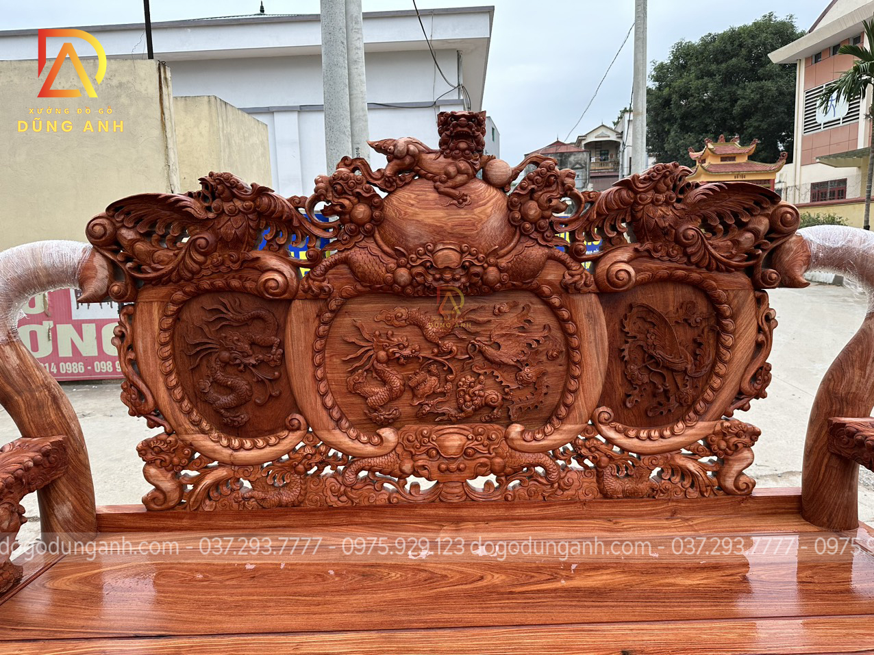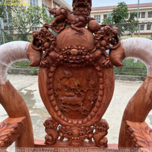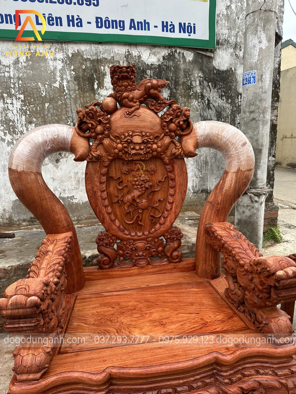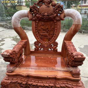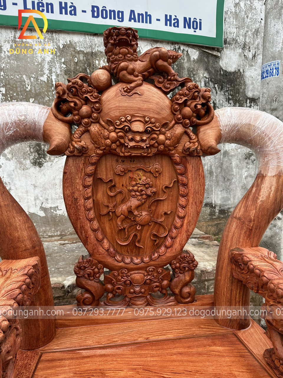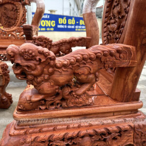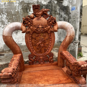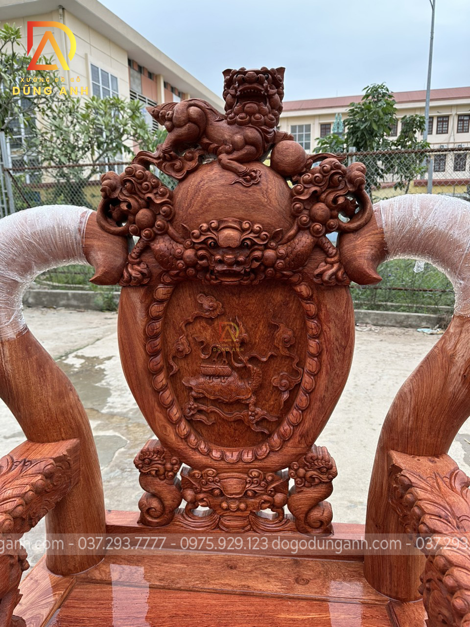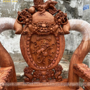 Ghế cao của bộ bàn ghế nghê bảo đỉnh được chạm khắc Rồng và Nghê mang nhiều giá trị văn hóa, phong thủy