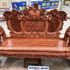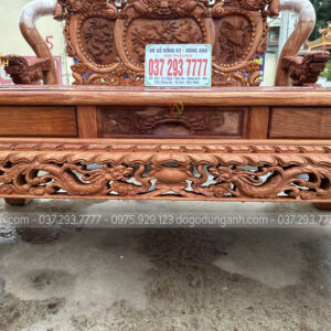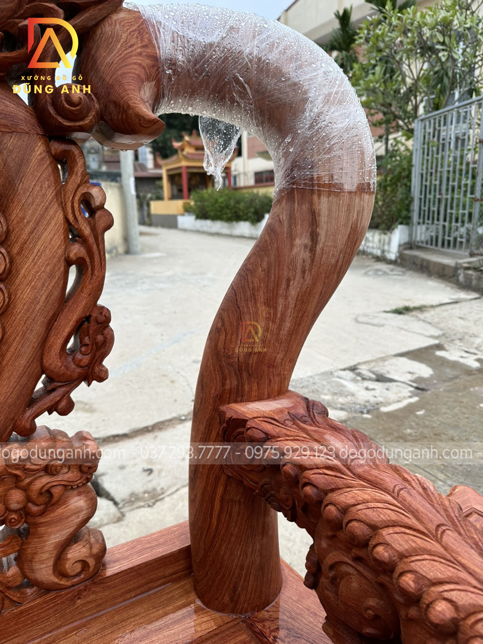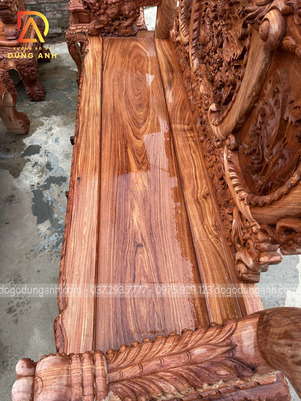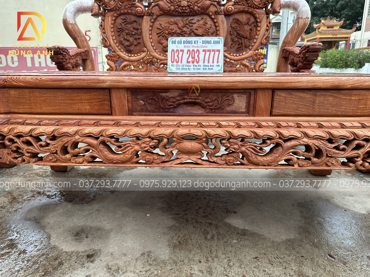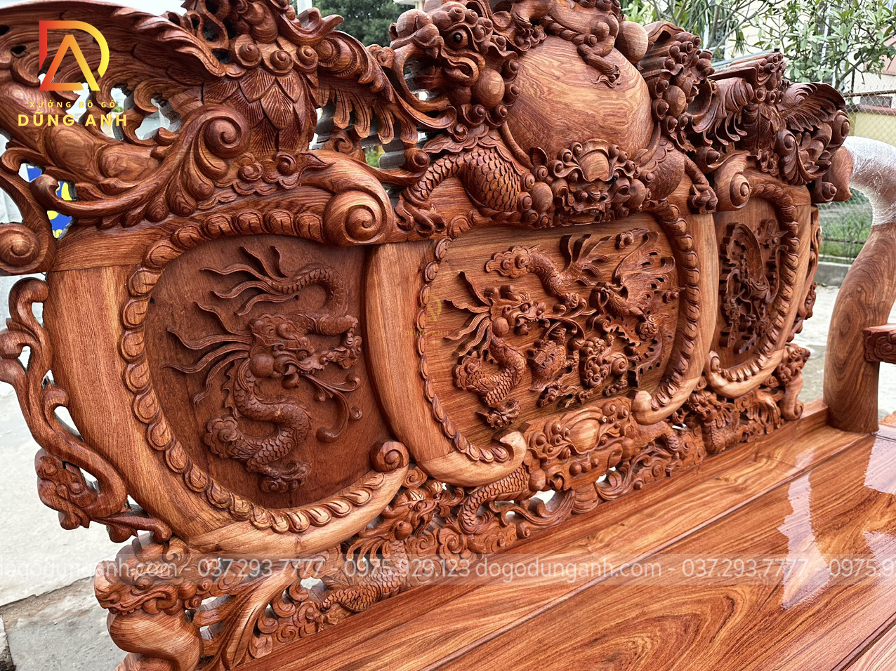 Thứ ba, bộ sản phẩm có kích thước to cục bộ. Hàng dày dặn kích thước lớn hơn so với hàng ngoài thị trườn. Khuôn tranh 4, ván 2, vách 2, yếm 6. Hàng trôi nổi thường thì sẽ là khuôn tranh 2,5, ván 1, vách 1, yếm 2. Dễ thấy nhất trong ảnh là tay cột nguyên khối, đường kính lên tới 14 cm, thuộc dòng sản phẩm siêu vip của Xưởng đồ gỗ Dũng Anh. Đặc biệt nhất là sản phẩm bộ ghế được đục chạm hai mặt, thợ đục thiếu kinh nghiệm không dám nhận.