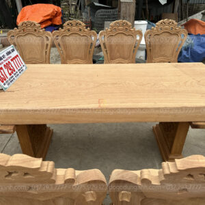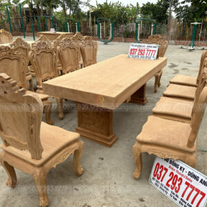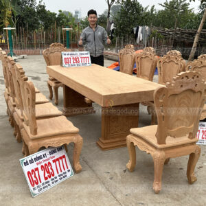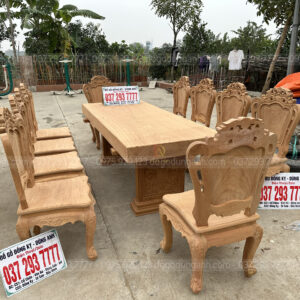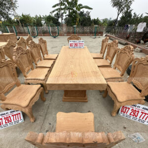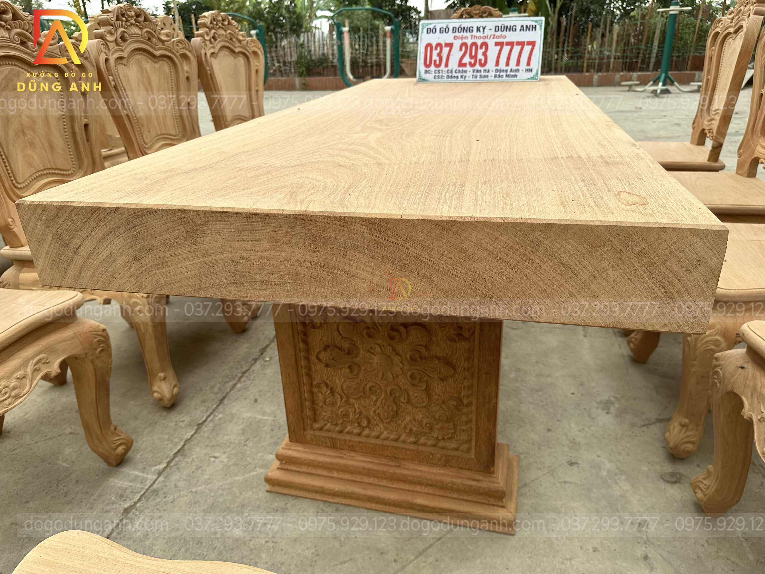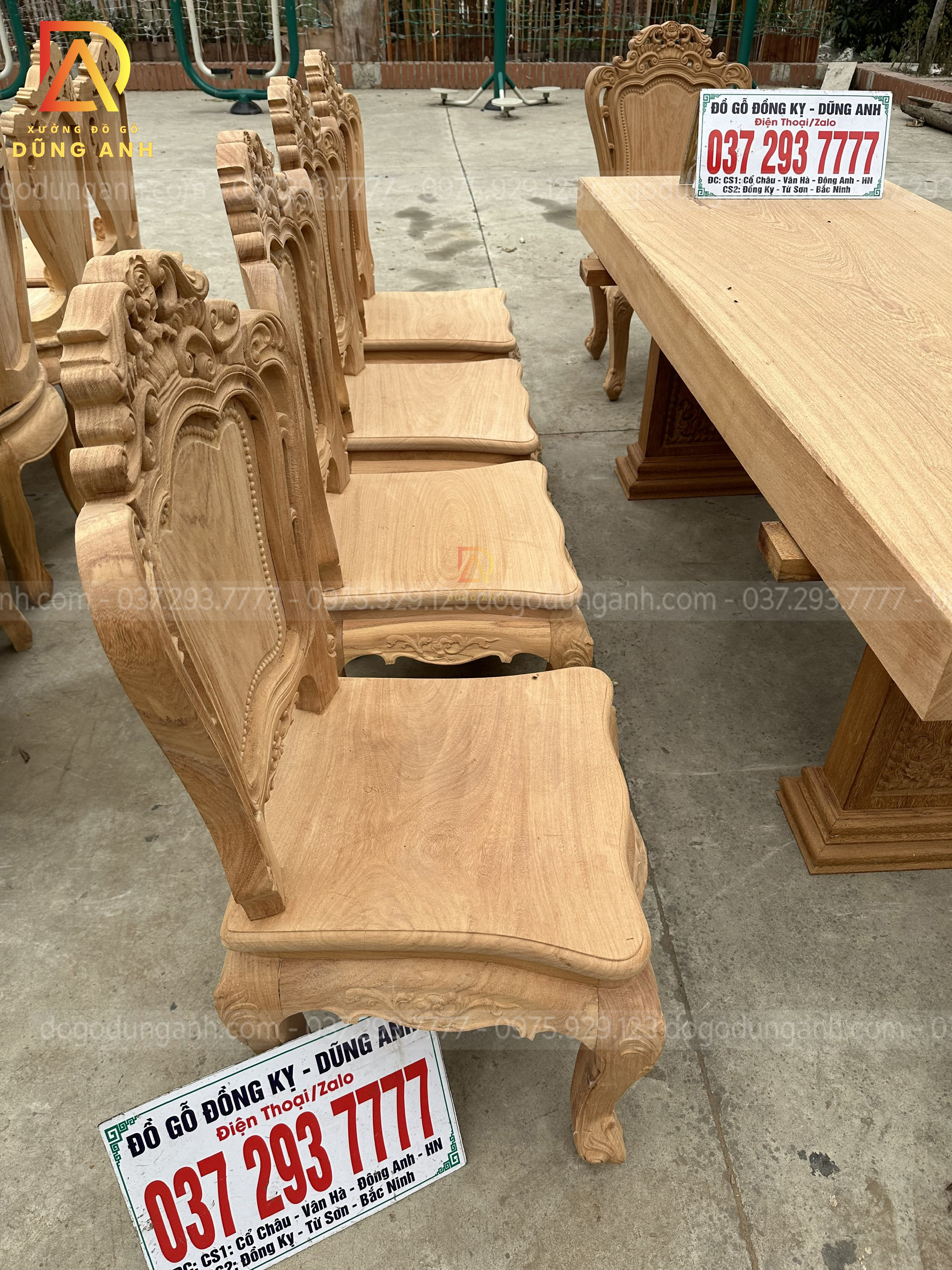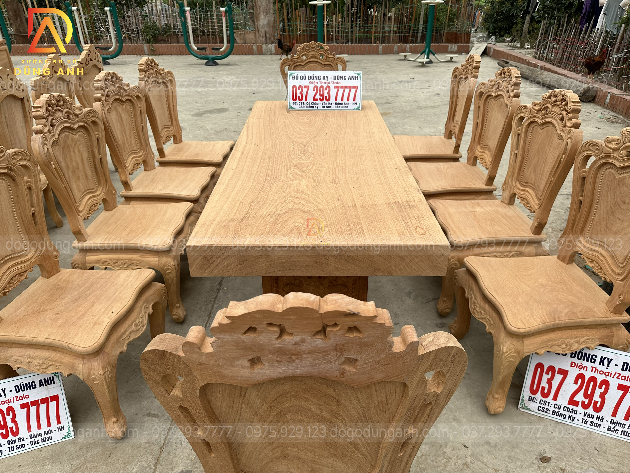 mẫu bàn ăn nguyên khối gỗ gõ đỏ dài 210cm, rộng 88cm và dày 13cm. Kết hợp cùng 10 ghế ngồi đục louis hoàng gia tân cổ điển. Với kích thước bàn rộng rãi và số lượng ghế lớn có thể đảm bảo sự tiện nghi tối đa cho gia đình chủ dùng bữa ngay cả khi nhà có khách.