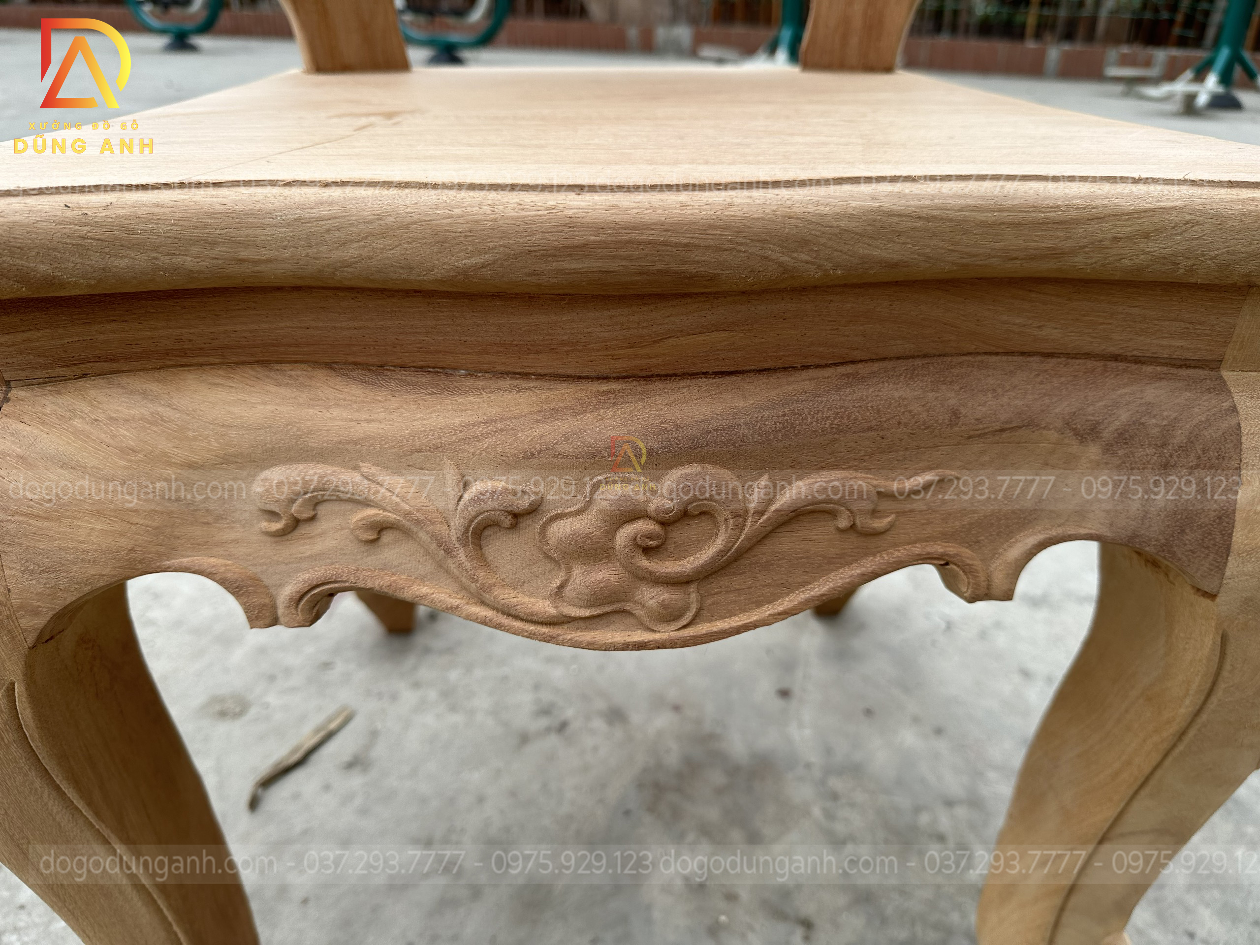 Mặt ghế thiết kế ván tràn liền tấm dày dặn kết hợp hệ chân yếm đục lá tây đẹp mắt đặc trưng phong cách tân cổ điển.