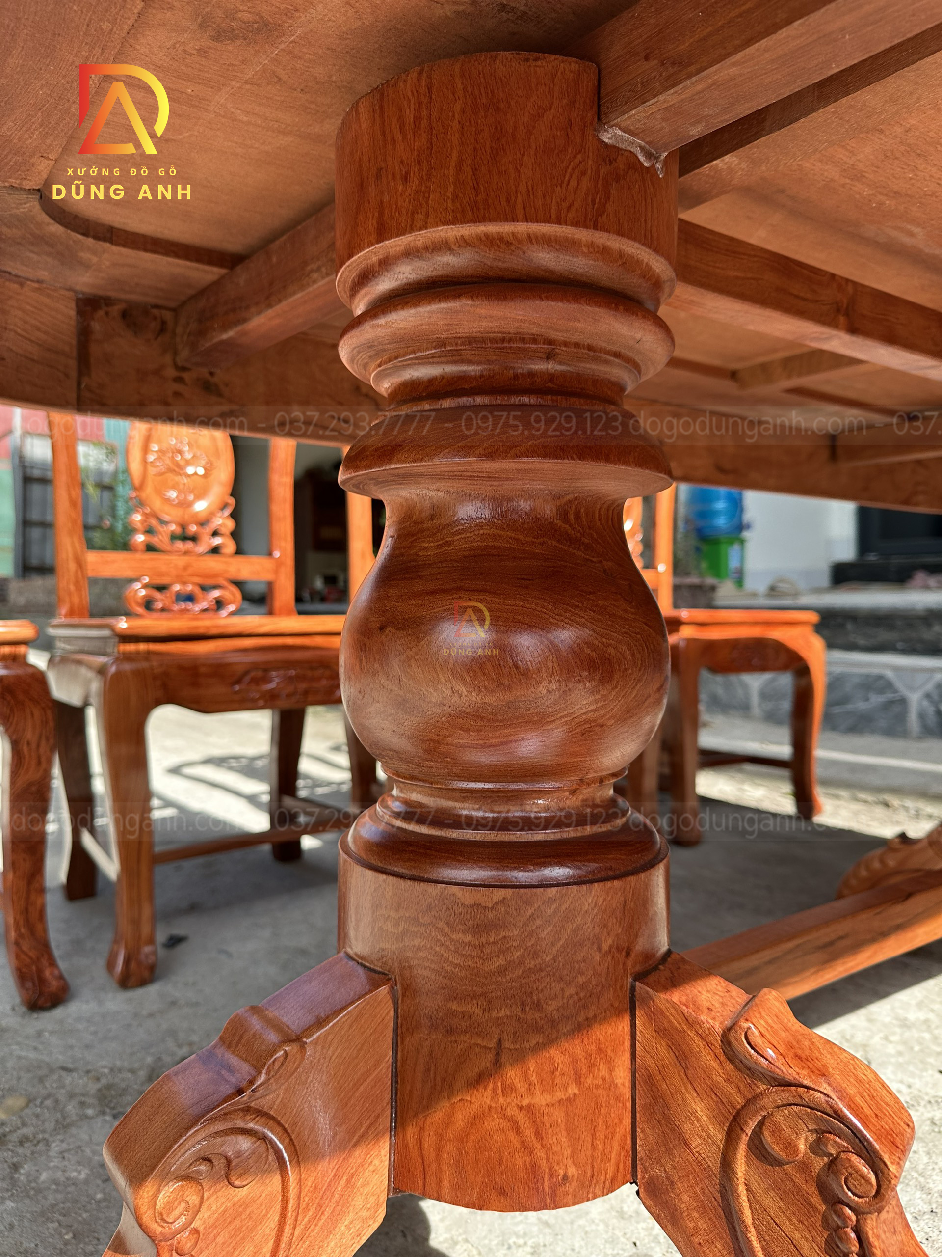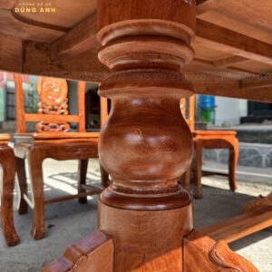 - Hai chiếc chân trụ đặc liền Nguyên Khối được tiện tròn thủ công hoàn toàn bằng tay có kích thước đường kính 18cm , đi cùng với hai chiếc chân trụ là 3 chiếc chân chó tạo thêm độ vững chãi để có thể đỡ được mặt bàn