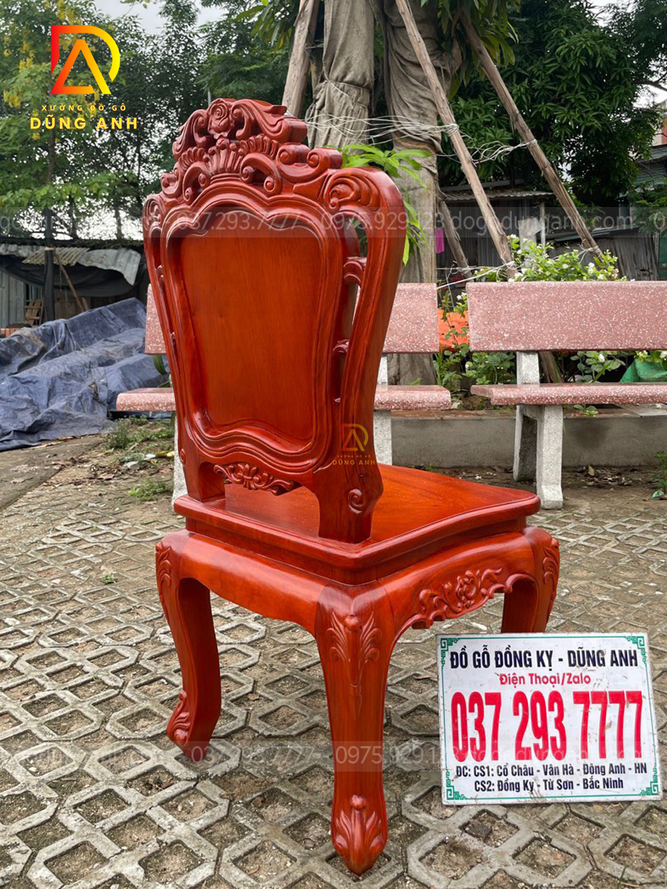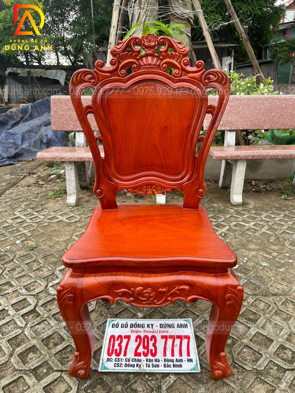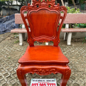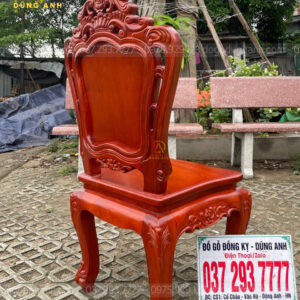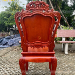 - Chương ghế đục chạm theo hình vương miệng ở chính giữa có một bông hoa hồng được đục chạm CNC và đục lại bằng tay lên độ sắc nét cực kĩ là rõ nét