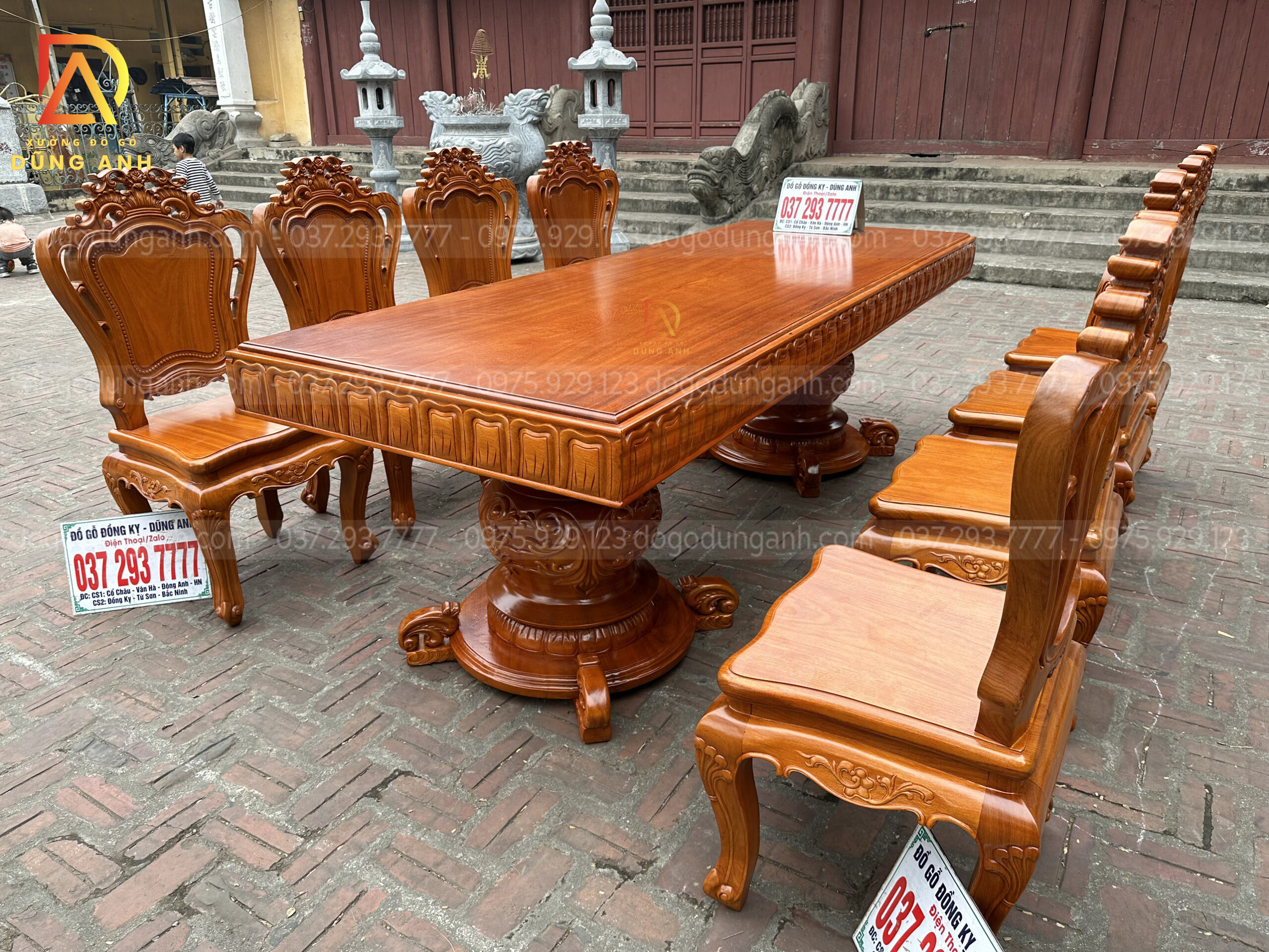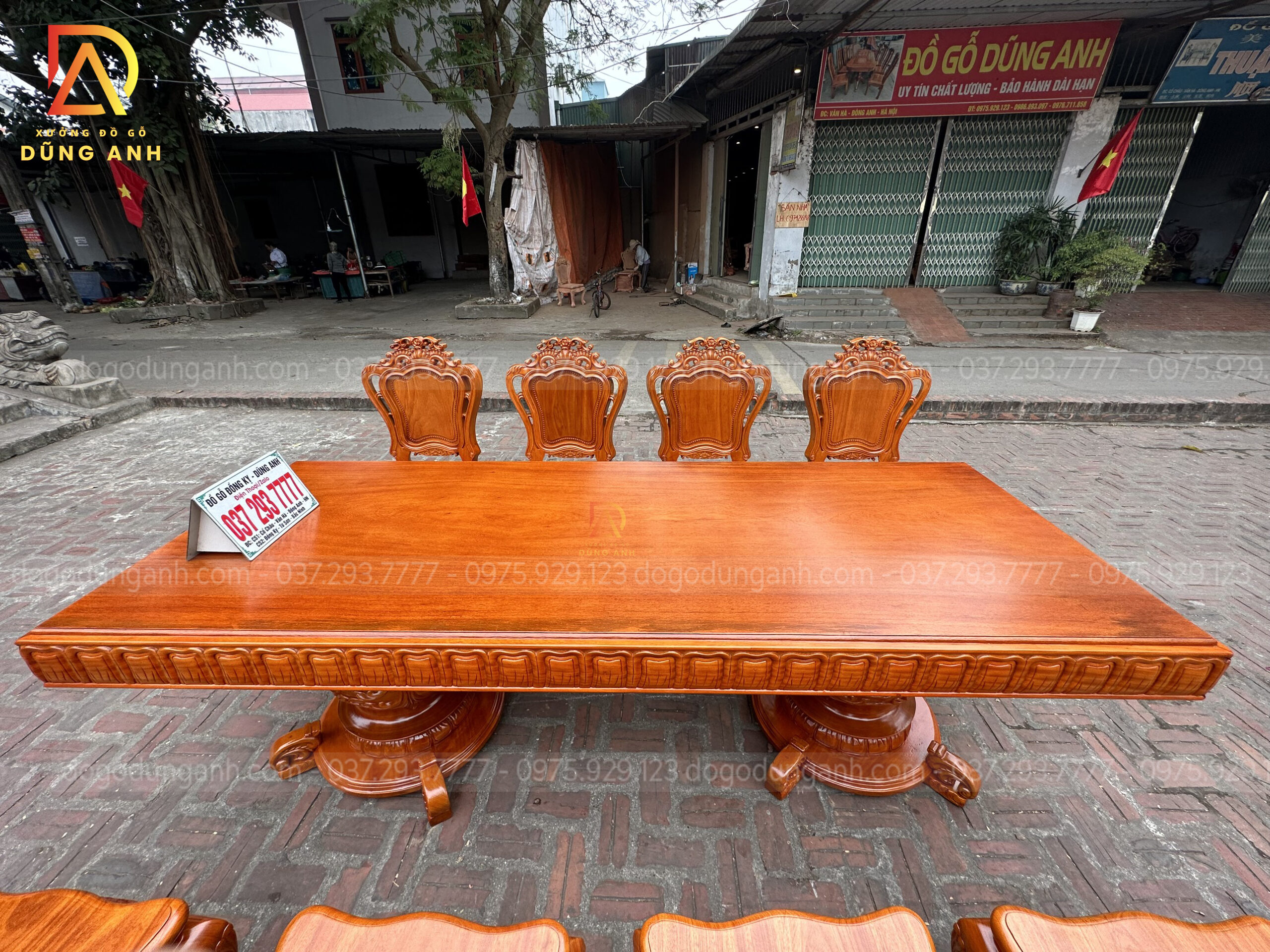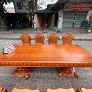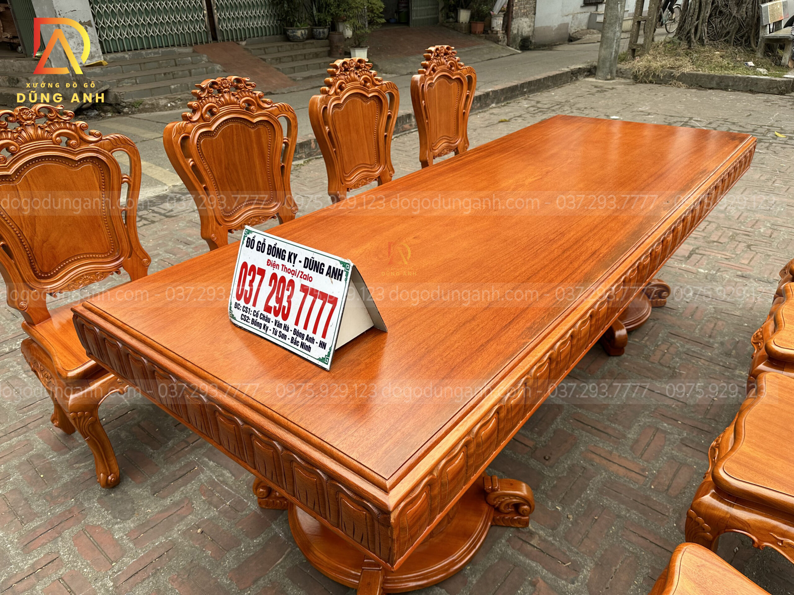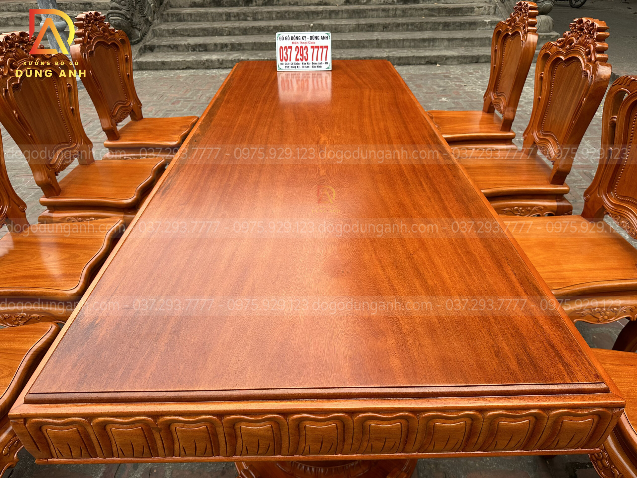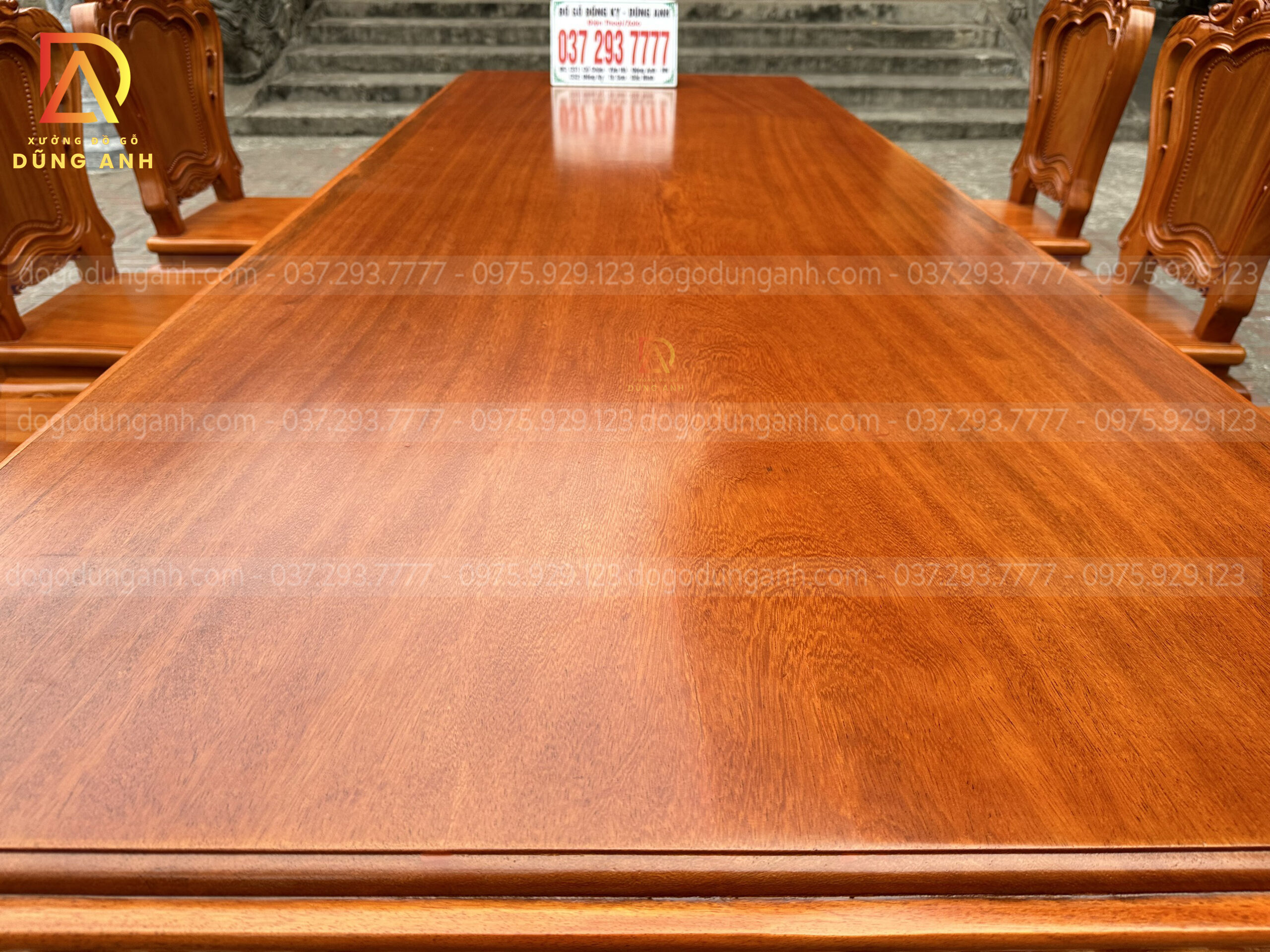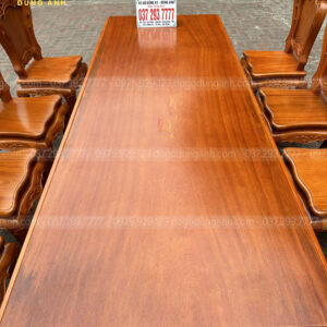 - Bàn ăn là loại bàn gỗ nguyên khối có thết kế vuông vức, kích thước: dài 260cm x rộng 97cm x dày 15cm