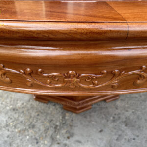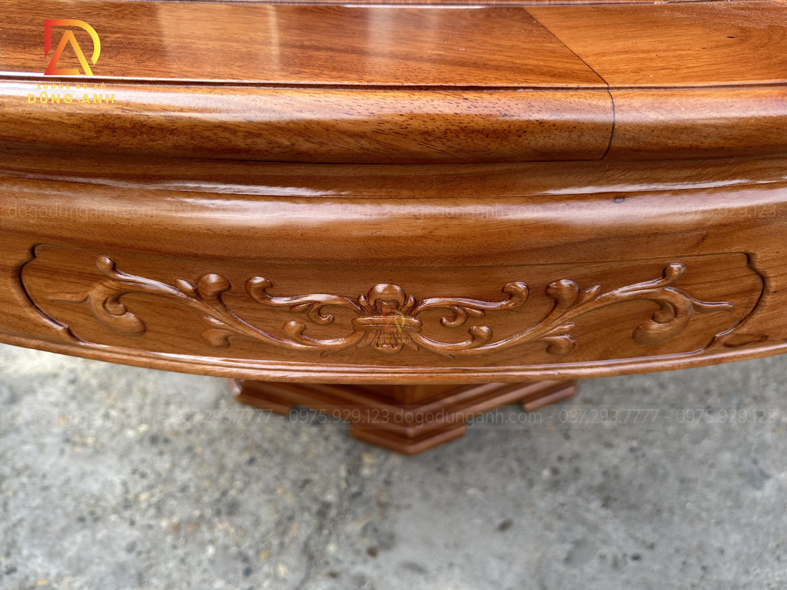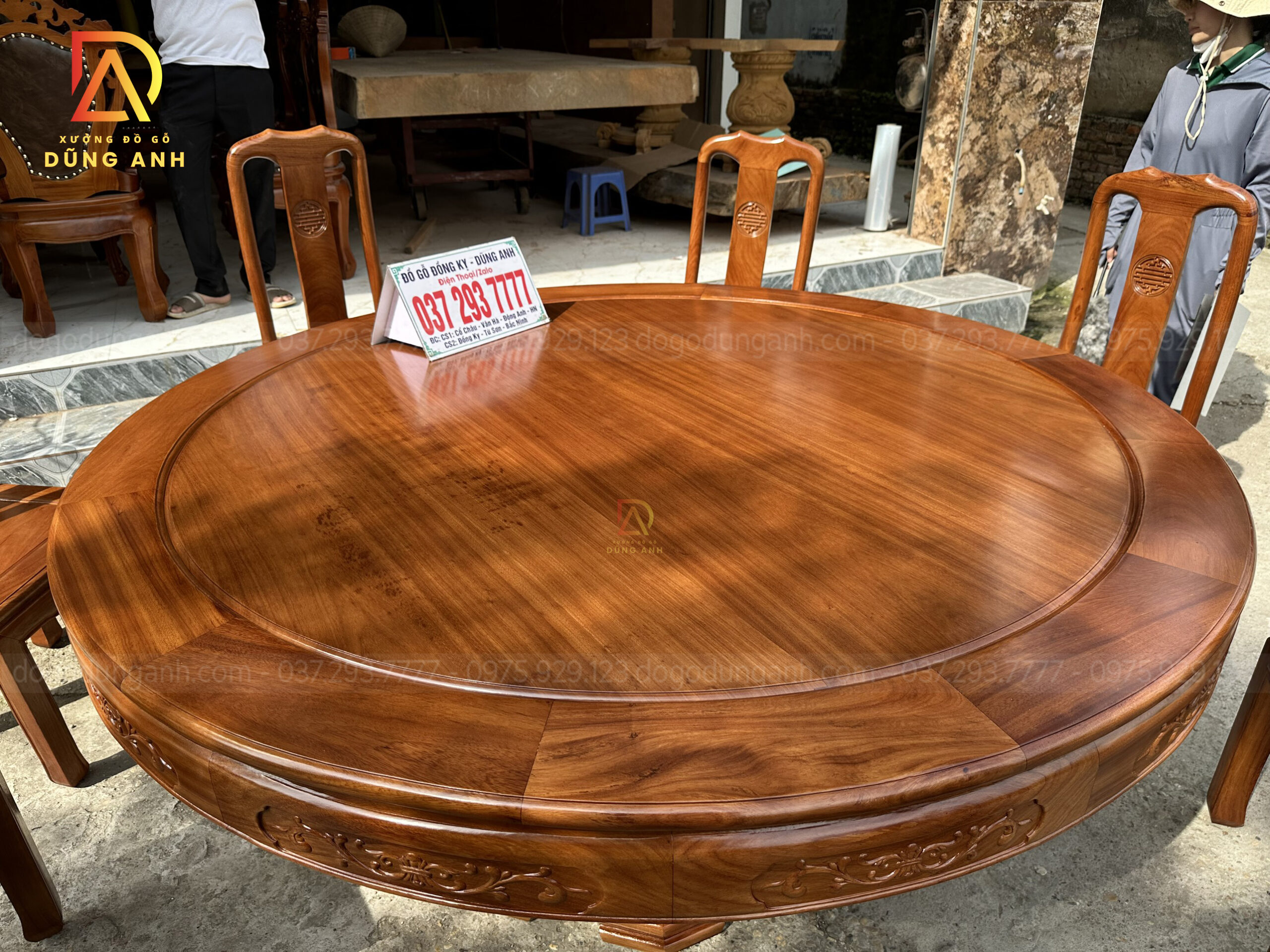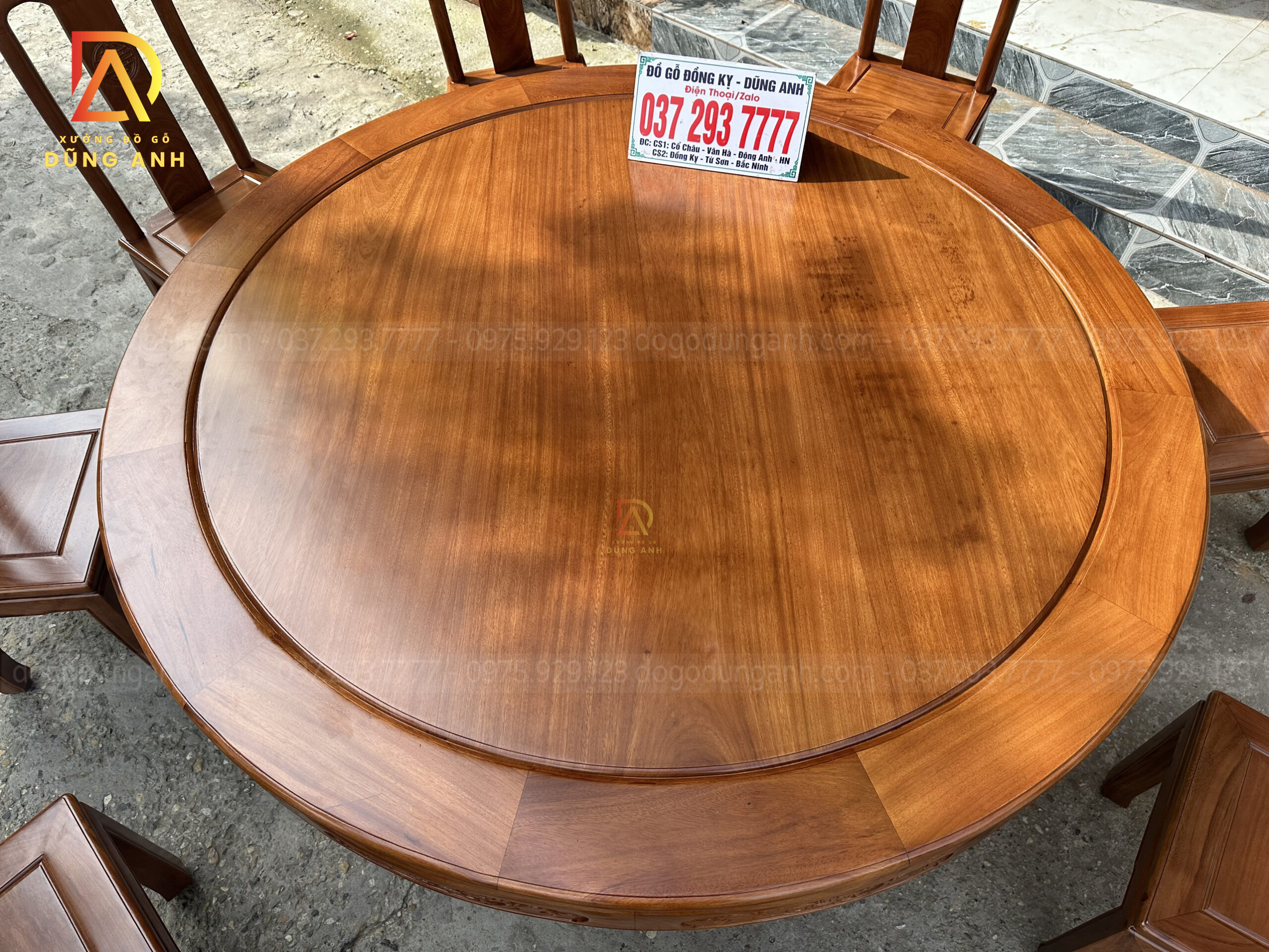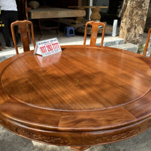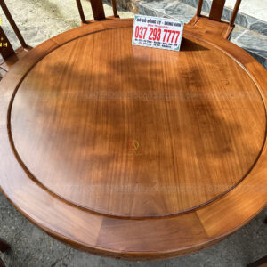 - Chiếc bàn có đường kính là 180 cm và có độ dày khuôn tranh là 3 cm , ván dày 1,5cm, ván bàn được làm là ván bàn 2 lá nhưng đã qua sự chọn lọc gỗ chọn lọc vân nên quý khách hàng có thể thấy ván bàn rất đồng đều nhìn tưởng chừng sẽ là ván bàn 1 lá