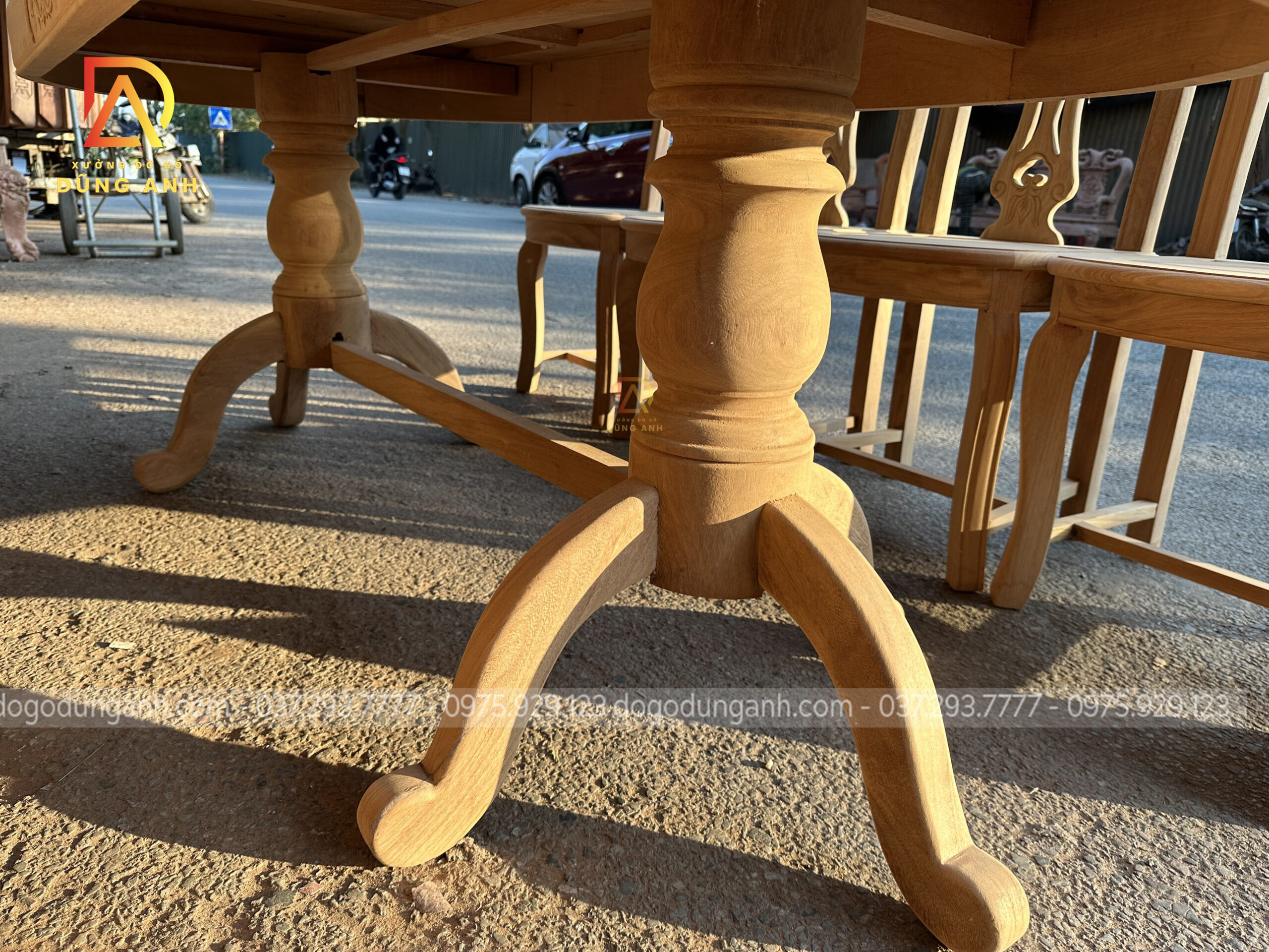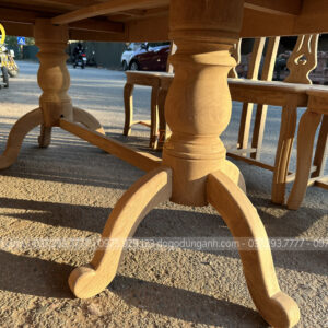 Chân trụ đôi tiện tròn với 3 chân nhỏ mỗi bên; liên kết với nhau bởi thanh gỗ ngang tạo thể khối vững chắc; phân chia trọng lực đồng đều, nâng cao khả năng chịu lực, cho bàn ăn thêm vững chãi.