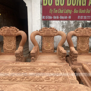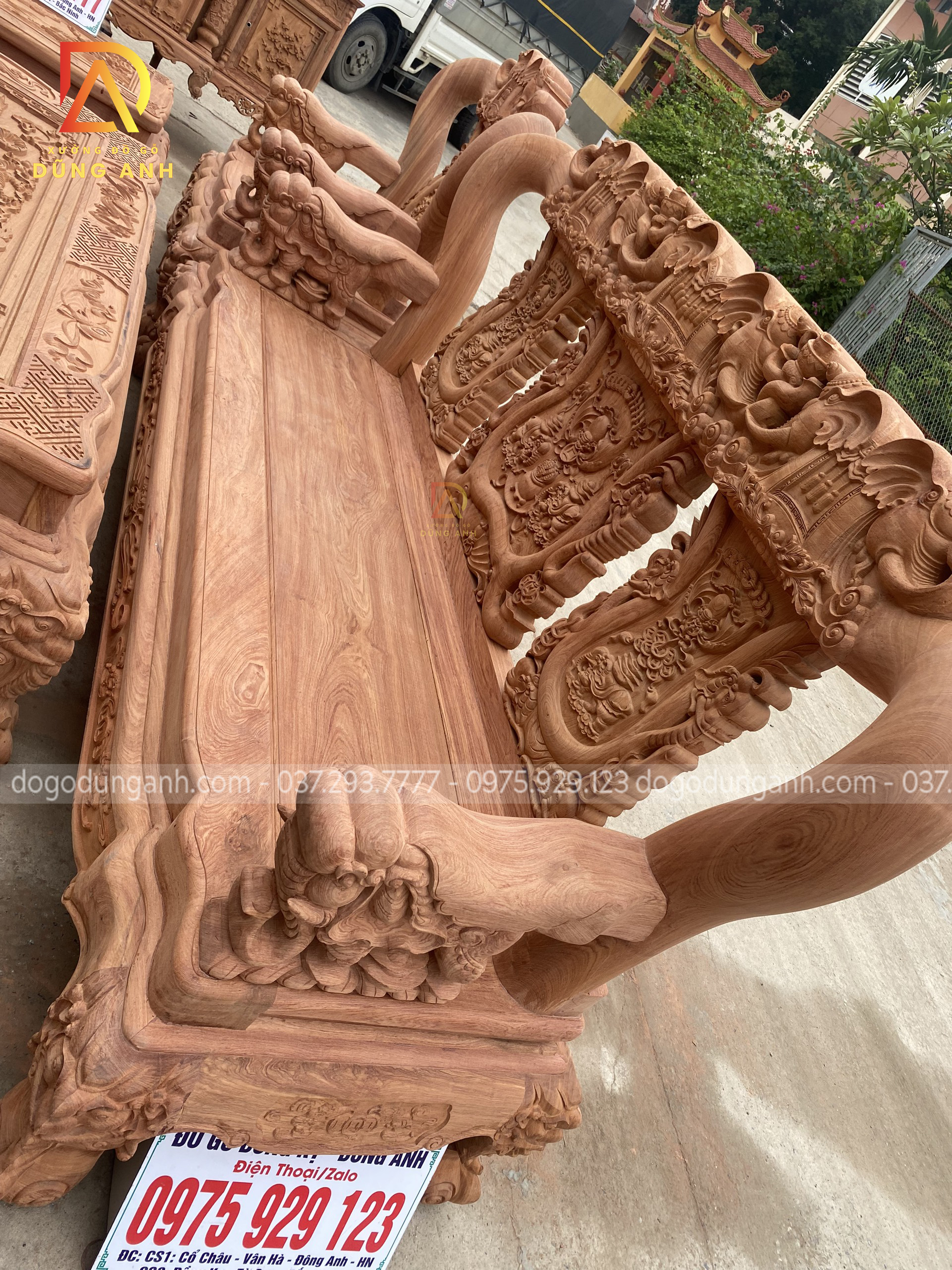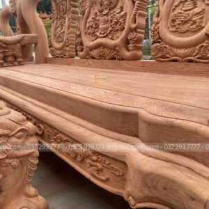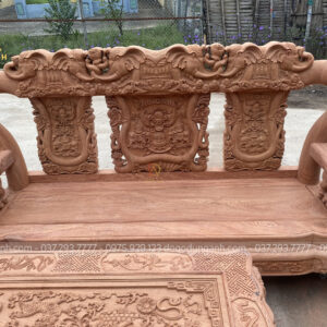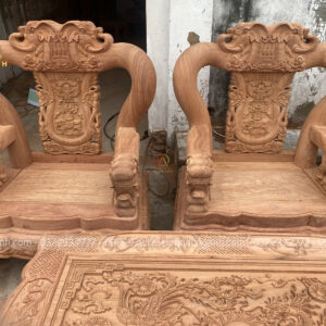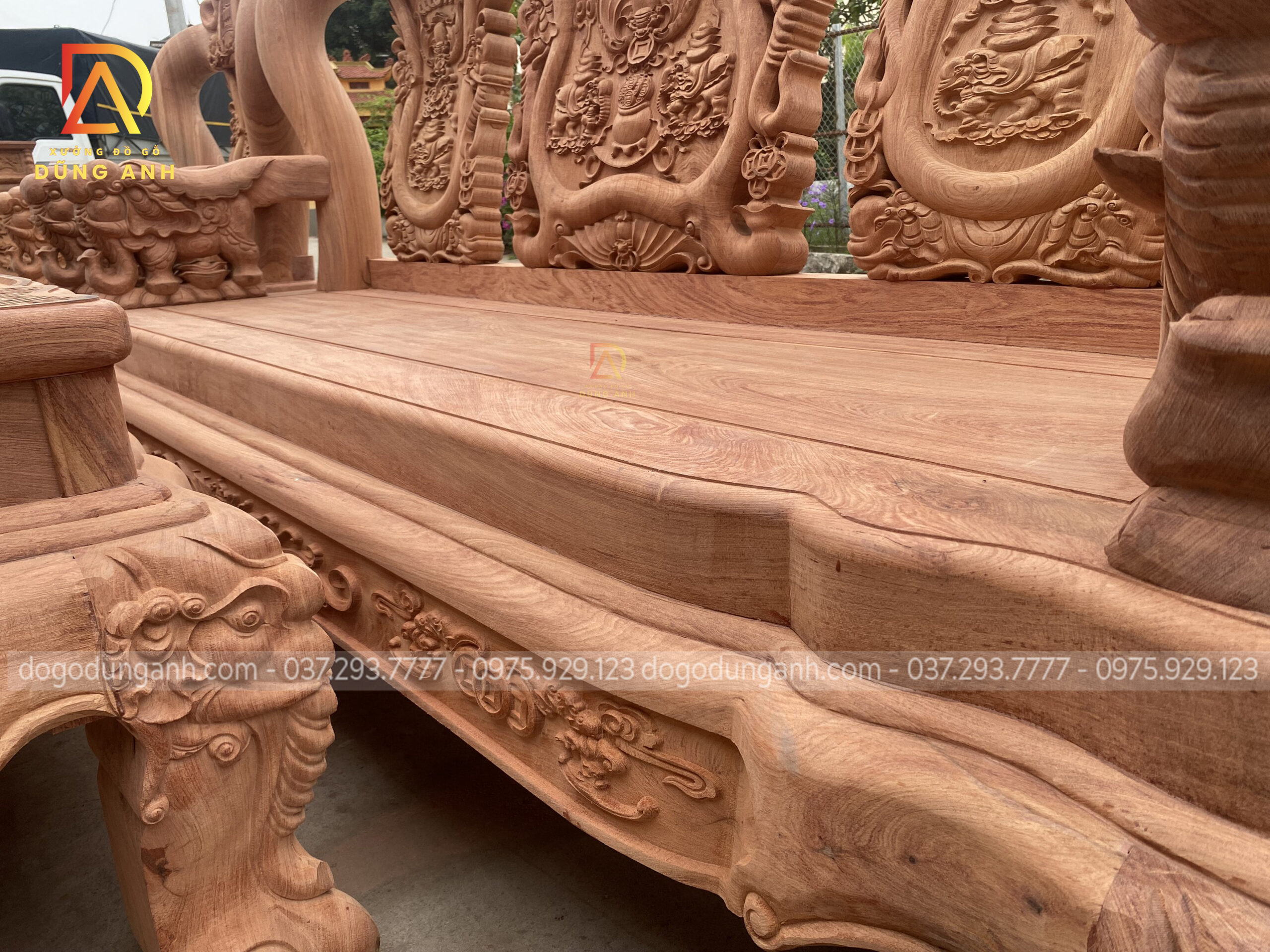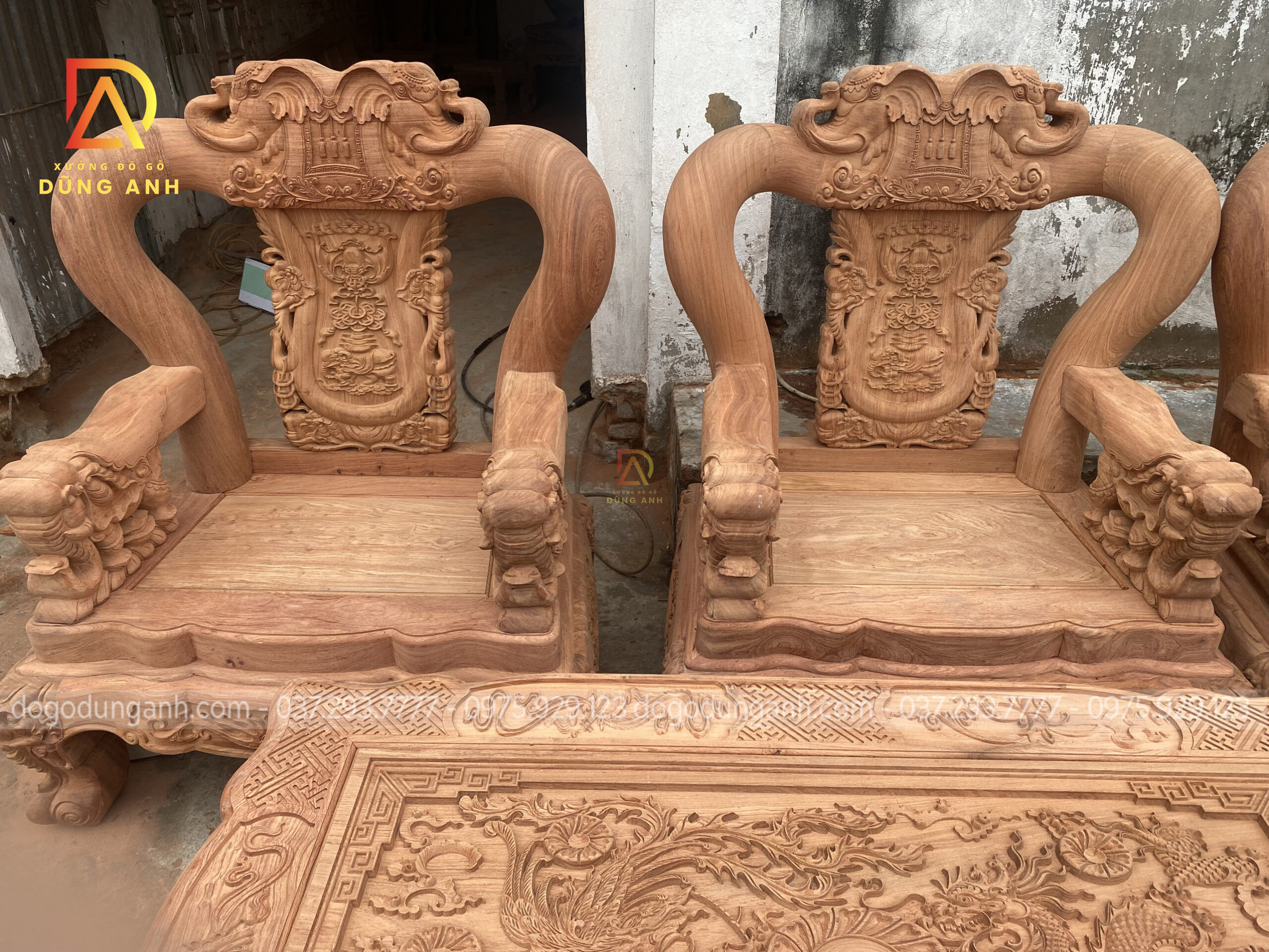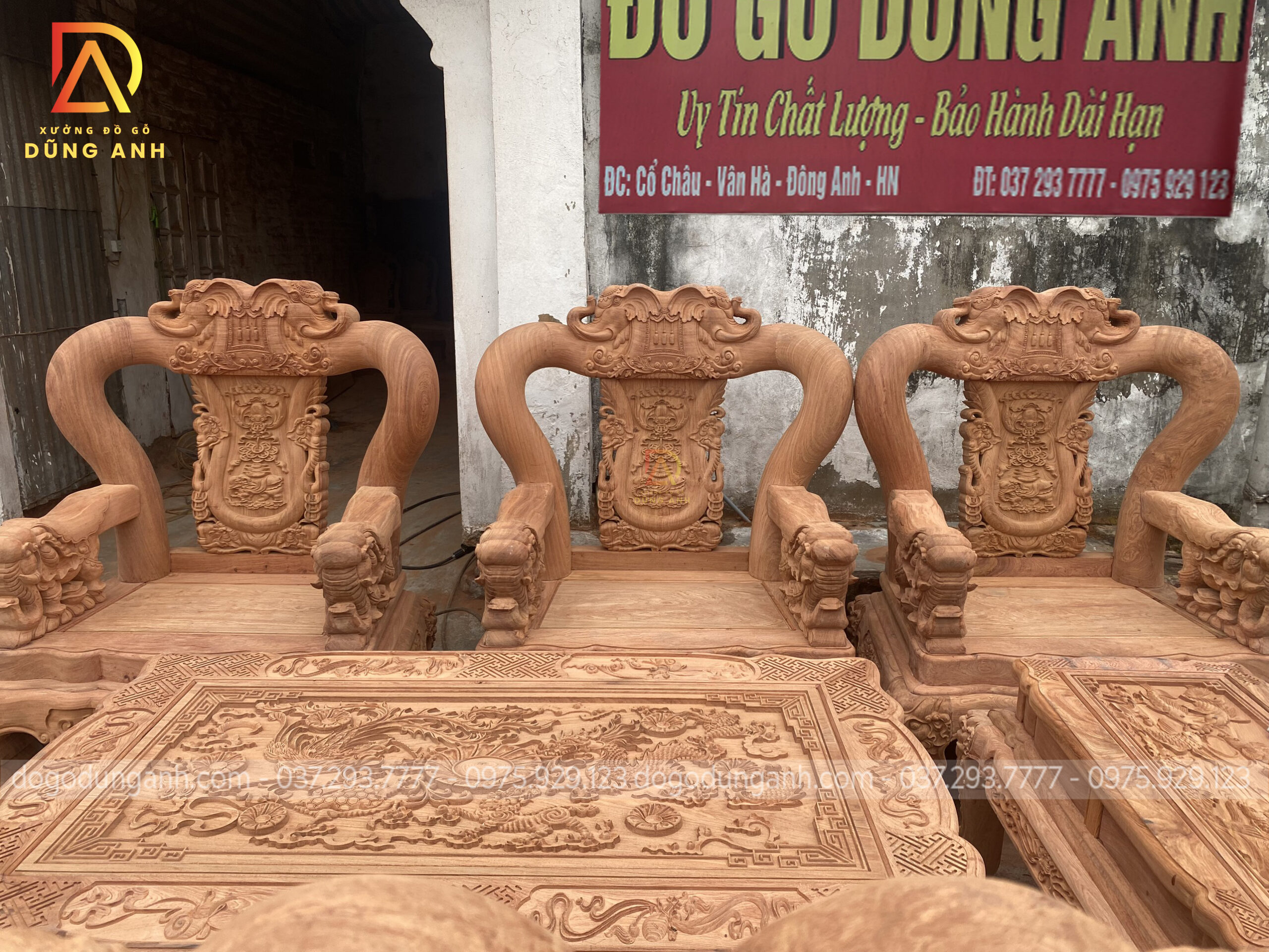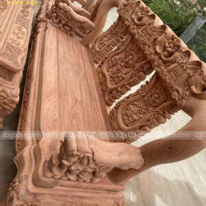 Bộ bàn ghế được chế tác thủ công tinh xảo trên nền chất liệu gỗ hương đá cao cấp không chỉ đảm bảo độ bền chắc lâu dài mà còn yếu tố tiền đề đề cho ra những họa tiết chạm khắc hoàn hảo nhất.