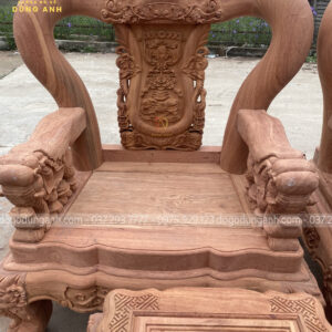 Bộ sản phẩm 7 món sẽ có 3 ghế đơn bề thế dáng trường cột to, chân 16 hàng 3 tầng cổ chỉ sen dẹo đẹp mắt vô cùng hoành tráng tựa như ngai vàng của các vua chúa thời xưa đầy uy nghi và tráng lệ.