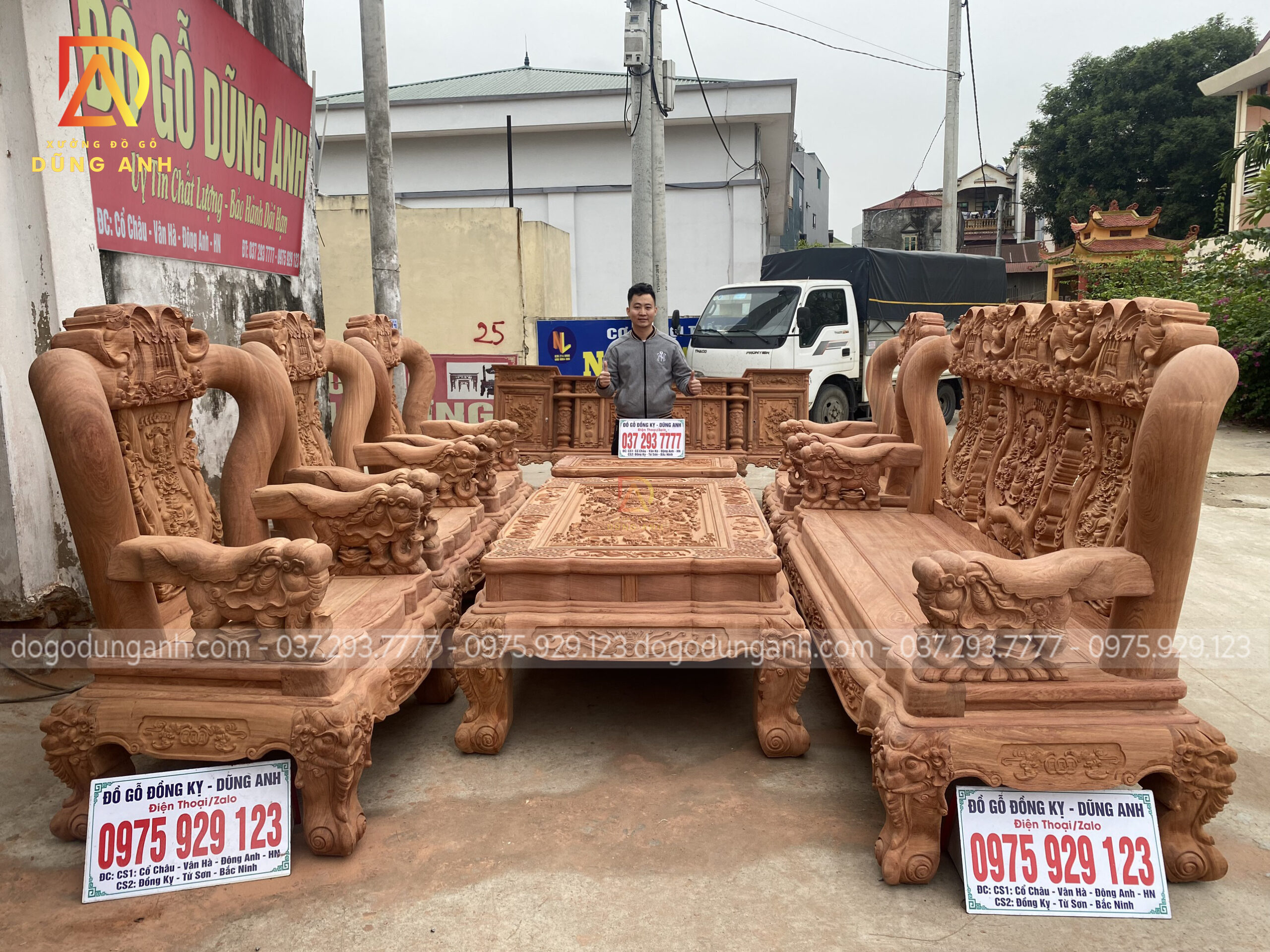 Để cho khách hàng thấy được chất lượng gỗ vượt trội cùng độ tinh xảo, sắc nét của các chi tiết đục tay thủ công. Nên Xưởng đồ gỗ Dũng Anh xin trình làng bản mộc hoàn thiện siêu víp của mẫu bàn ghế nghê đỉnh 7 món cột 16 gỗ hương đá hàng đặt của anh Đức ở Vĩnh Phúc. Bộ sản phẩm đã được anh trực tiếp xuống kiểm tra mộc và vô cùng ưng ý. Mời các bác cùng chiêm ngưỡng