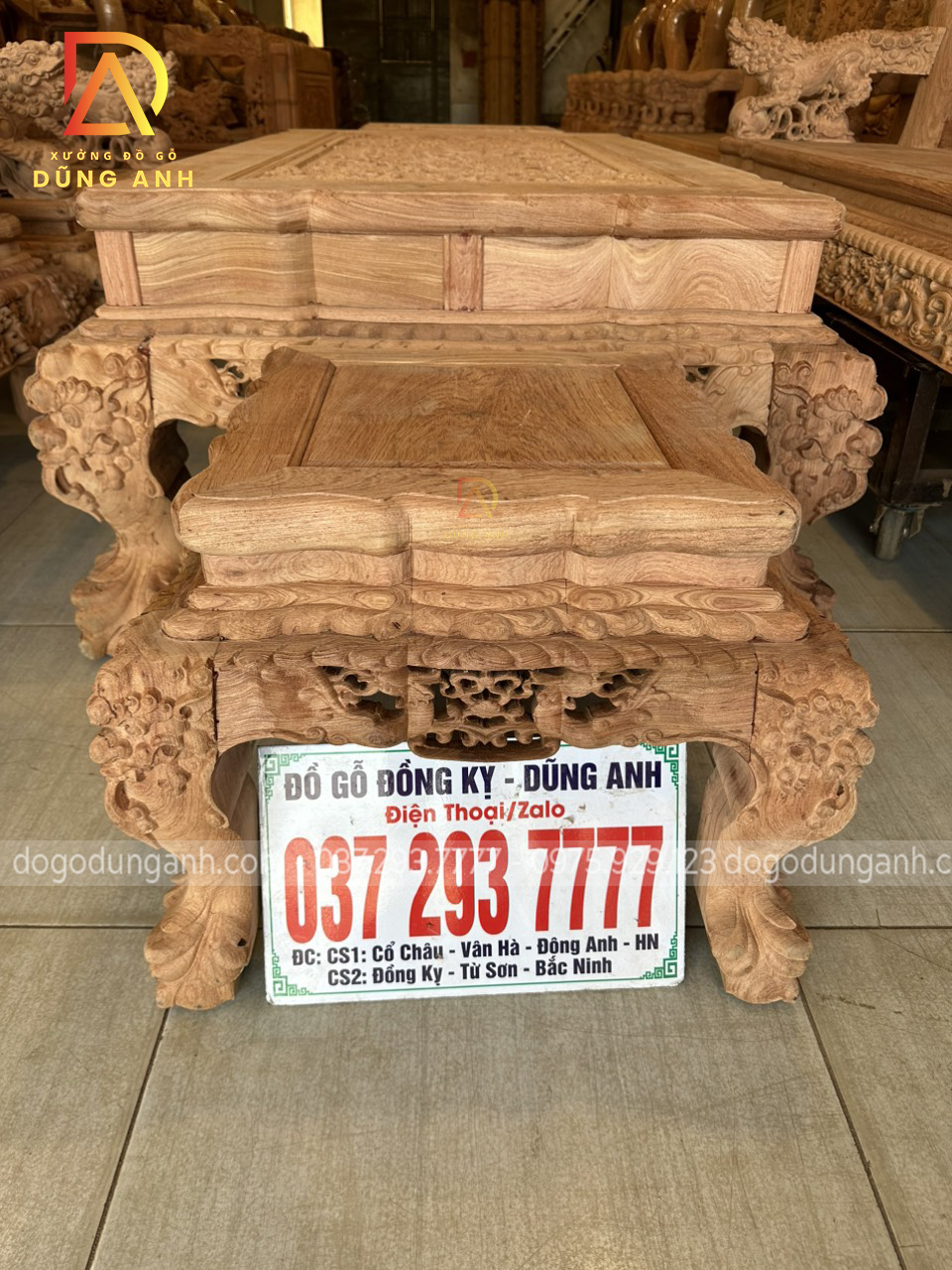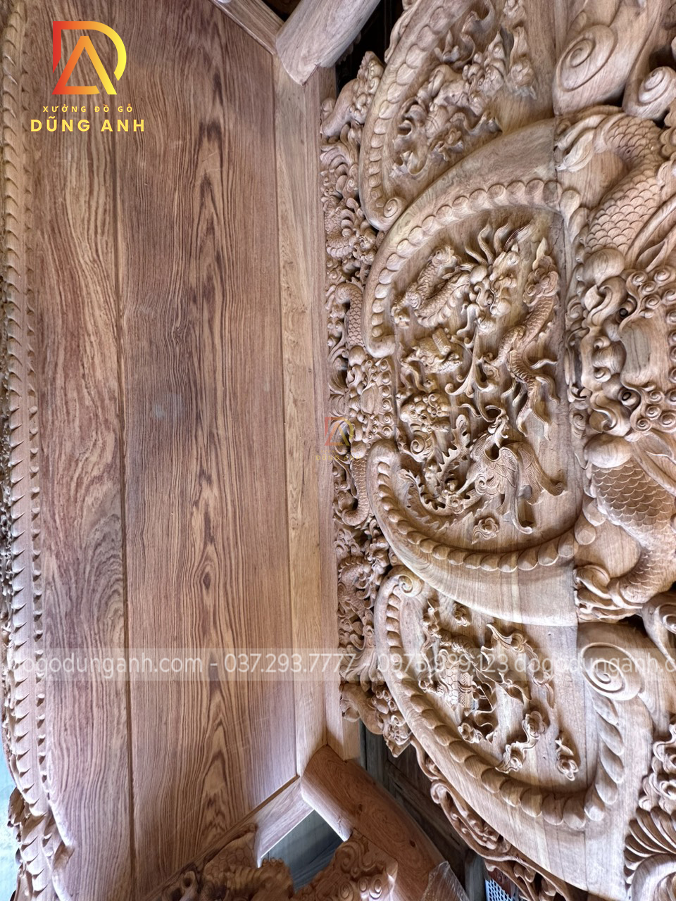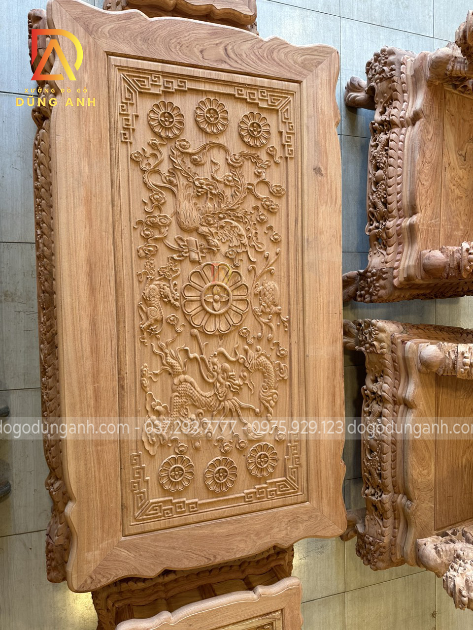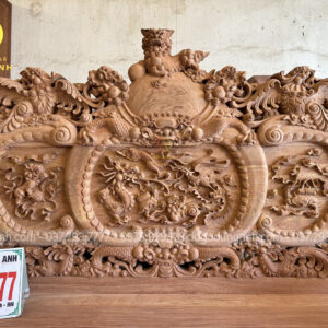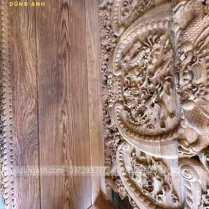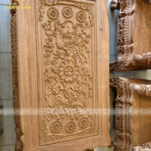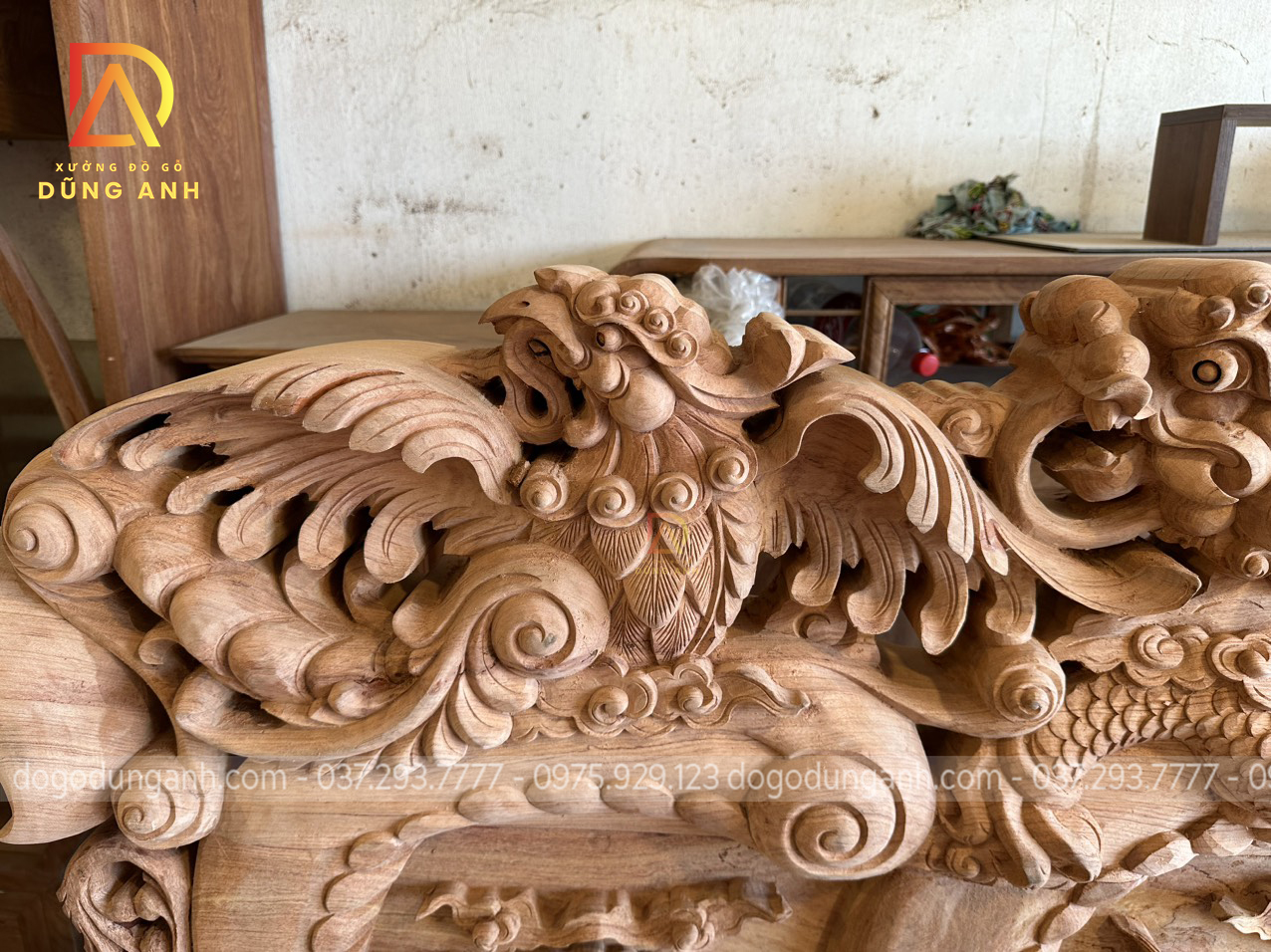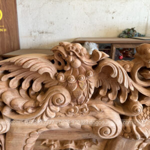 Đoản dài dáng trường chương liền tấm dày 15cm đục nghê 3 đầu bảo đỉnh ở giữa cùng đôi phượng hóa hai bên, họa tiết đục tay 100% nên có độ sắc nét kênh bong 3D vô cùng nổi bật, khác hẳn với những bộ đục máy sửa tay thông thường.