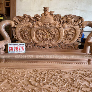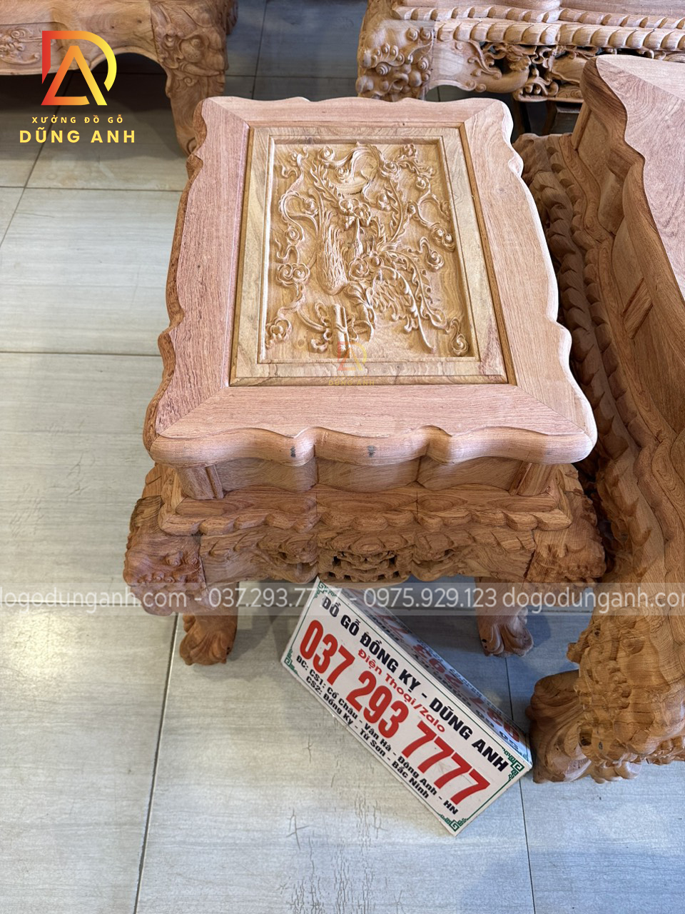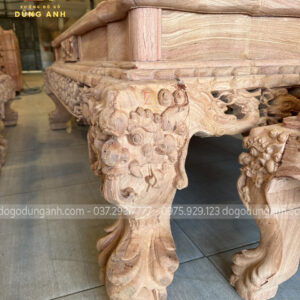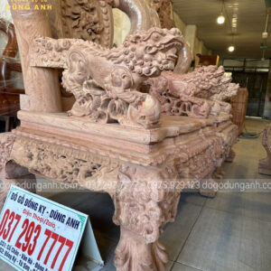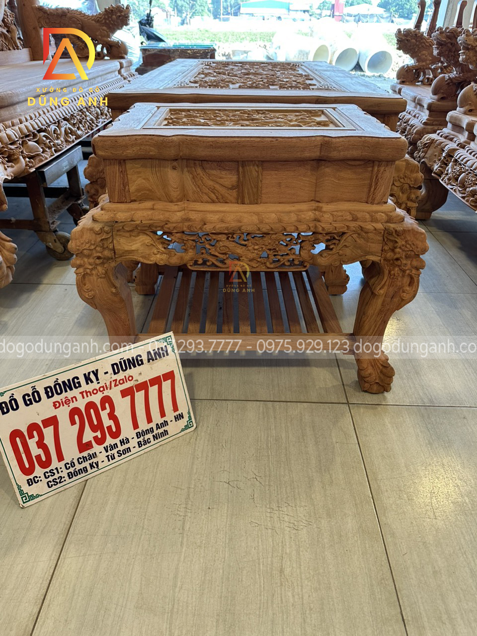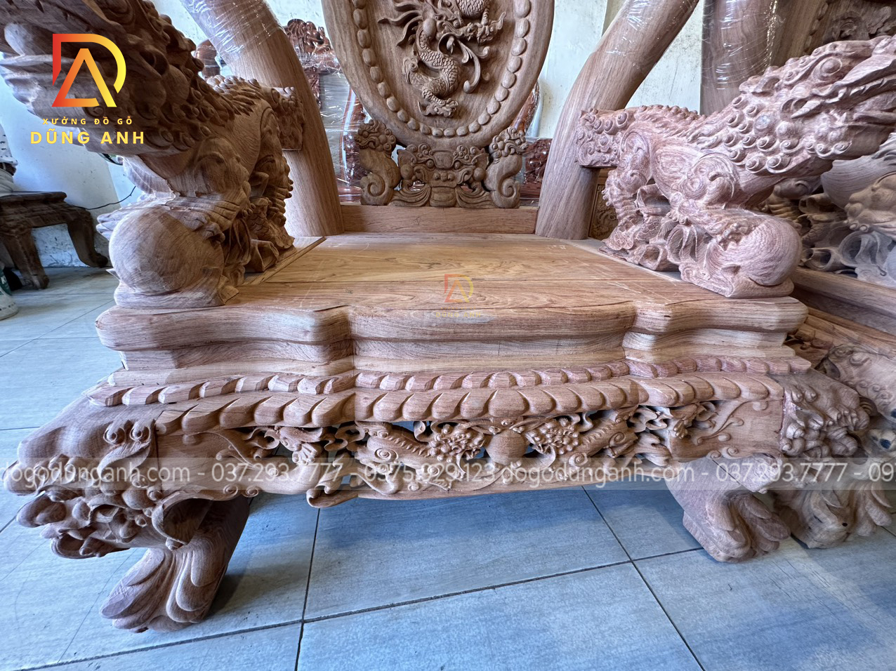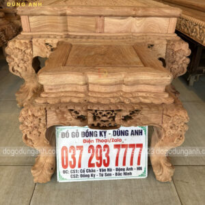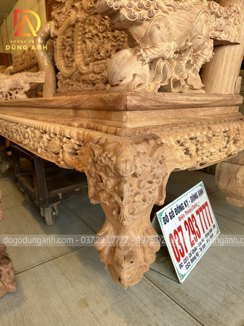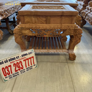 Đoản dài dáng trường chương liền tấm dày 15cm đục nghê 3 đầu bảo đỉnh ở giữa cùng đôi phượng hóa hai bên, họa tiết đục tay 100% nên có độ sắc nét kênh bong 3D vô cùng nổi bật, khác hẳn với những bộ đục máy sửa tay thông thường.