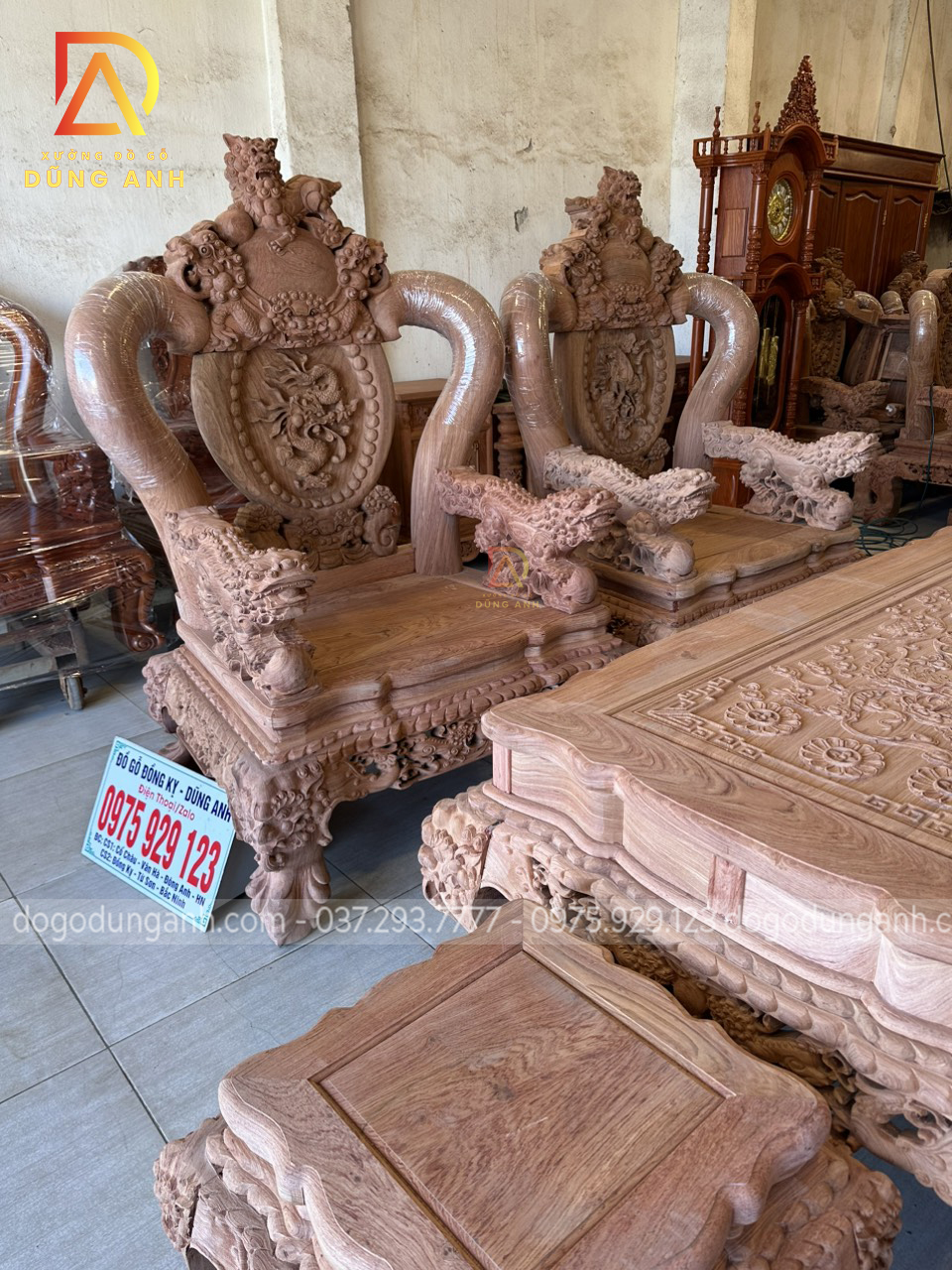Bộ bàn ghế của anh Phùng hiện đã dựng xong mộc, xưởng chụp lại ảnh để thông báo tiến độ với anh. Sau đó sẽ được tiến hành gia công kỹ từng chi tiết đục rồi mới cho vào phủ PU lên màu theo yêu cầu của chủ nhân.