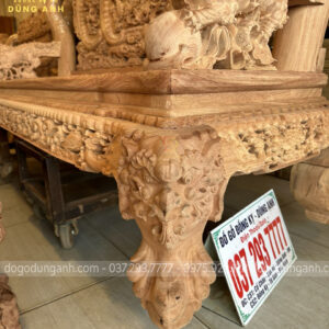 Mặt bàn đục tranh tứ linh hội tụ sâu xuống 1.5cm trên nền gỗ liền tấm. Yếm bàn, yếm ghế đủ 6cm đục sâu họa tiết nghê vờn cầu, đục 3 tầng cổ chỉ, hai tầng sen dẹo, khung tranh dày 5cm được làm bo cong soi tứ diện bàn
