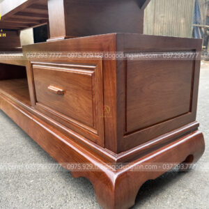 Thiết kế bàn trà chữ nhật mặt khung tranh ván liền vuông vắn lại được thiết kế hai tầng với 1 bên có ngăn kéo rộng rãi tạo không gian để đồ dùng thoải mái cho gia đình.