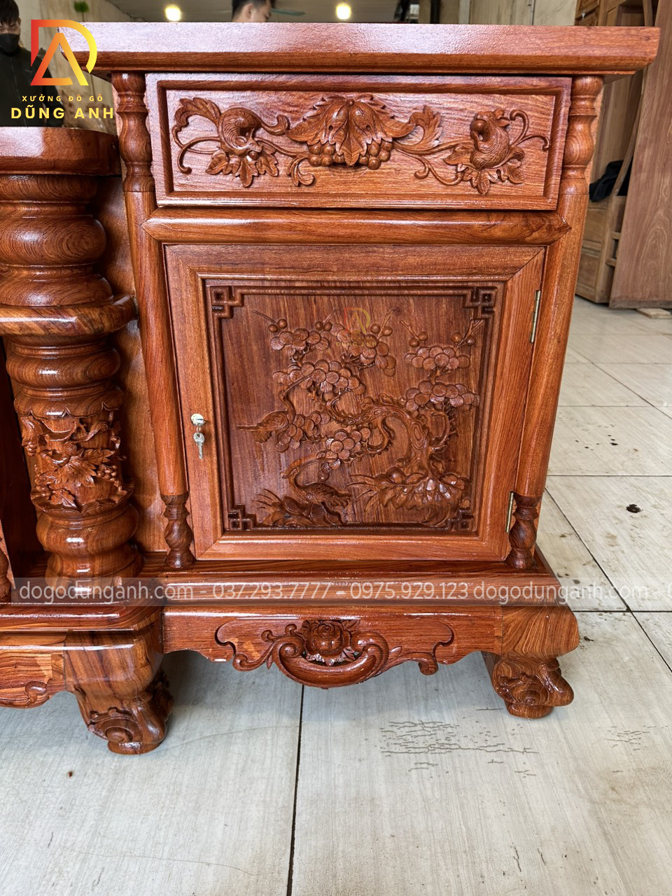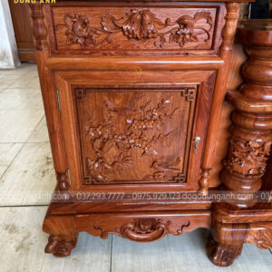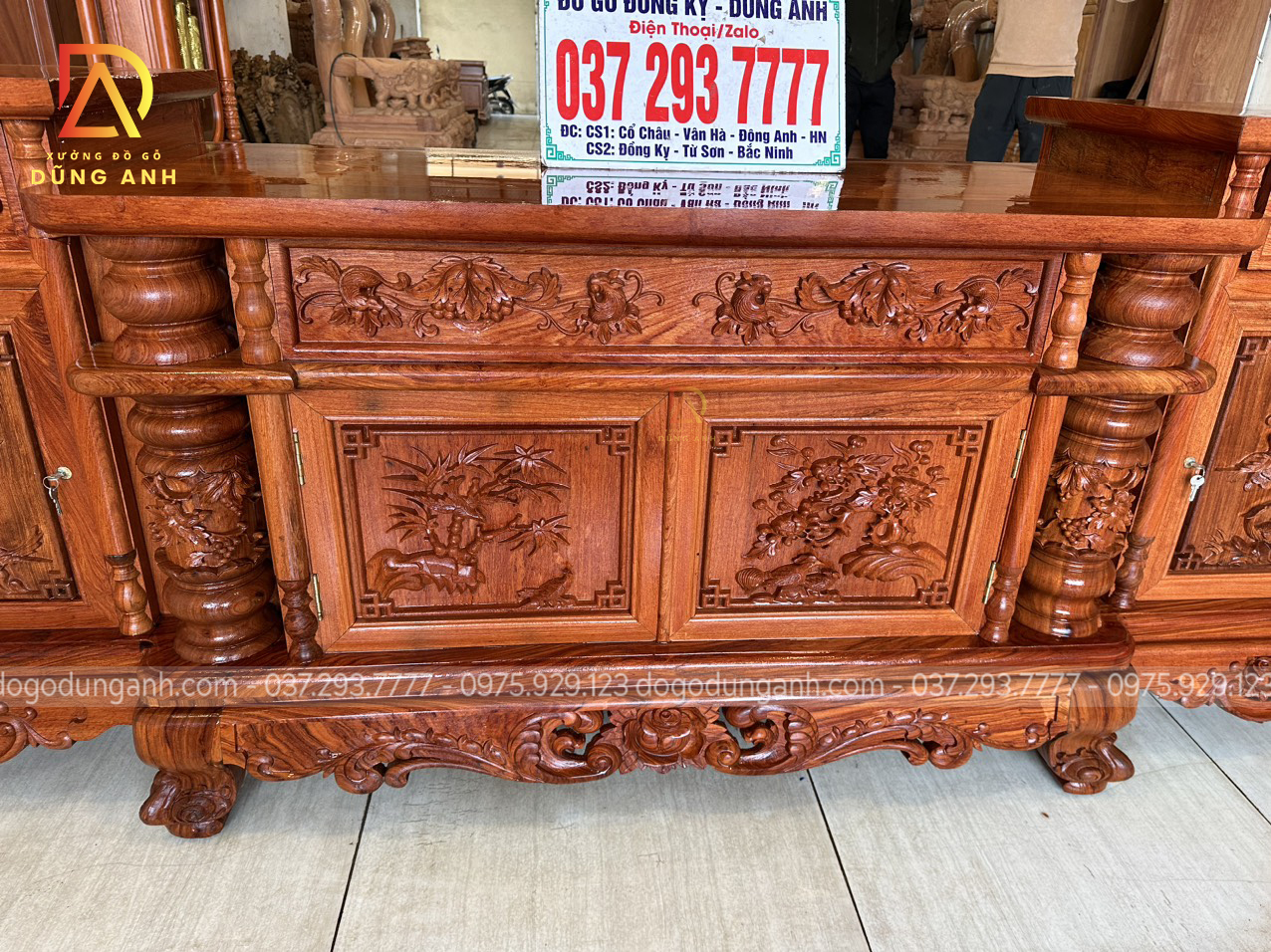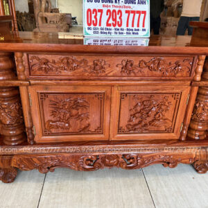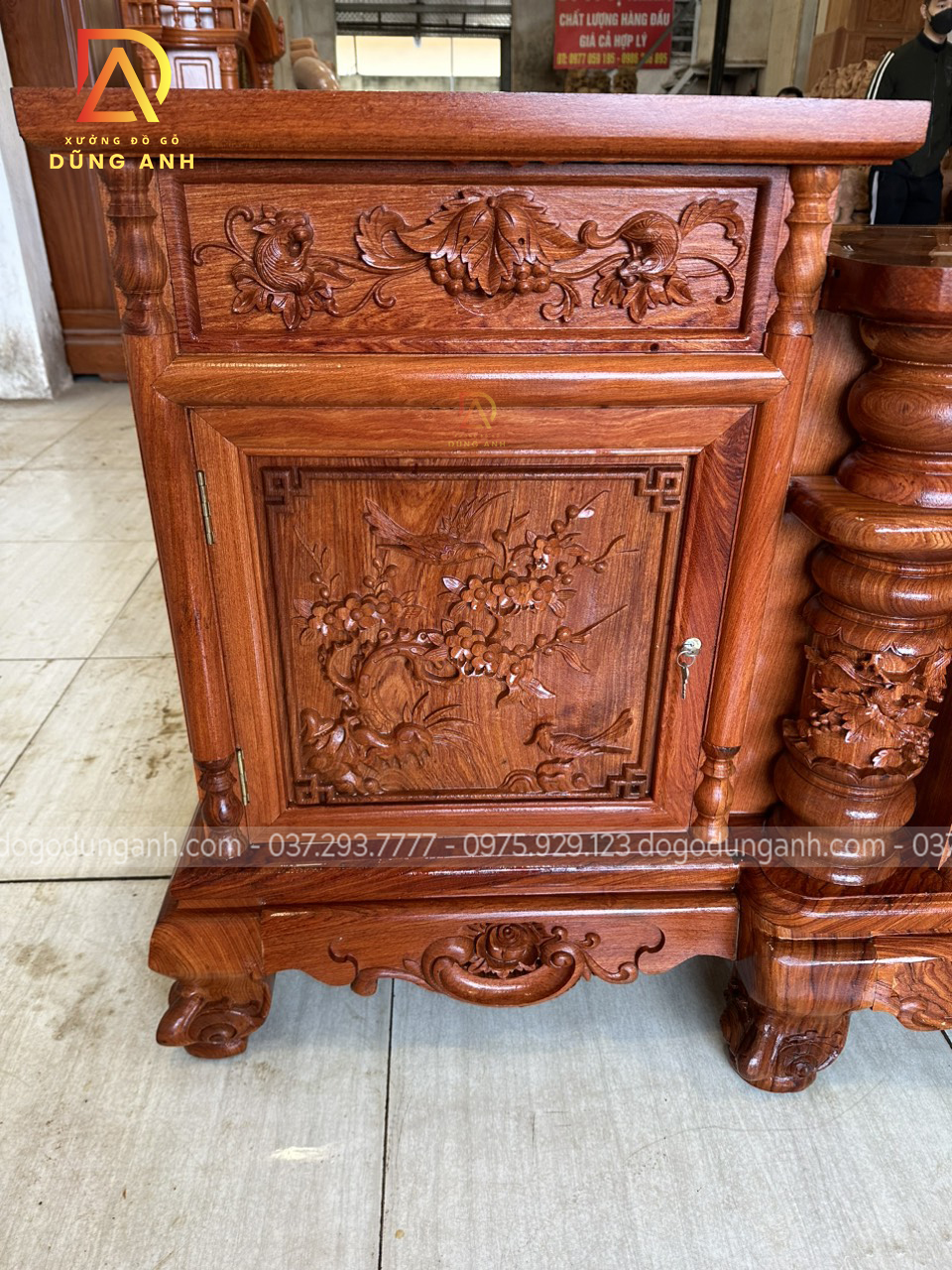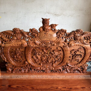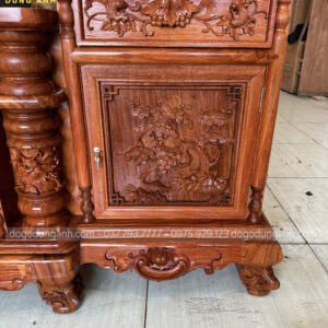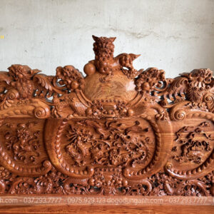 Cột 2 bên tiện tròn bề thế đục giàn nho con sóc sống động – Ô vách 2 bên đục bình hoa hồng và bình hoa sen nở rộ cực đẹp mắt càng tôn lên nét đẹp cầu kỳ, sang trọng cho sản phẩm.