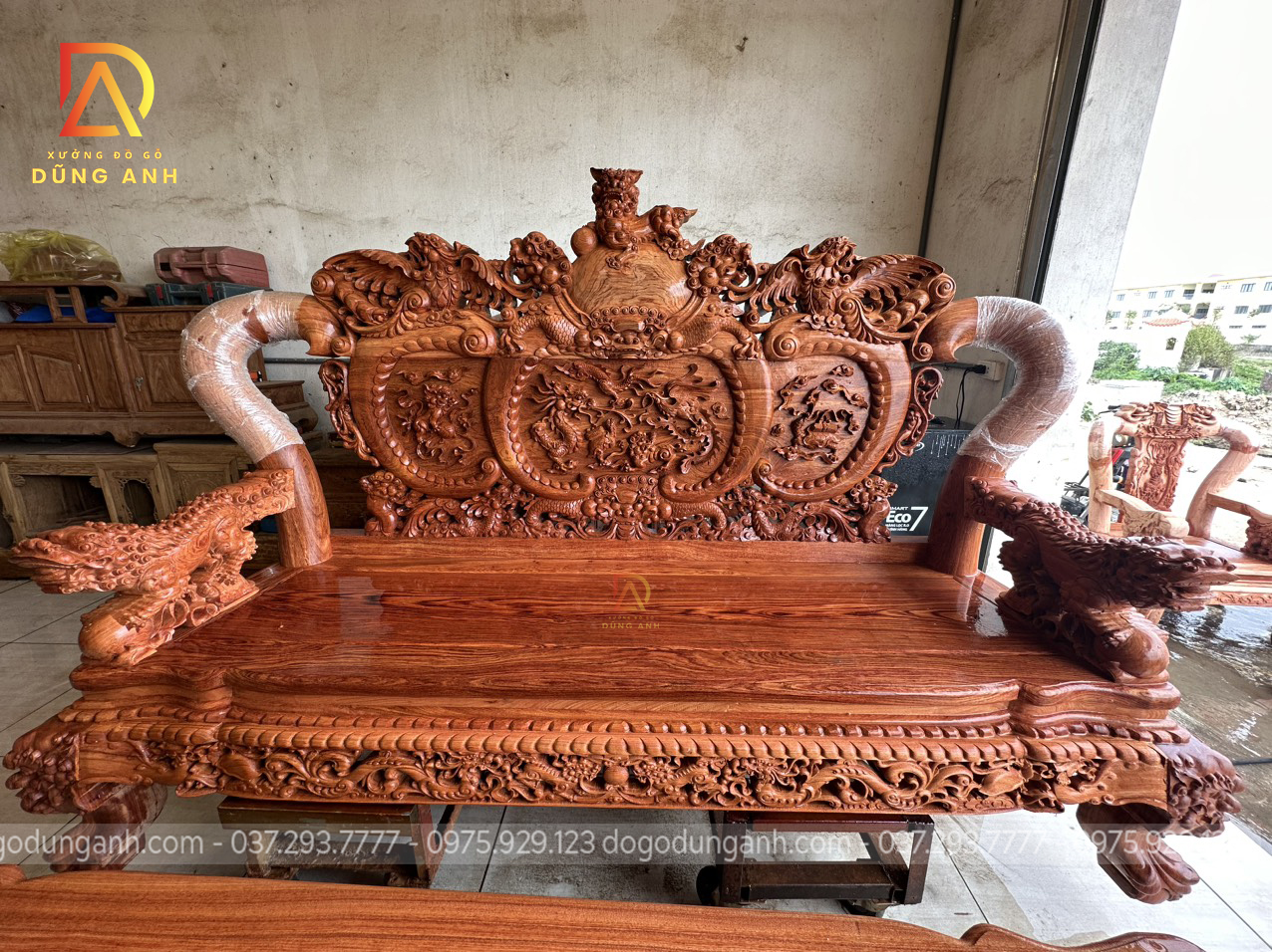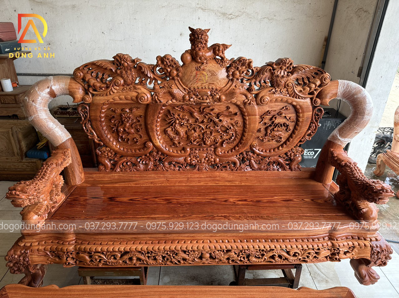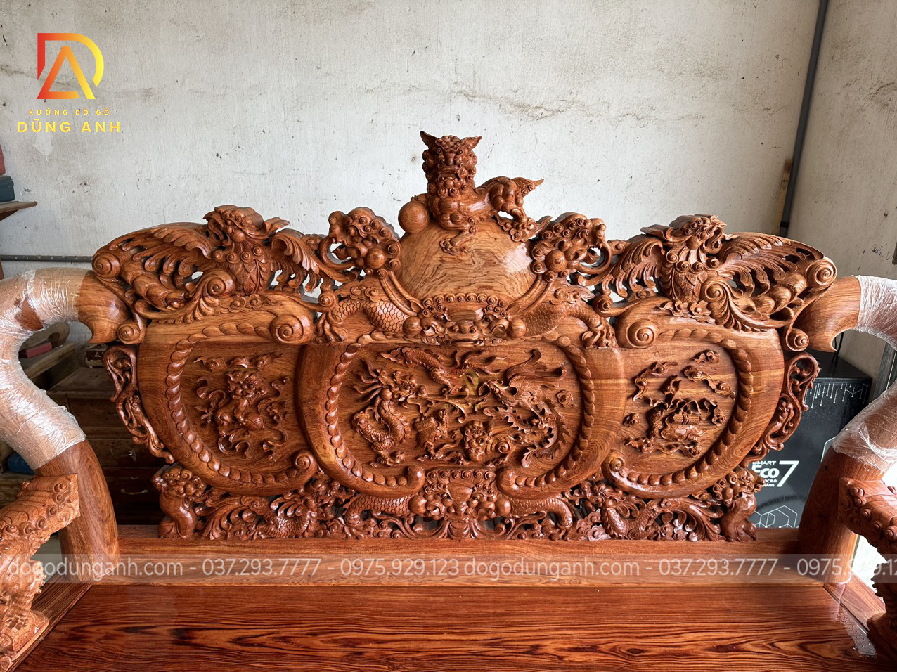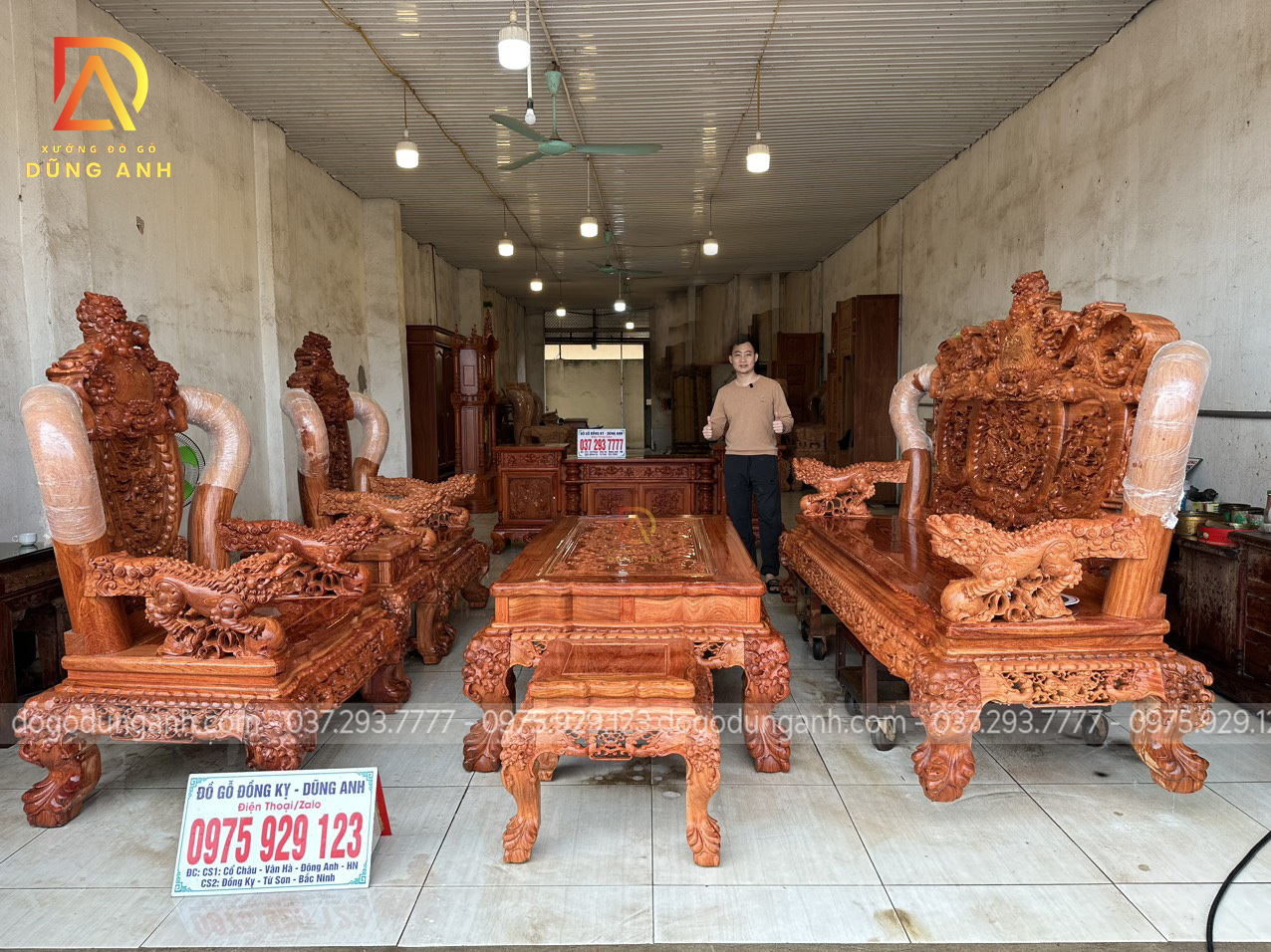 Thứ ba, bộ sản phẩm có kích thước to cục bộ. Hàng dày dặn kích thước lớn hơn so với hàng ngoài thị trườn. Khuôn tranh 4, ván 2, vách 2, yếm 6. Hàng trôi nổi thường thì sẽ là khuôn tranh 2.5, ván 1, vách 1, yếm 2. Dễ thấy nhất trong ảnh là tay cột nguyên khối, đường kính lên tới 14 cm, thuộc dòng sản phẩm siêu vip của Xưởng đồ gỗ Dũng Anh. Đặc biệt nhất là sản phẩm bộ ghế được đục chạm hai mặt, thợ đục thiếu kinh nghiệm không dám nhận.