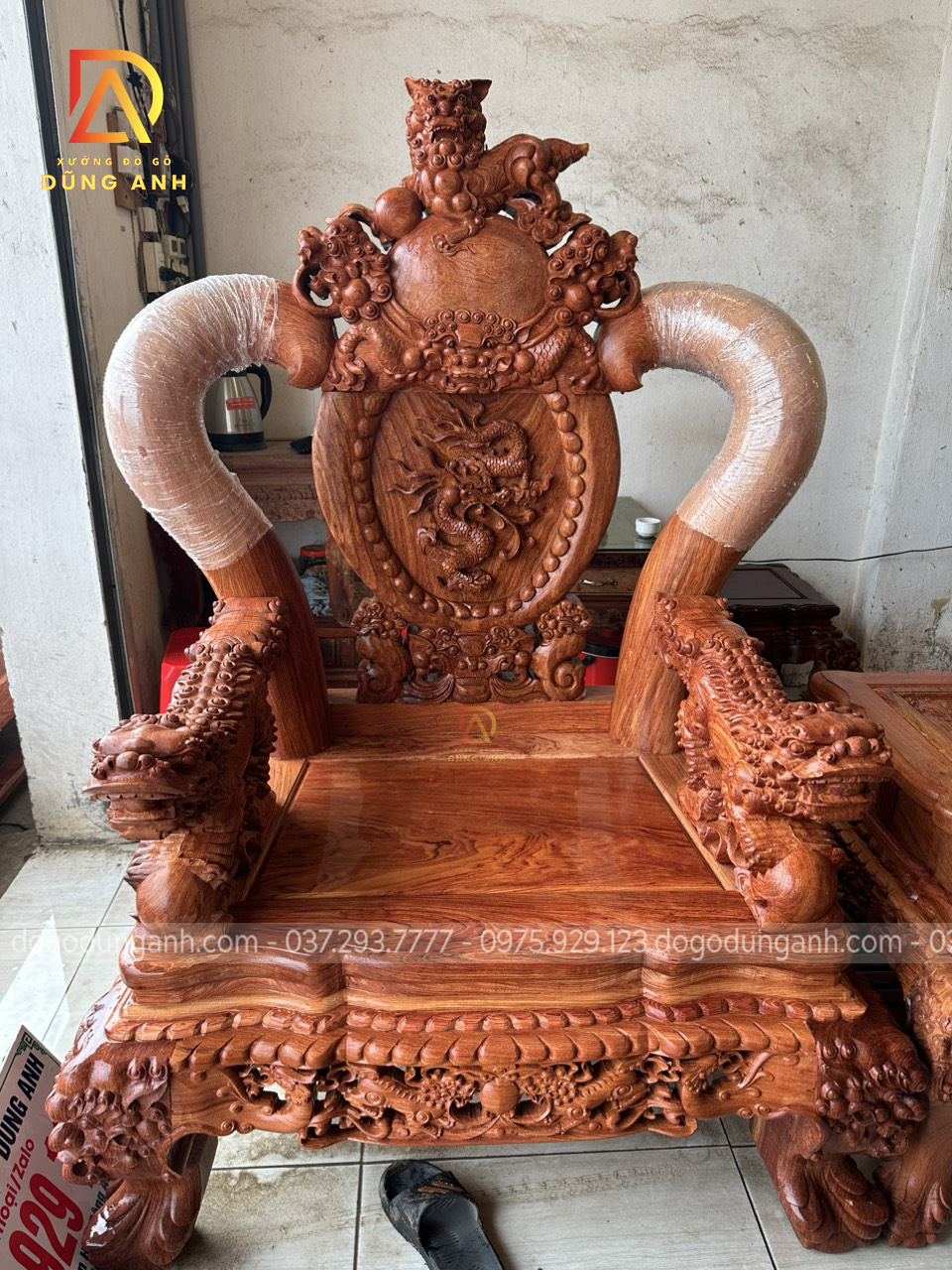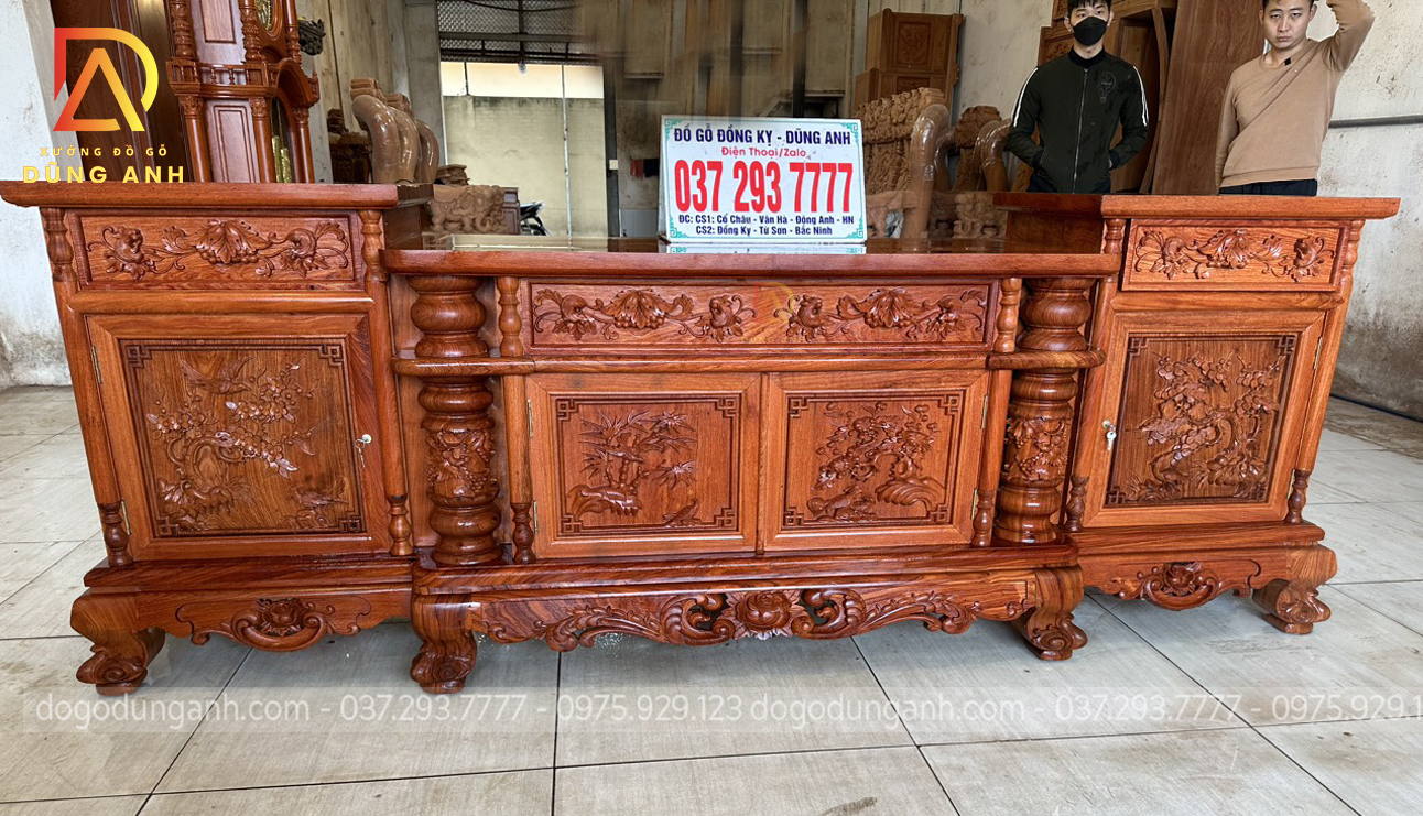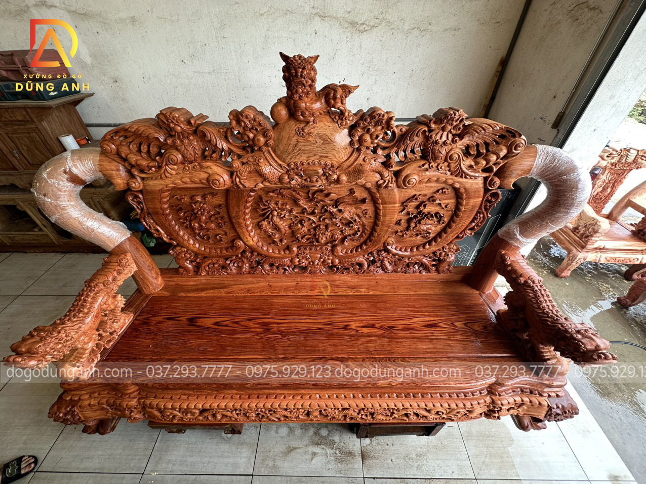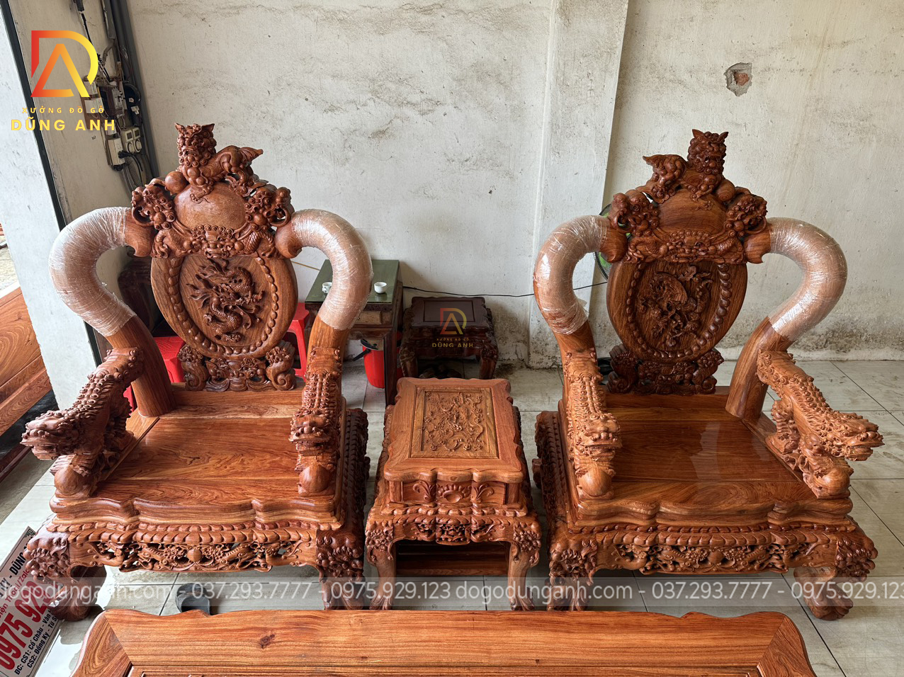 Thứ ba, bộ sản phẩm có kích thước to cục bộ. Hàng dày dặn kích thước lớn hơn so với hàng ngoài thị trườn. Khuôn tranh 4, ván 2, vách 2, yếm 6. Hàng trôi nổi thường thì sẽ là khuôn tranh 2.5, ván 1, vách 1, yếm 2. Dễ thấy nhất trong ảnh là tay cột nguyên khối, đường kính lên tới 14 cm, thuộc dòng sản phẩm siêu vip của Xưởng đồ gỗ Dũng Anh. Đặc biệt nhất là sản phẩm bộ ghế được đục chạm hai mặt, thợ đục thiếu kinh nghiệm không dám nhận.