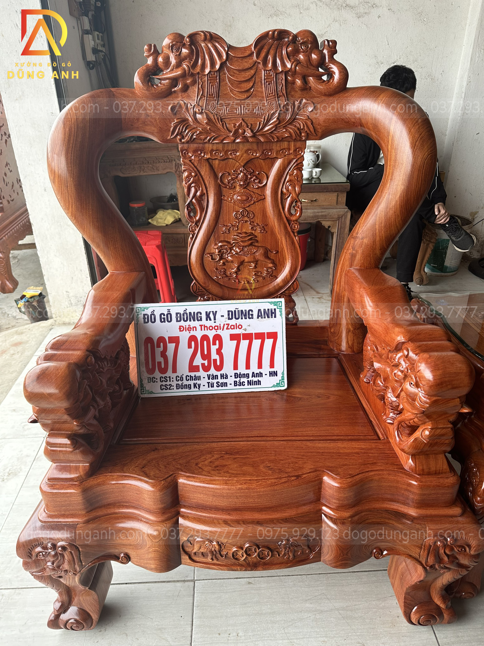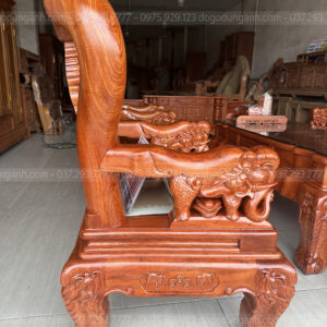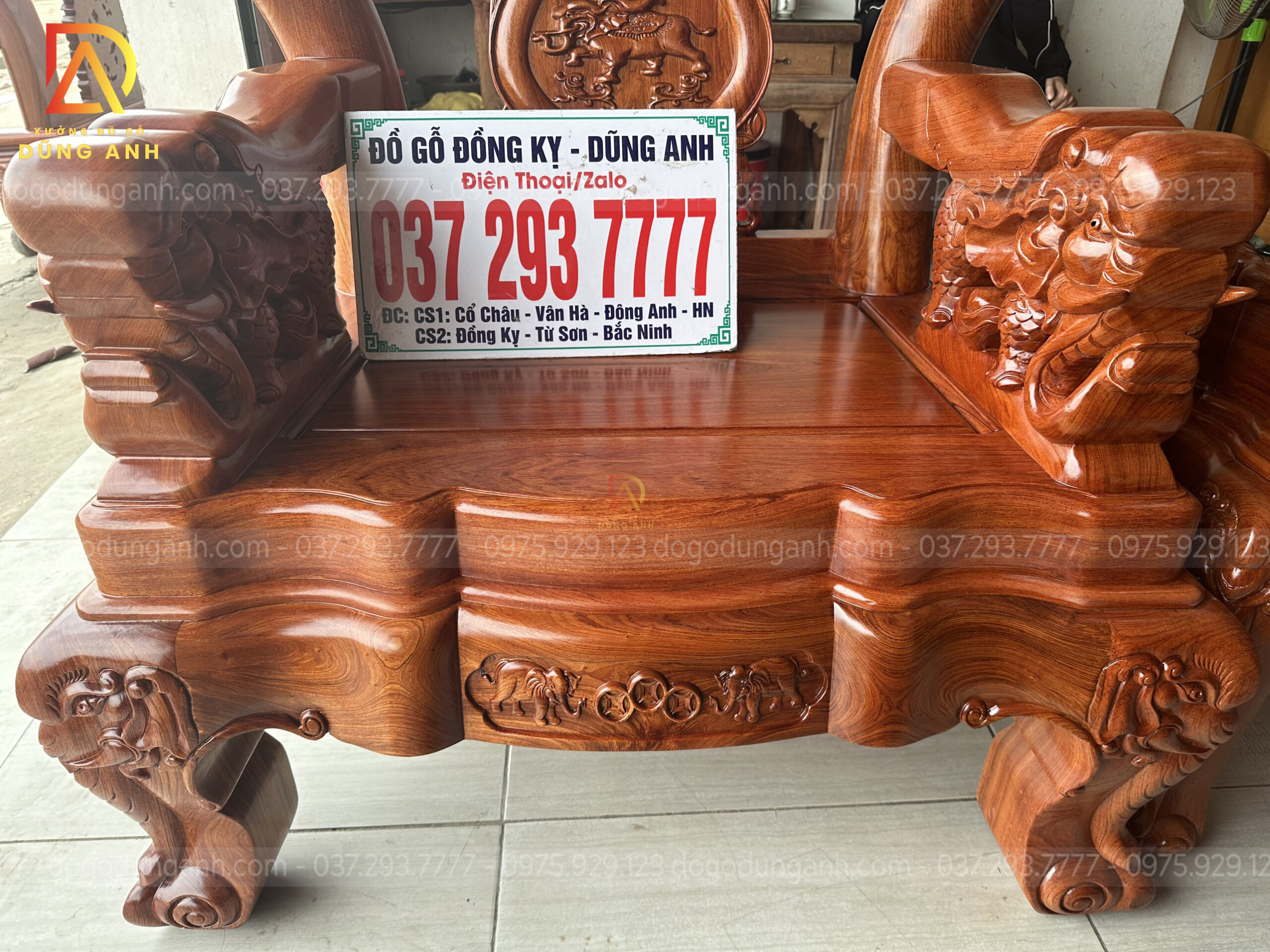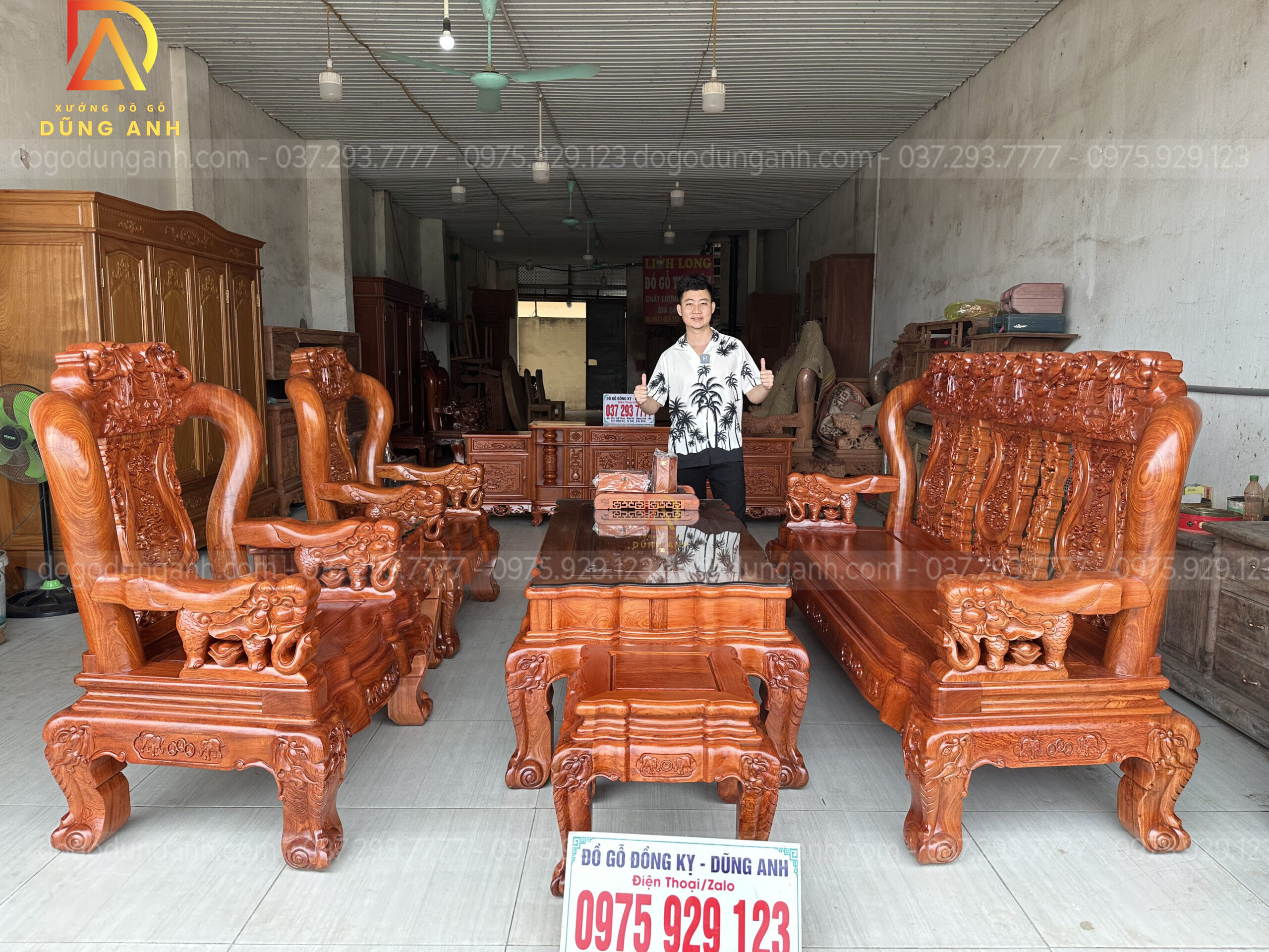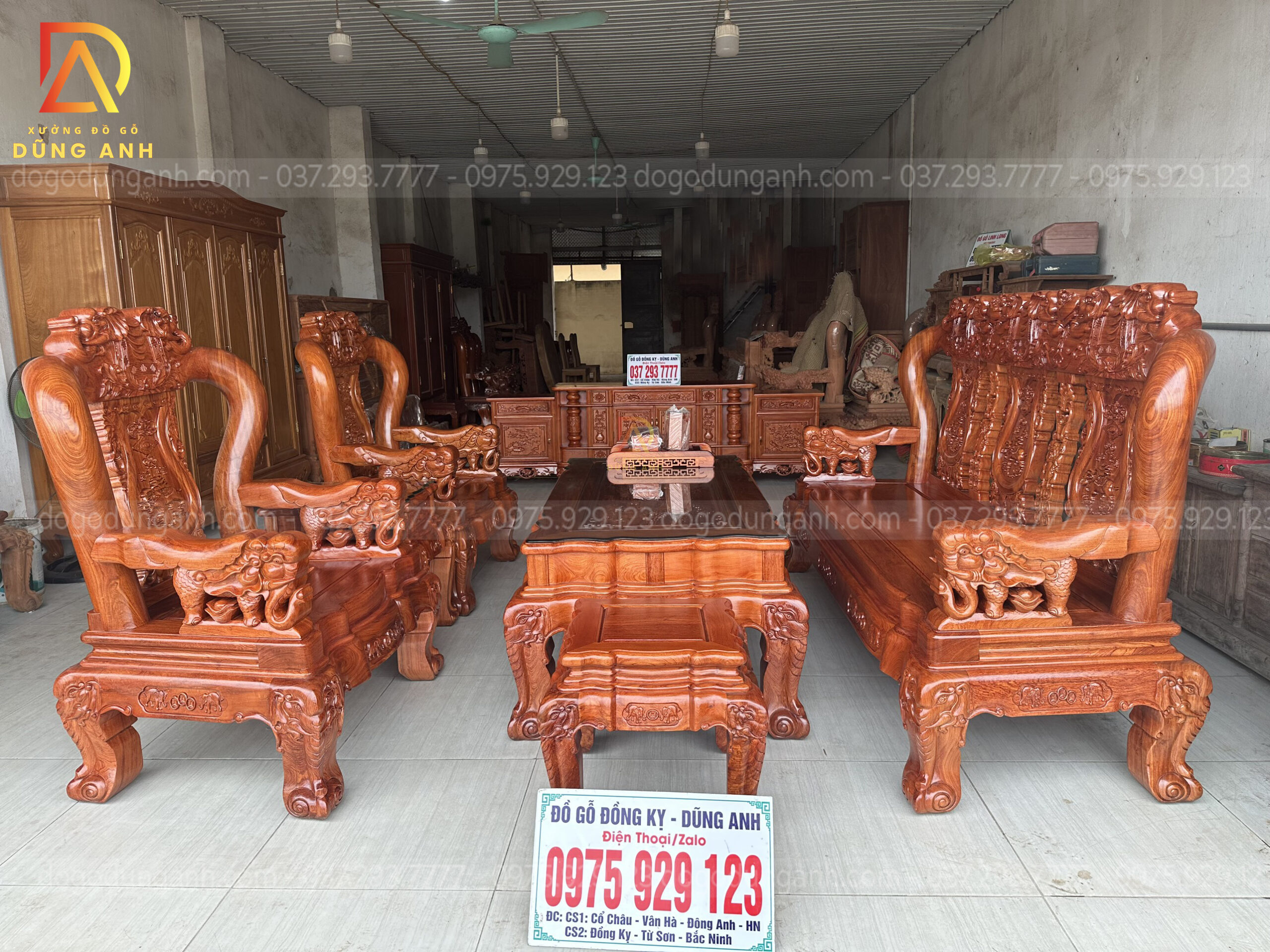 Bộ bàn ghế được hoàn thiện trau chuốt vô cùng tỉ mỉ với hình tượng voi chiến và sơn phủ bóng Pu gam màu nổi bật mang lại vẻ đẹp sang trọng mà ấm cúng cho không gian phòng khách. Xin mời quý vị cùng chiêm ngưỡng sản phẩm tạm trưng bày tại xưởng.