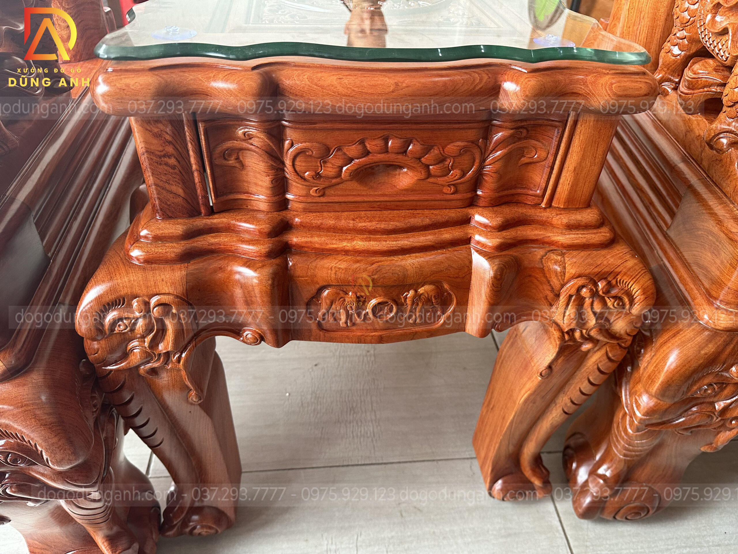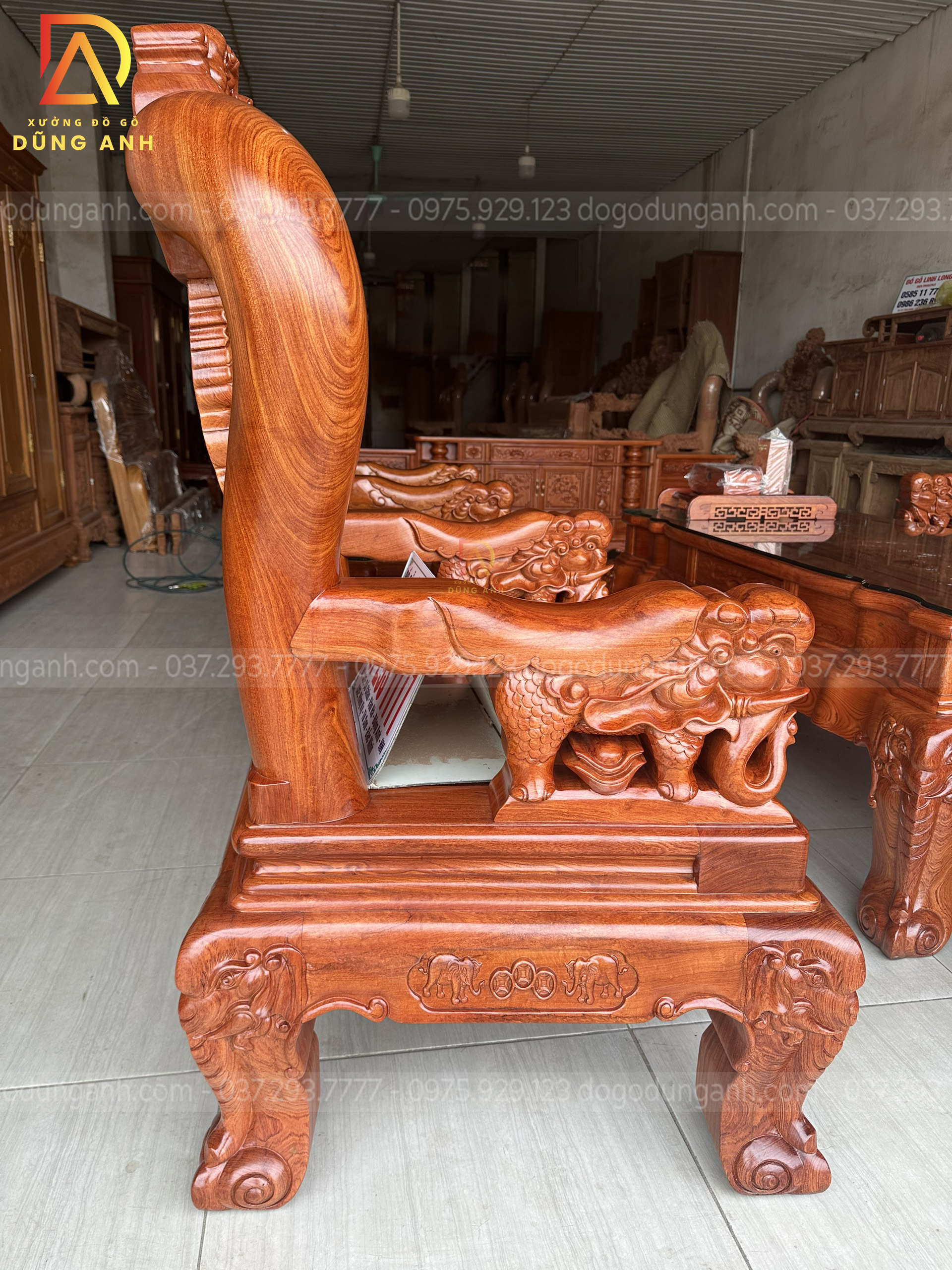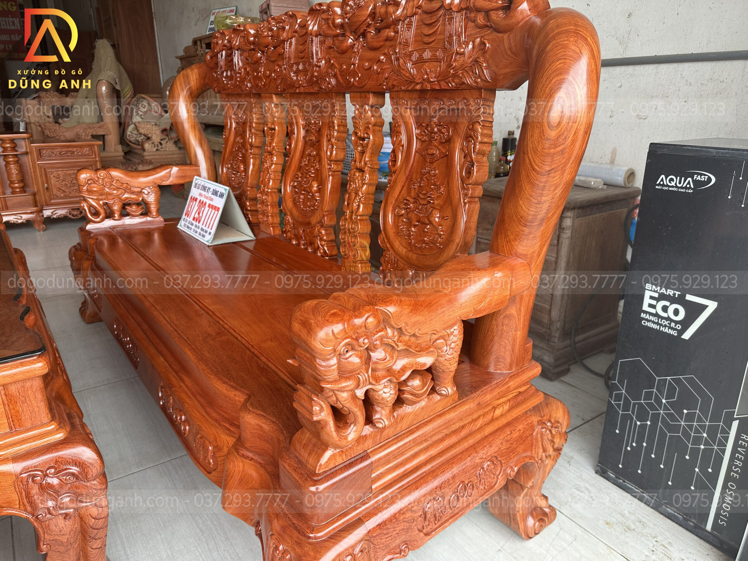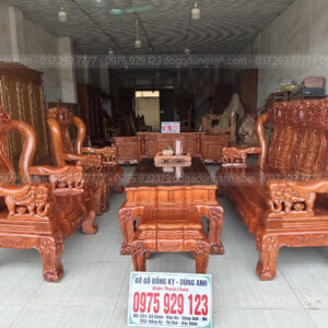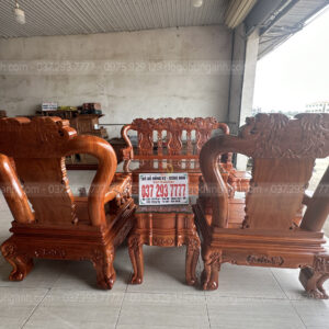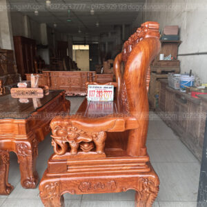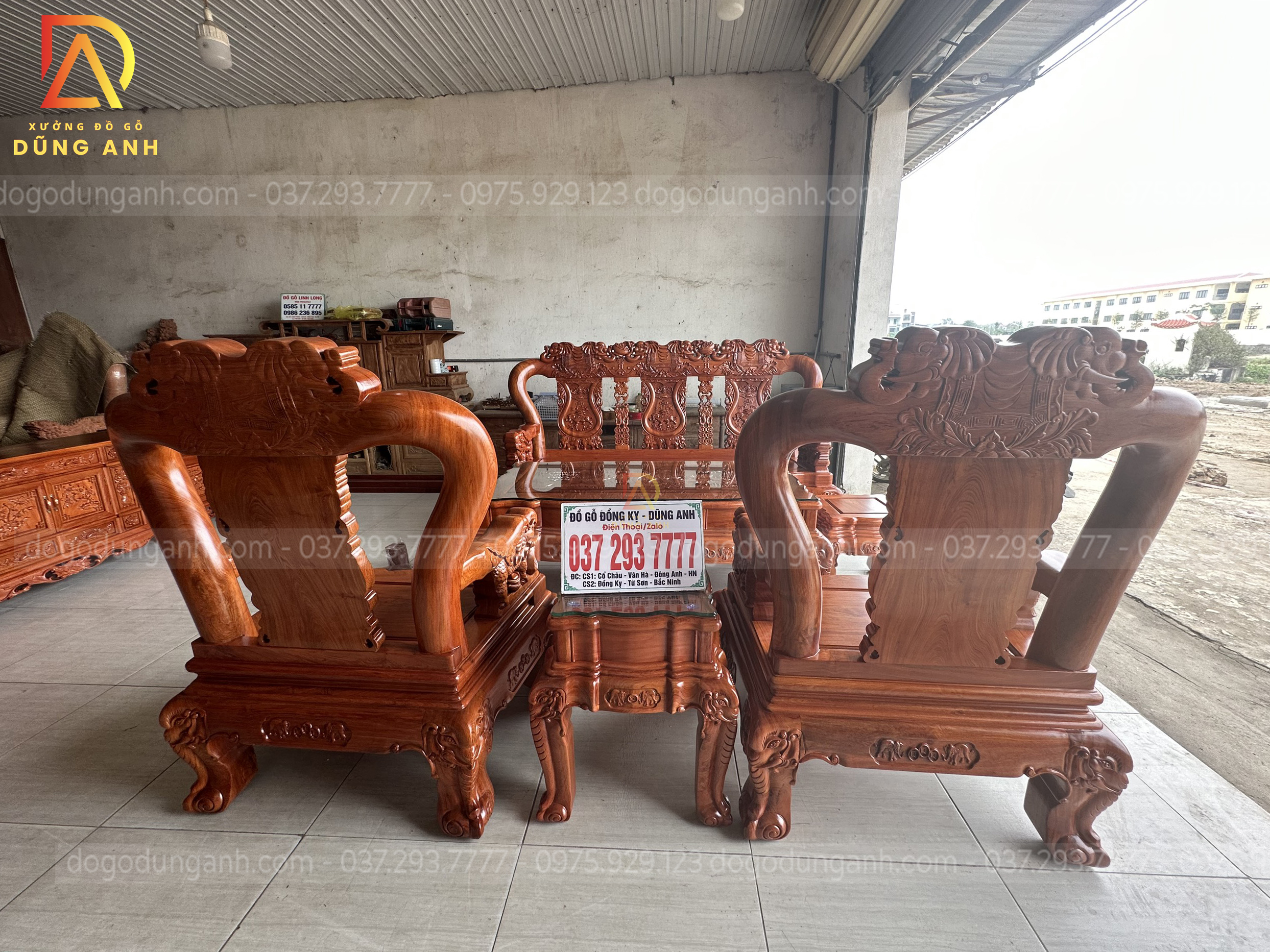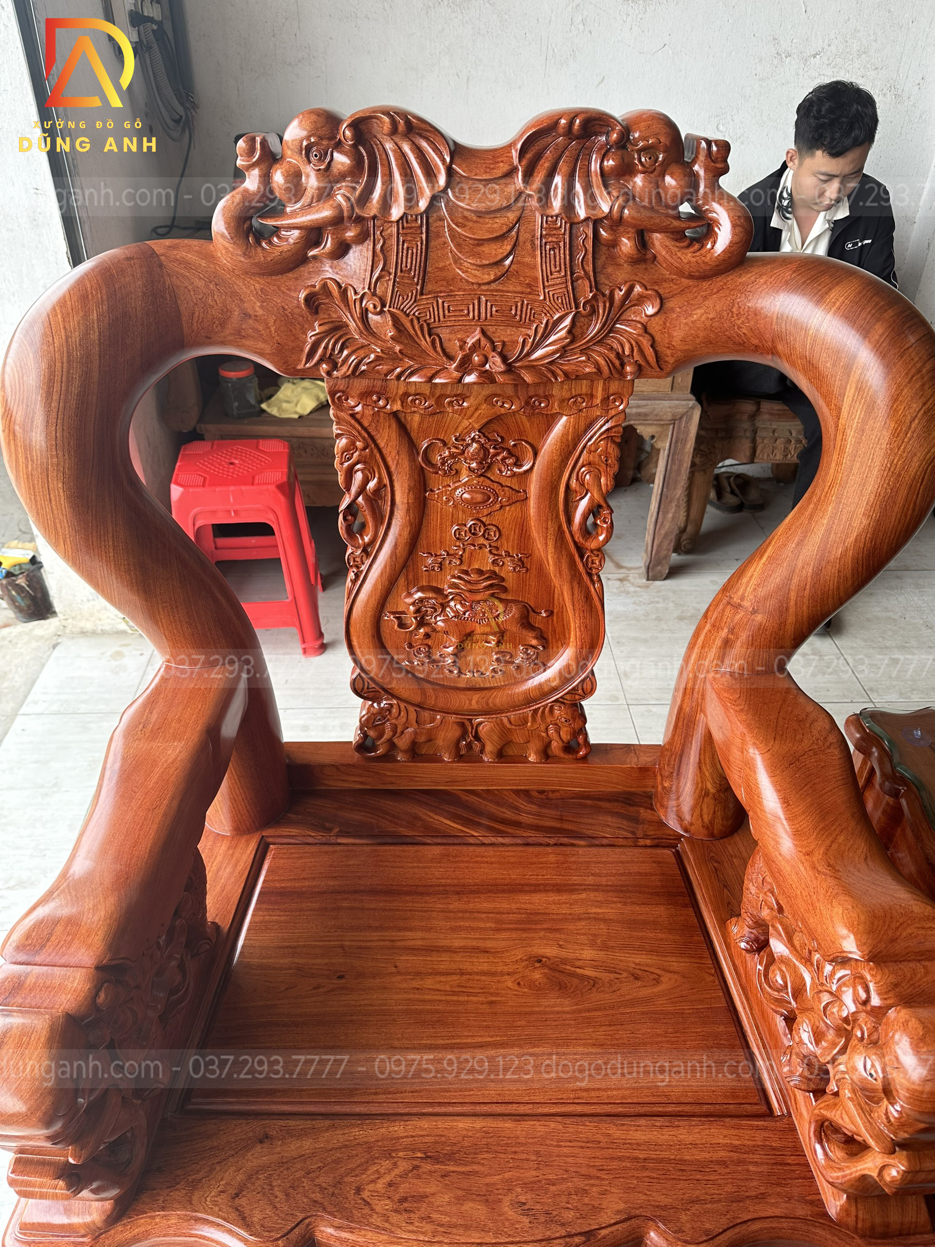 Bộ bàn ghế được hoàn thiện trau chuốt vô cùng tỉ mỉ với hình tượng voi chiến và sơn phủ bóng Pu gam màu nổi bật mang lại vẻ đẹp sang trọng mà ấm cúng cho không gian phòng khách. Xin mời quý vị cùng chiêm ngưỡng sản phẩm tạm trưng bày tại xưởng.