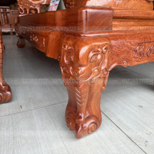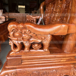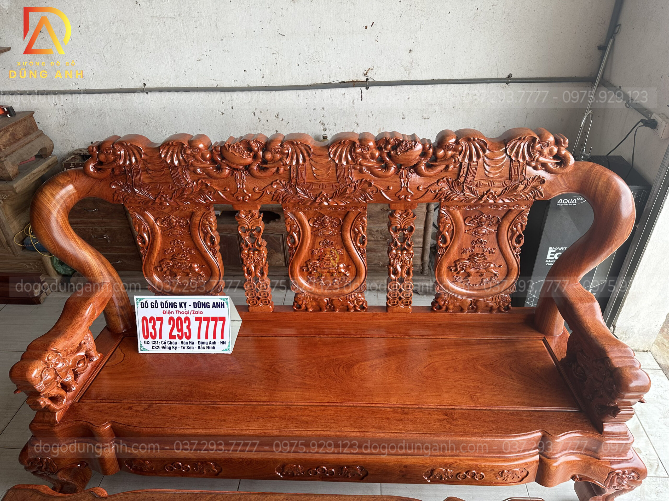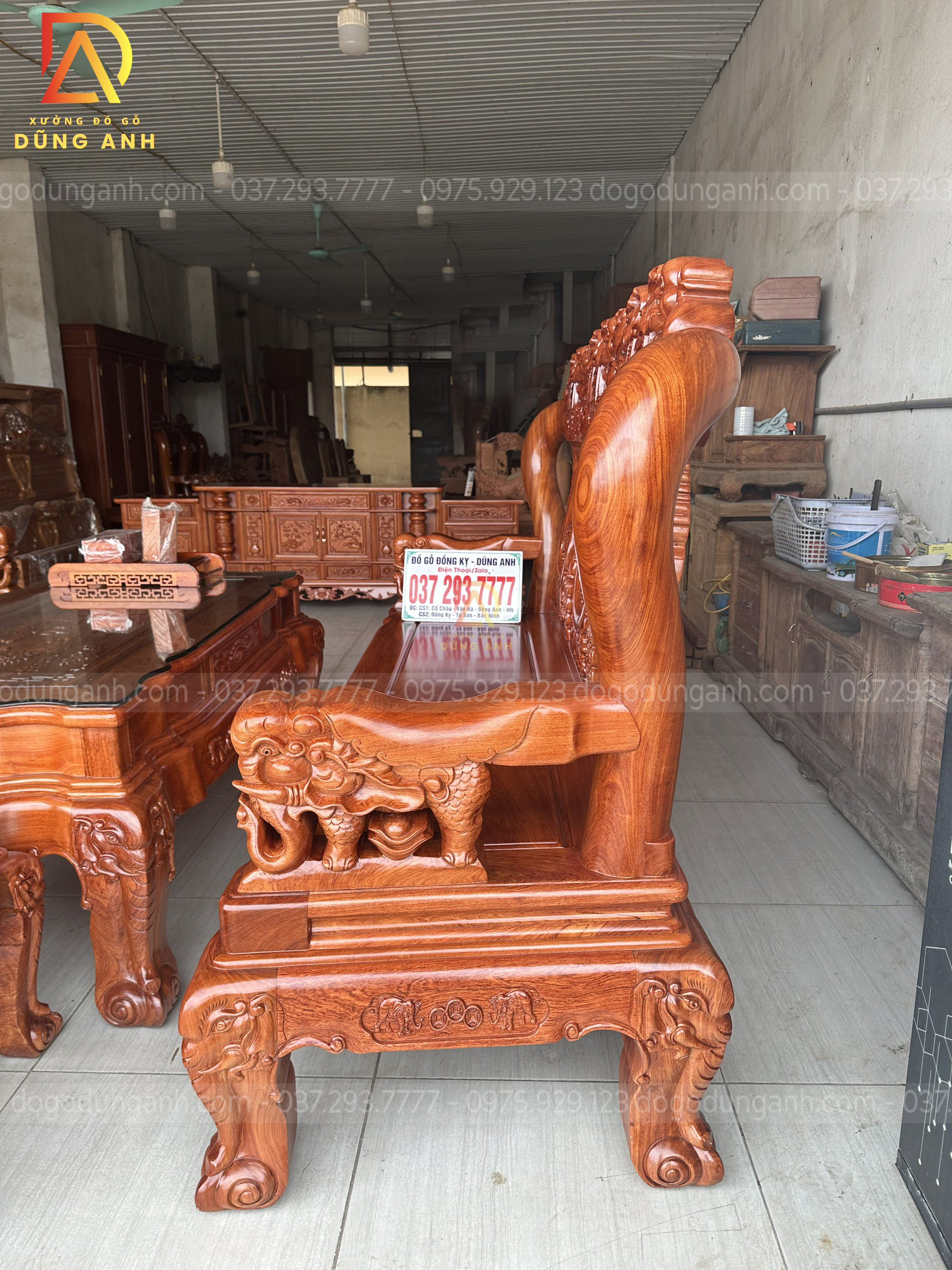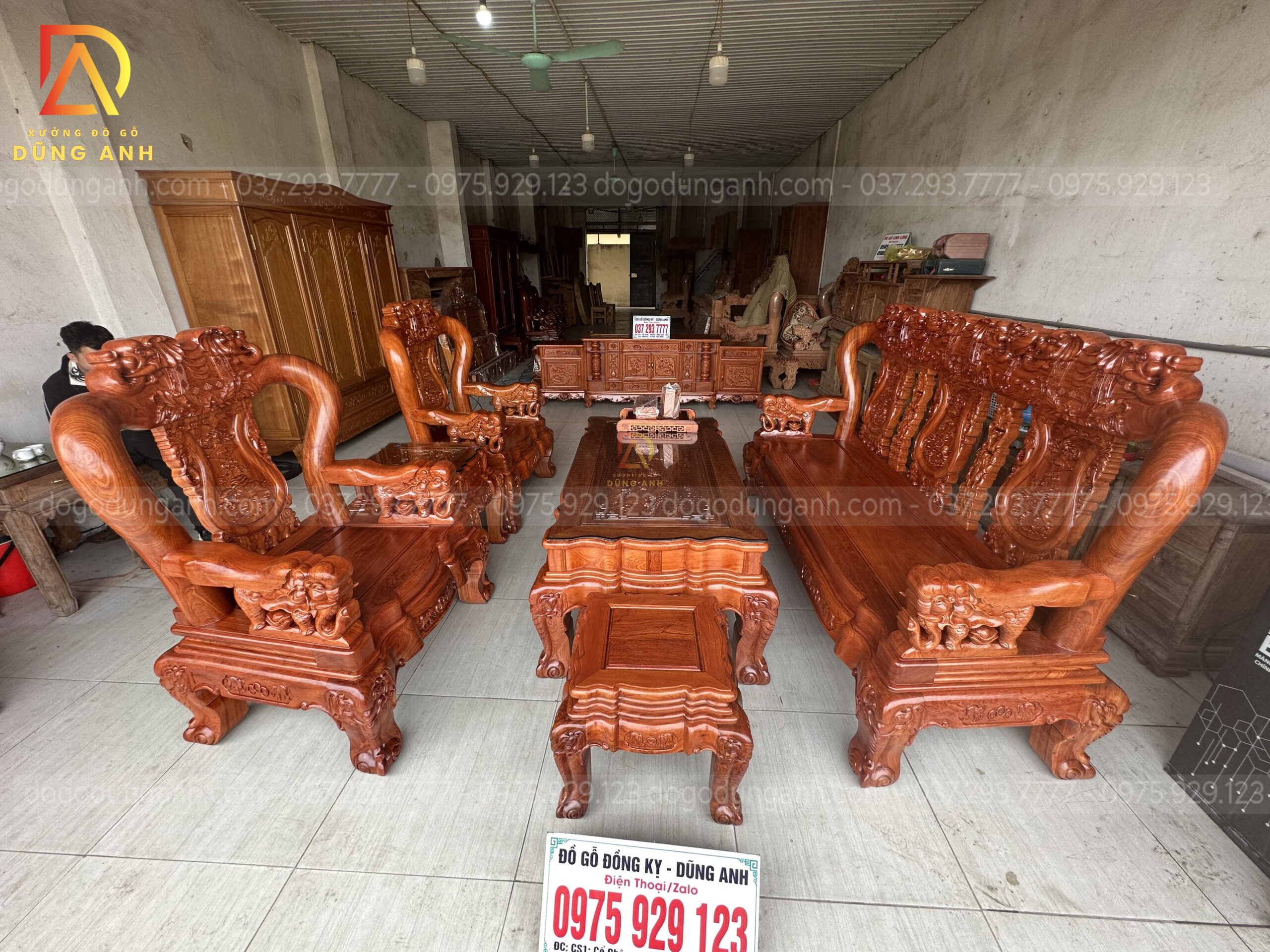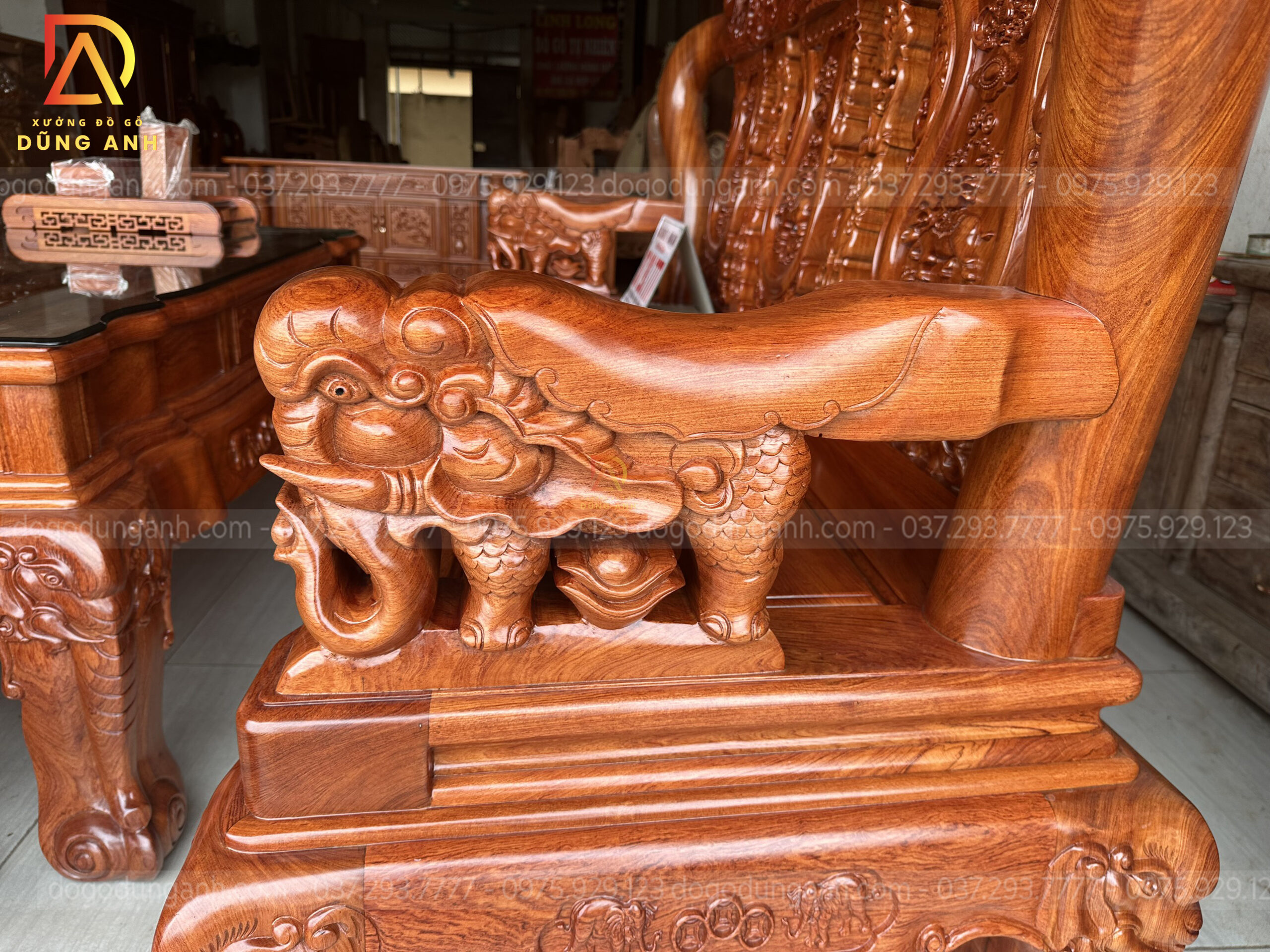 Bộ bàn ghế được hoàn thiện trau chuốt vô cùng tỉ mỉ với hình tượng voi chiến và sơn phủ bóng Pu gam màu nổi bật mang lại vẻ đẹp sang trọng mà ấm cúng cho không gian phòng khách. Xin mời quý vị cùng chiêm ngưỡng sản phẩm tạm trưng bày tại xưởng.