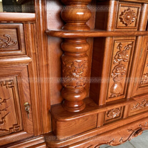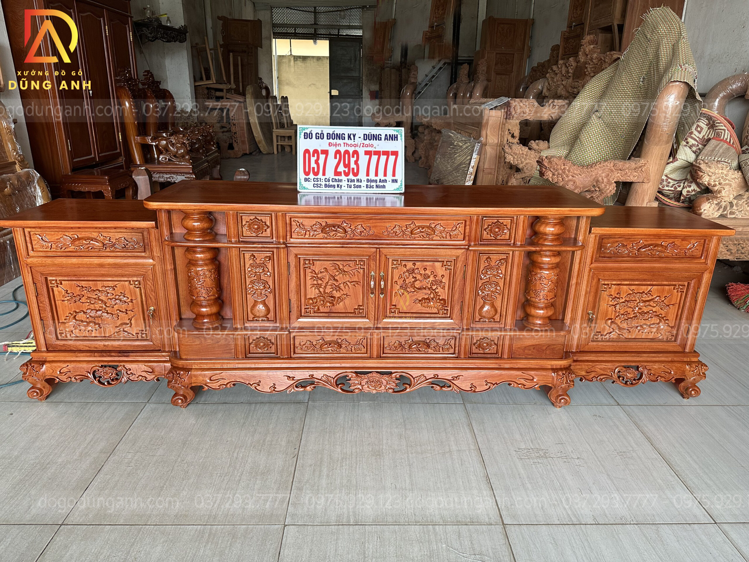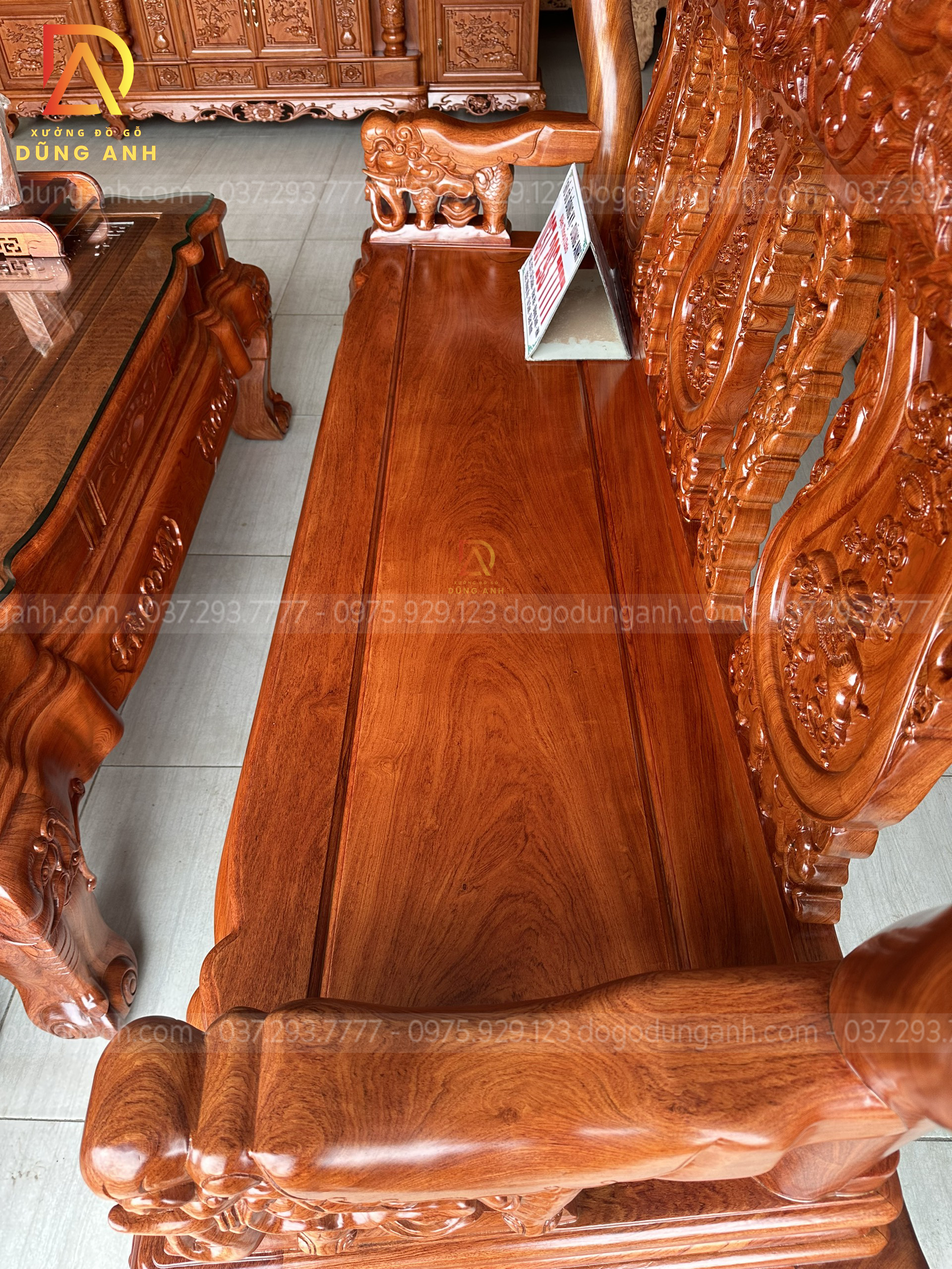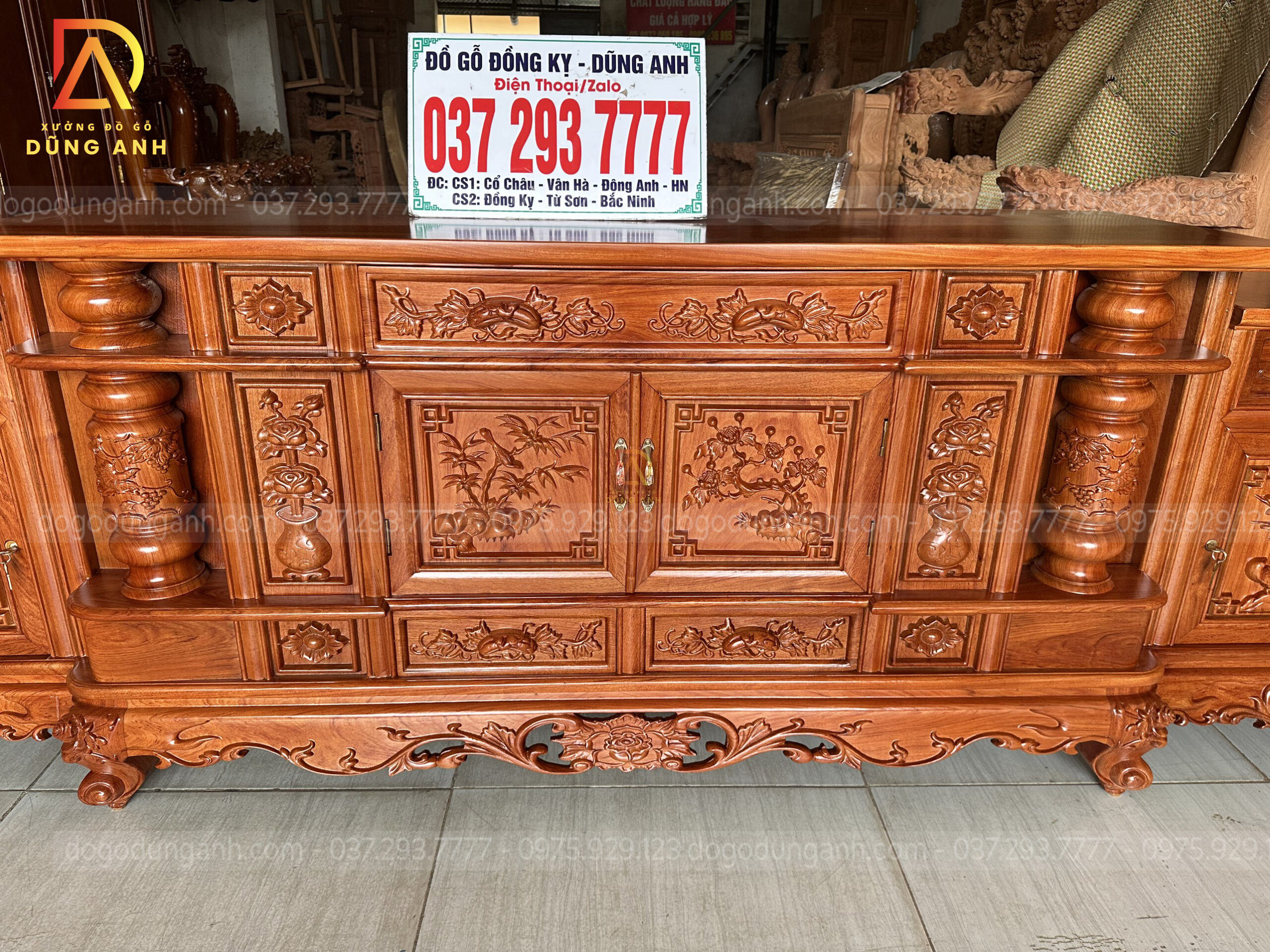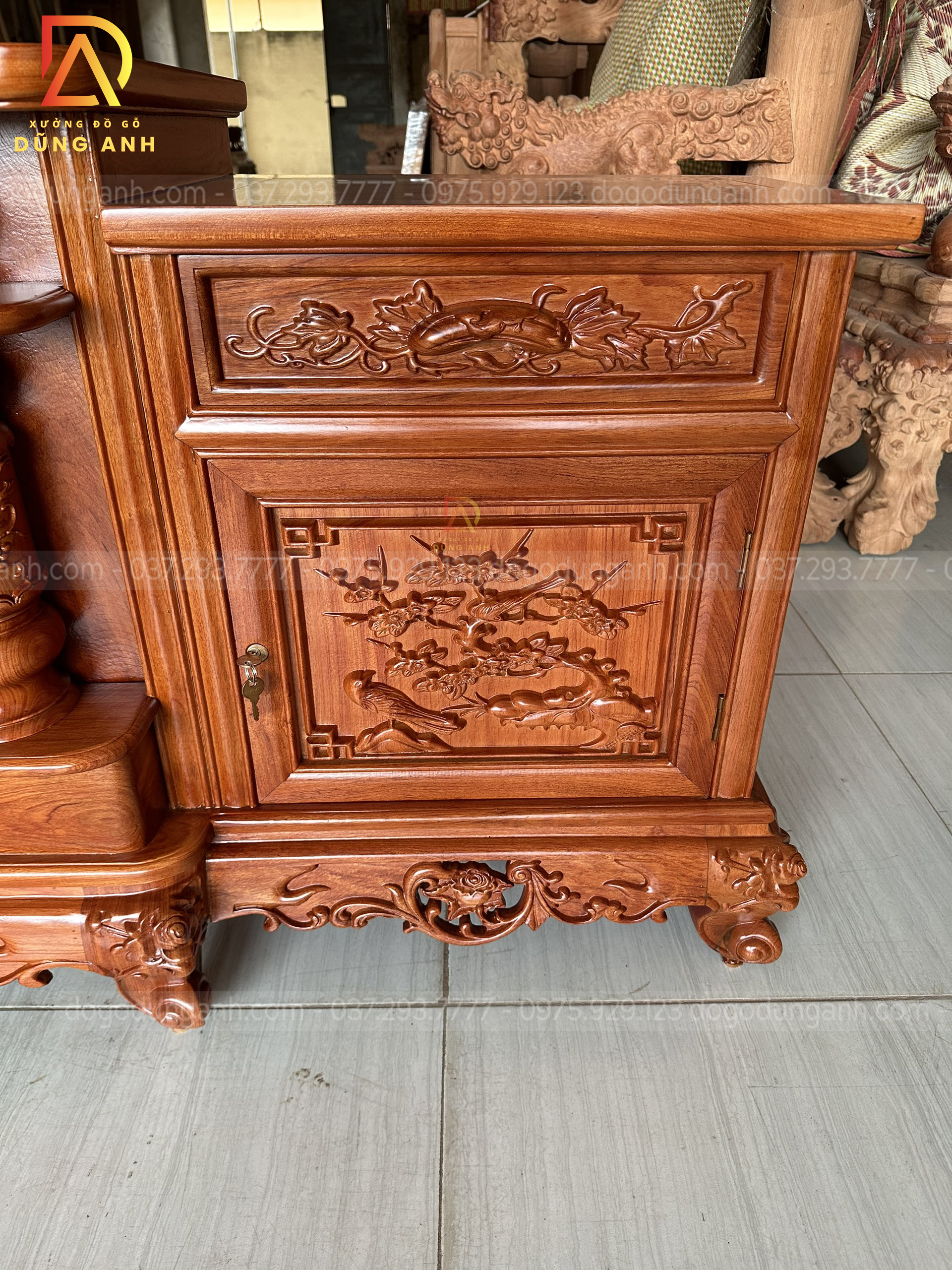 Bộ sản phẩm Xưởng đồ gỗ Dũng Anh bên em chế tác hoàn toàn từ 100% chất liệu gỗ hương đá dòng gỗ cao cấp chất lượng với giá thành khá đắt đỏ. Được xưởng chọn lọc kỹ càng nên đảm bảo độ đanh chắc hoàn hảo để tạo nên các họa tiết đục tinh xảo, nổi bật theo phong cách mới nhất năm 2024