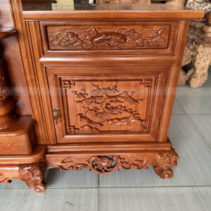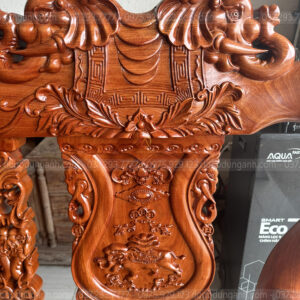 - Thiết kế cột nho đục họa tiết cầu kỳ, tinh xảo kết hợp cùng phần yếm kệ đục họa tiết hoa hồng lá tây uốn lượn đẹp mắt