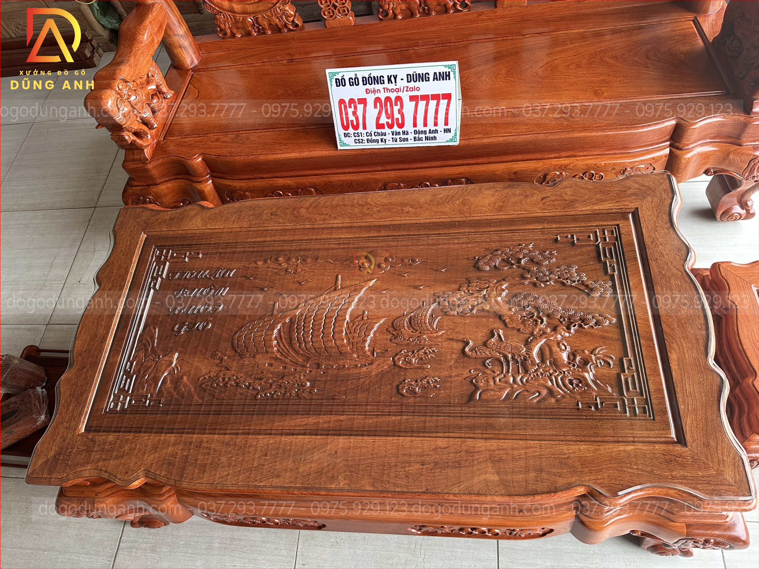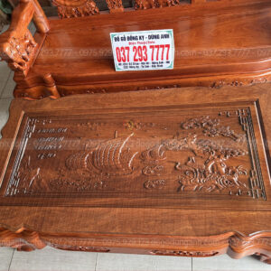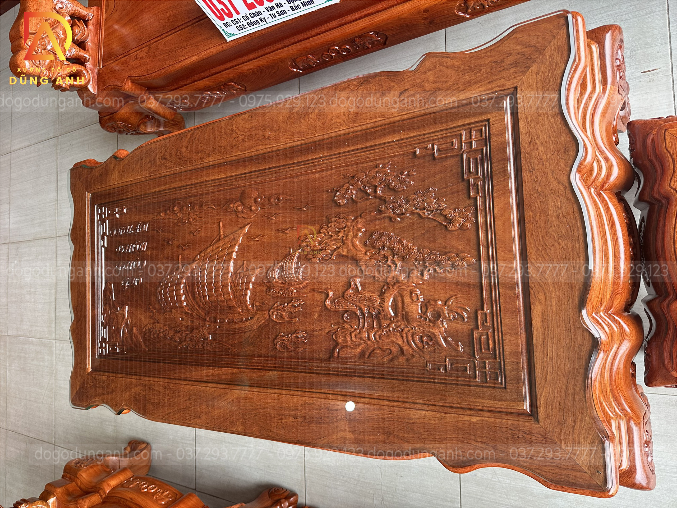 Mặt bàn khung tranh ván liền soi tứ diện đục hình tượng Thuận Buồn Xuôi Gios vô cùng sống động. Tất cả các chi tiết đều được đục sâu tạo độ sắc nét và chân thực cho hình tượng. Làm thành điểm nhấn nổi bật thu hút mọi ánh nhìn và còn mang một ý nghĩa tốt đẹp