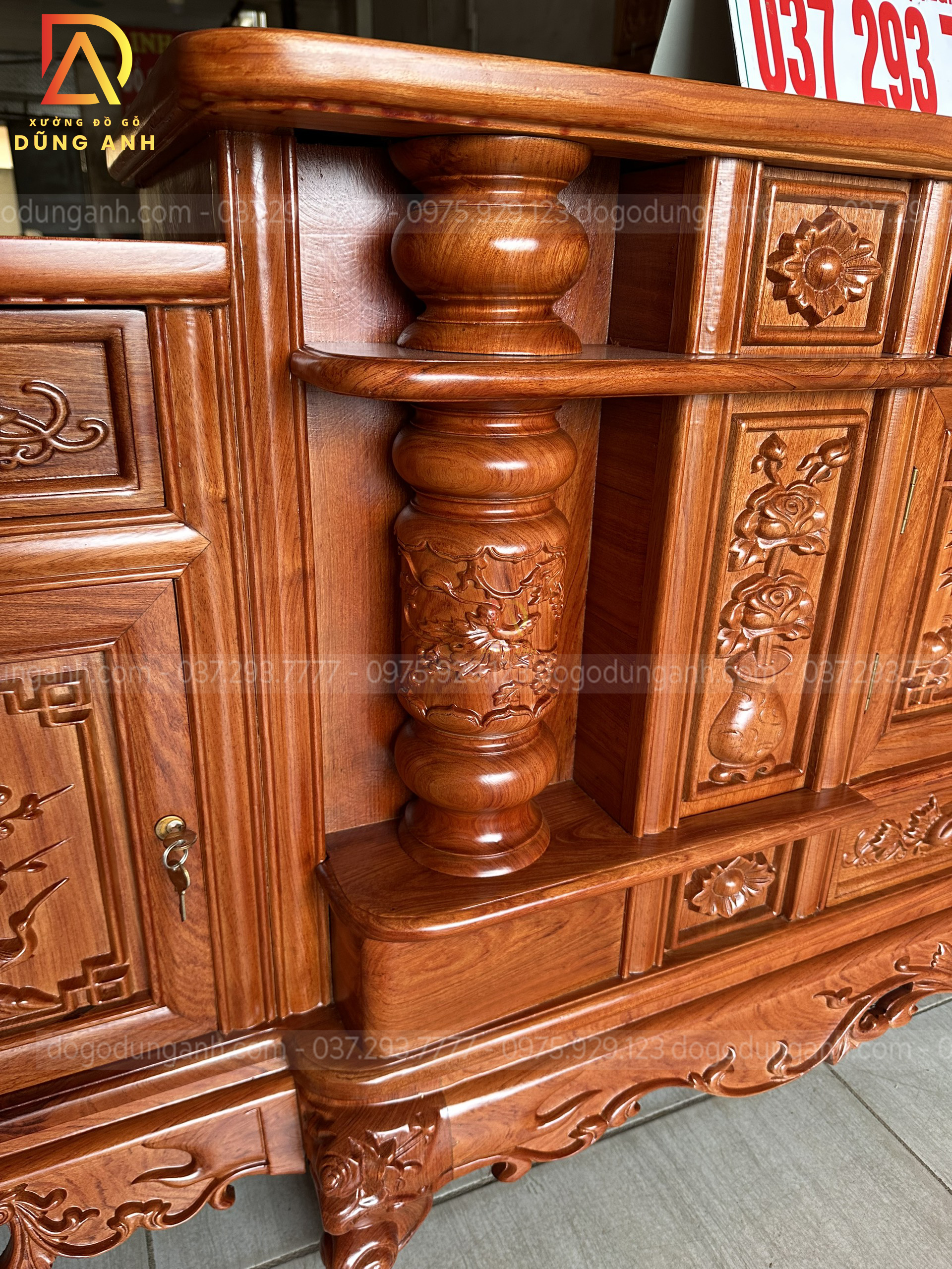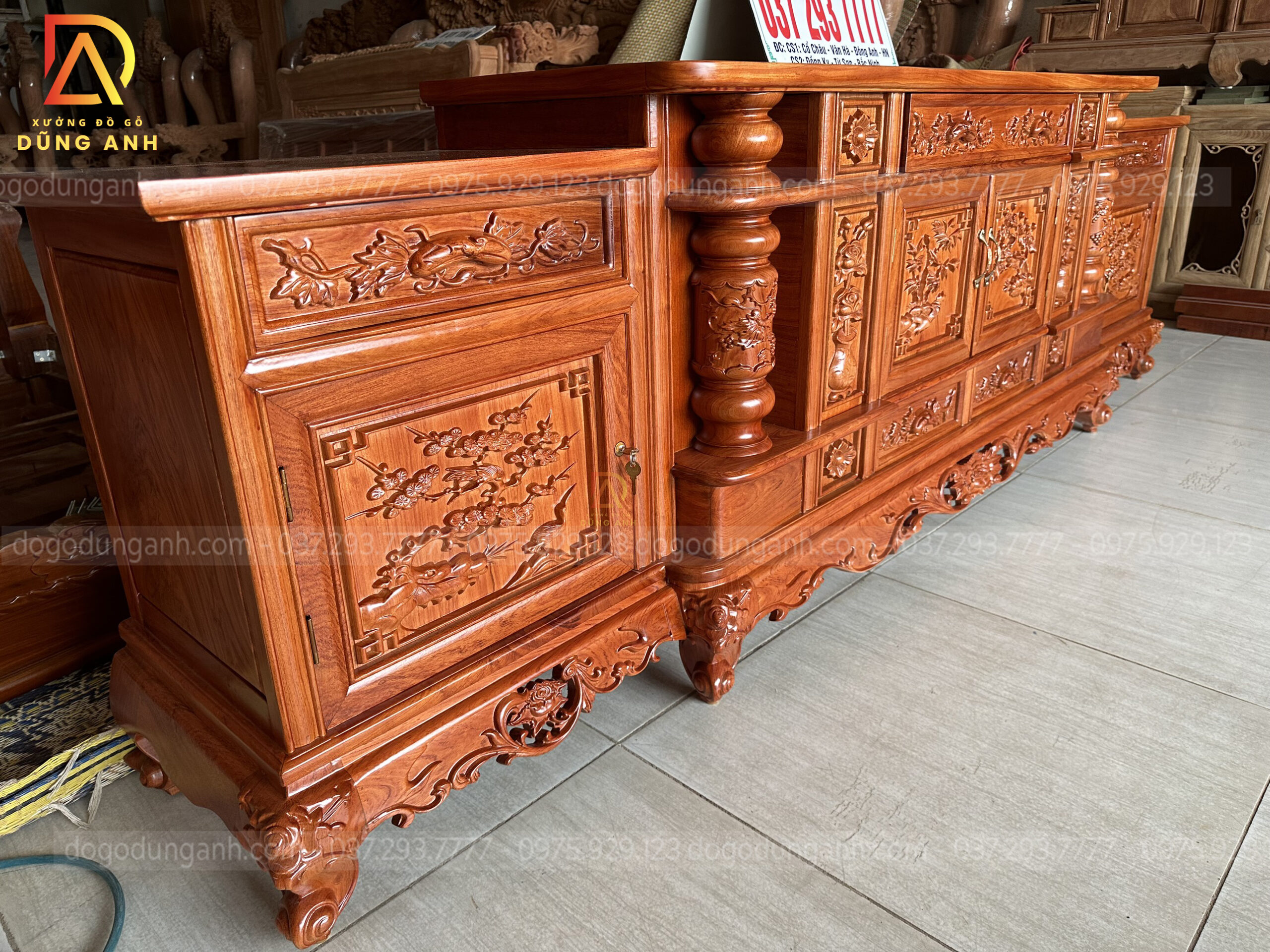 Kệ tivi cột nho được chế tác từ chất liệu gỗ Hương Đá dày dặn, đục tay tranh tứ quý sinh động
