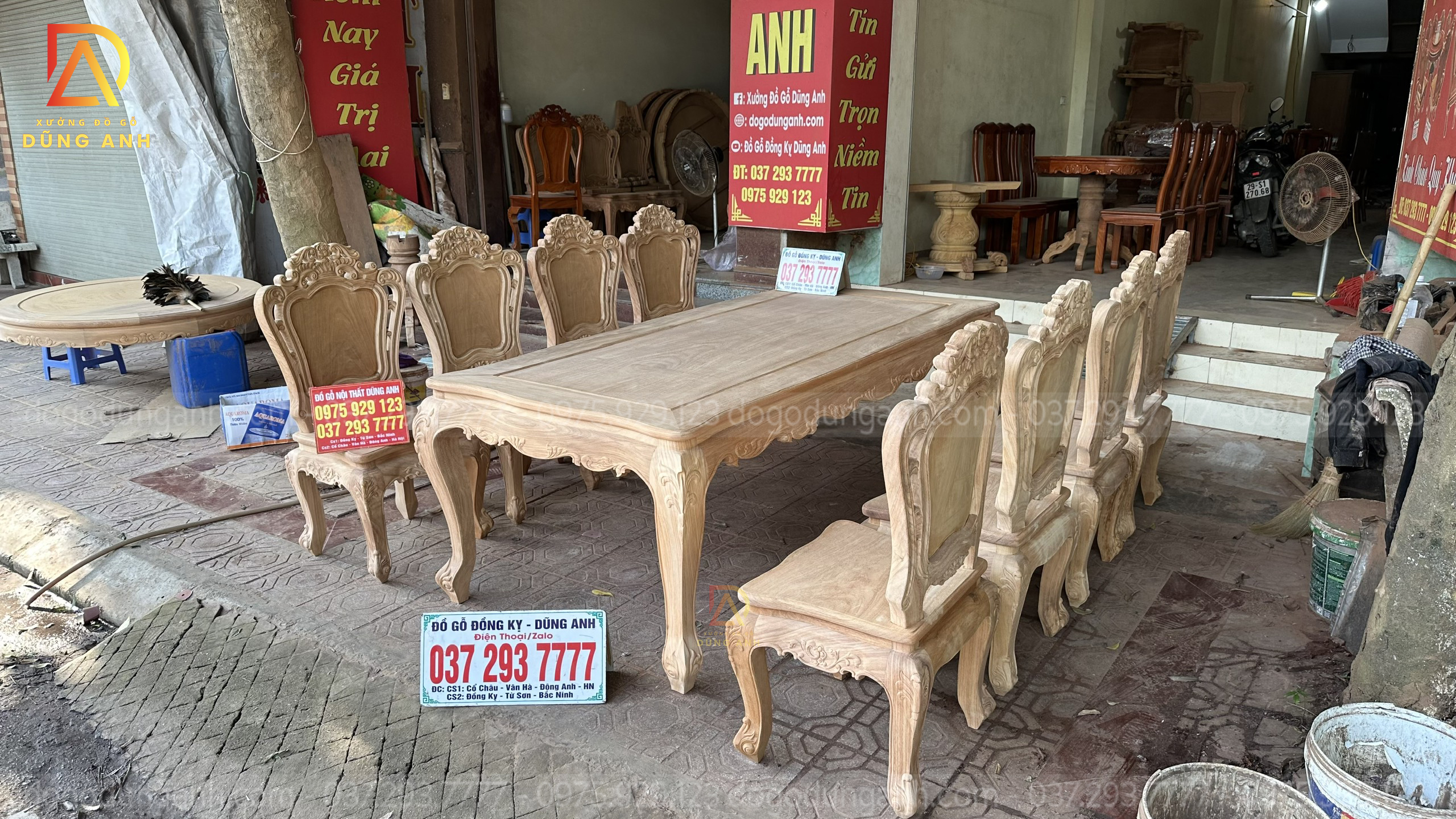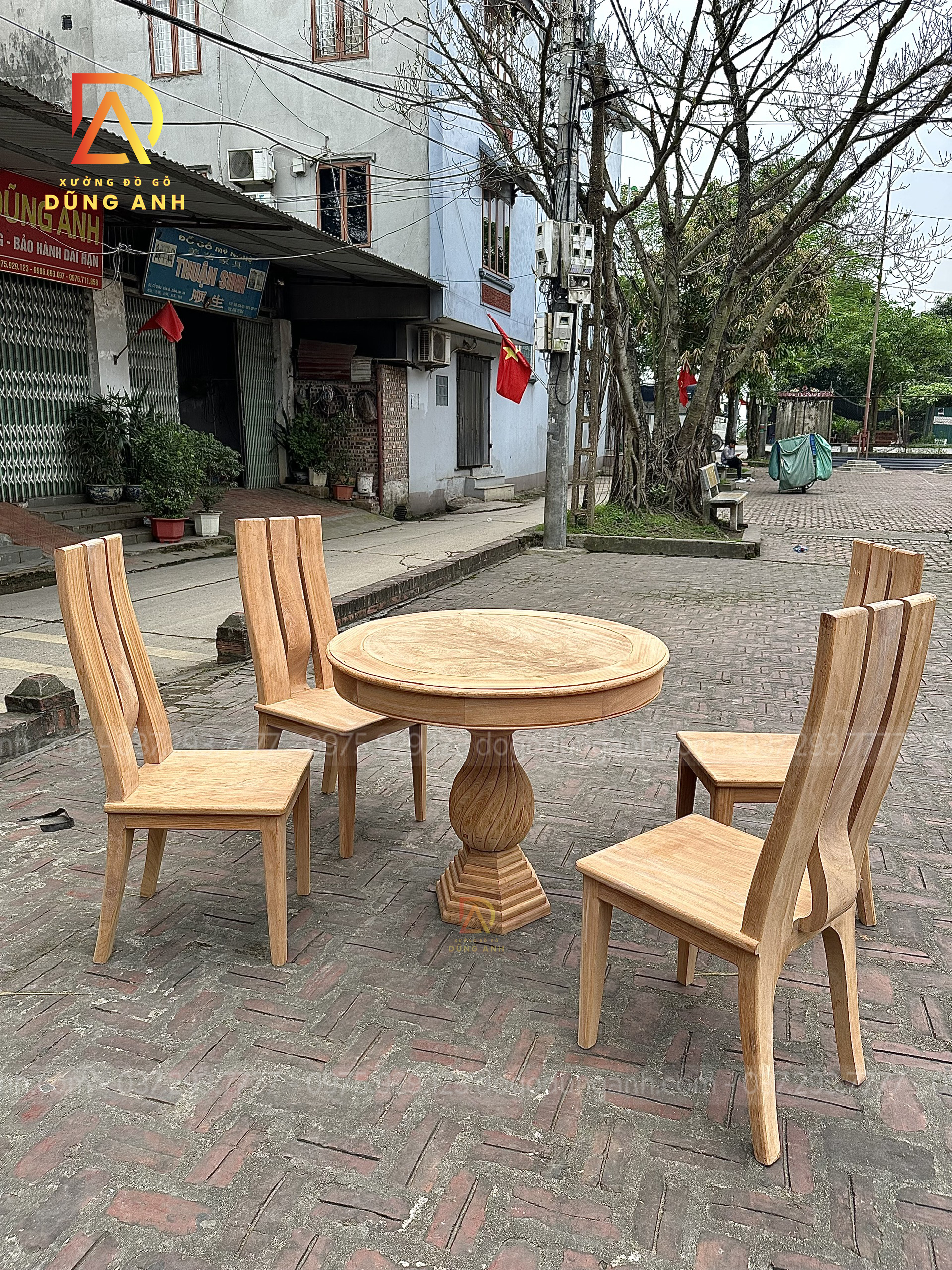 Bàn ghế ăn được làm từ gỗ tự nhiên có đặc tính mạnh mẽ và vẻ đẹp tự nhiên độc đáo. Bề mặt bàn được làm mịn màng và đẹp tự nhiên, tạo ra một không gian ăn ấm áp và sang trọng. Với kích thước vừa phải, bàn có thể chứa được 4 đến 6 ghế, phù hợp cho các buổi ăn gia đình hoặc tiếp khách.Thiết kế của bàn đơn giản và mạnh mẽ, nhưng vẫn mang đến sự tinh tế và hiện đại. Các cạnh của bàn có thể được làm tròn hoặc vuông, tùy thuộc vào sở thích cá nhân và phong cách trang trí của bạn.