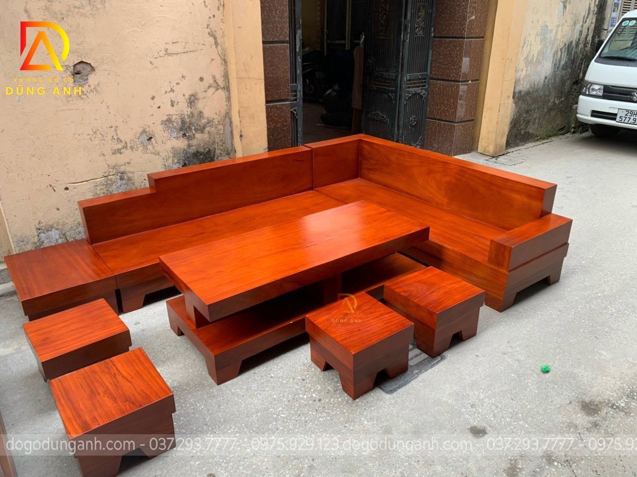 Bộ sản phẩm sofa phòng khách chữ L chất liệu gỗ Gõ Đỏ Cao cấp